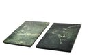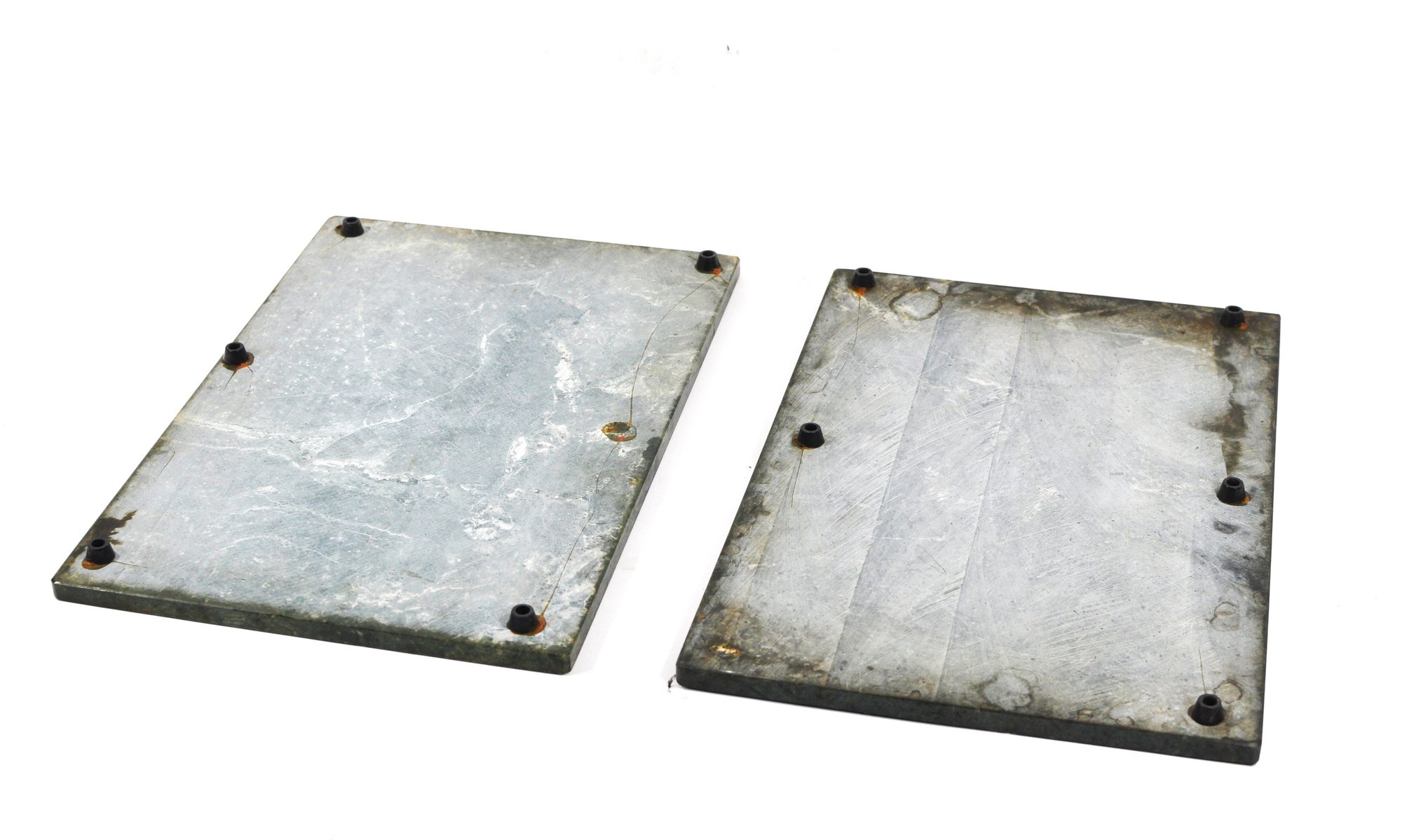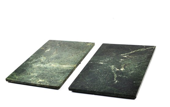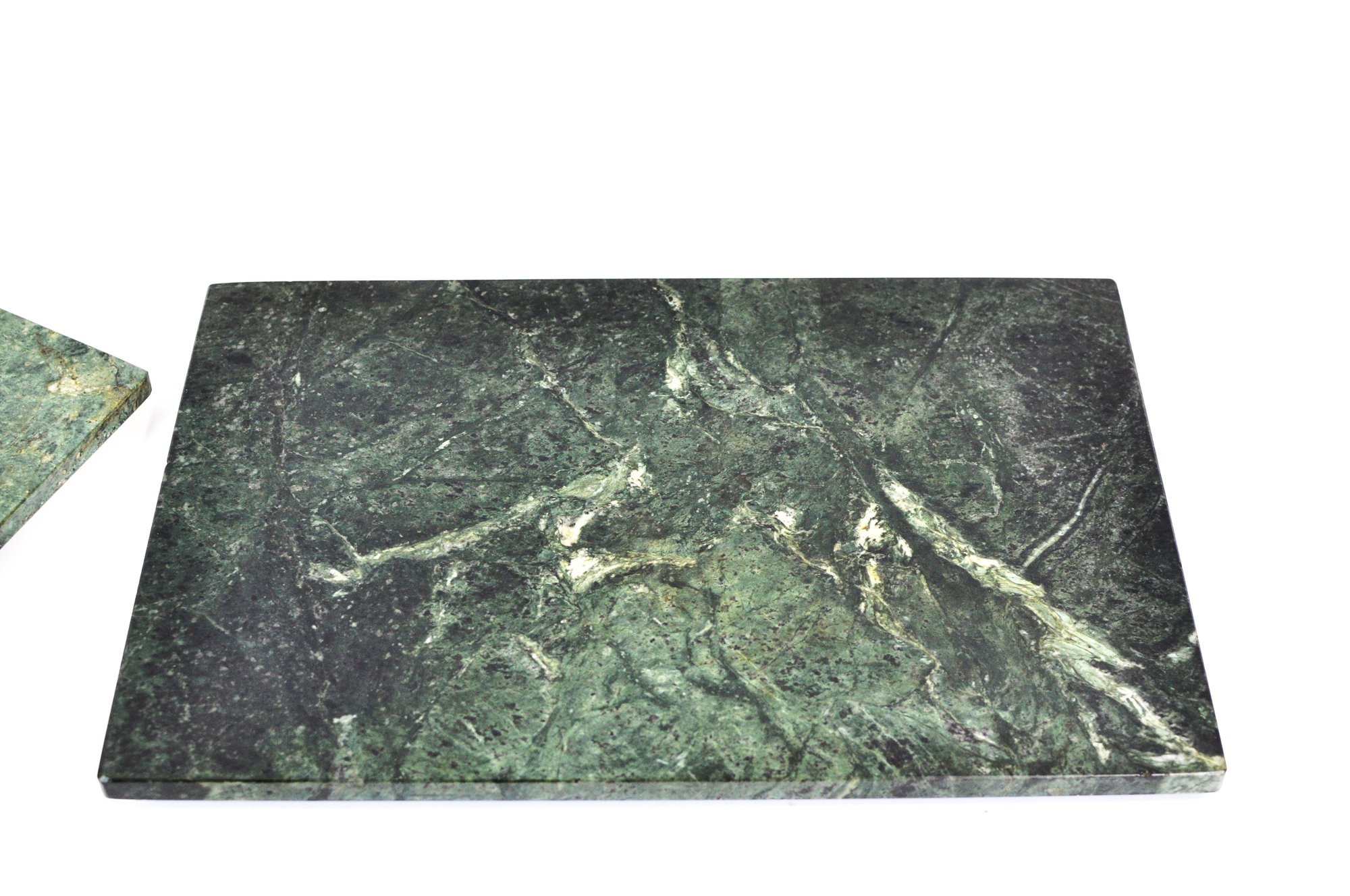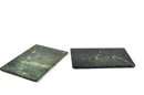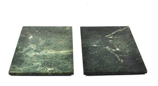 Nice pair of vintage square green marble stone trivets or large coasters with natural veining in dark green, gray, and white tones. Each piece is fitted with small rubber feet on the underside to protect table surfaces. Suitable for hot dishes, plant stands, or decorative display.