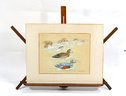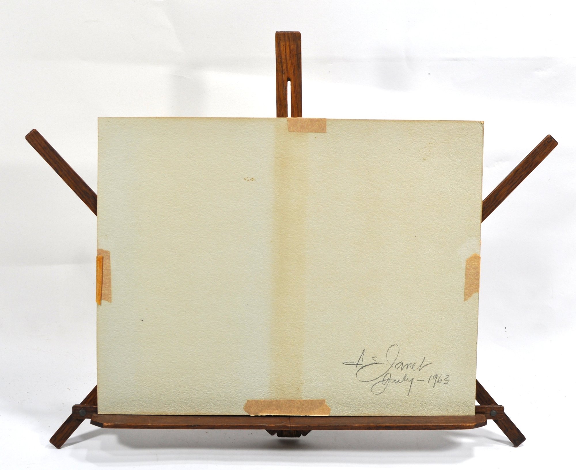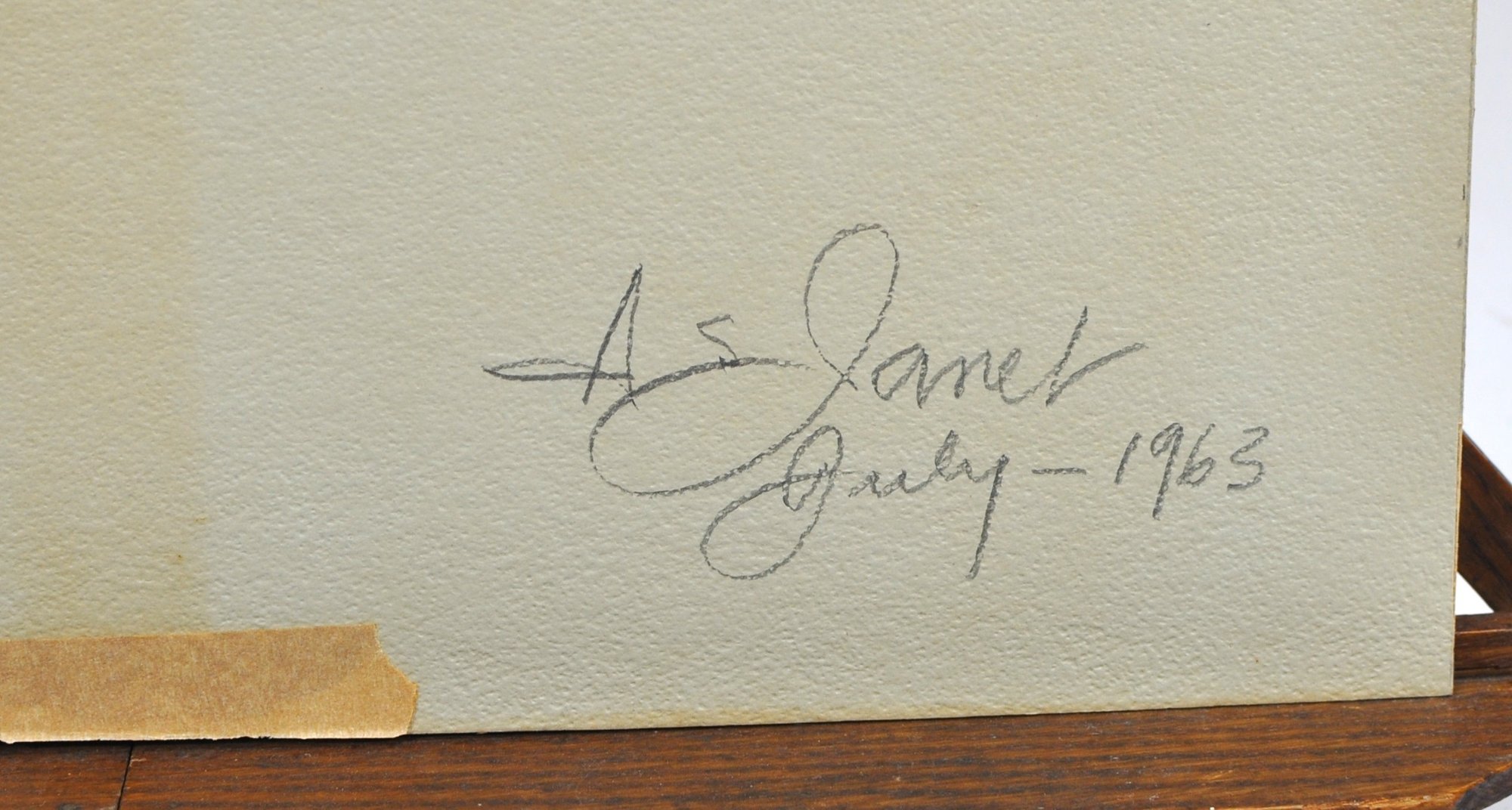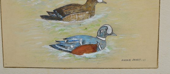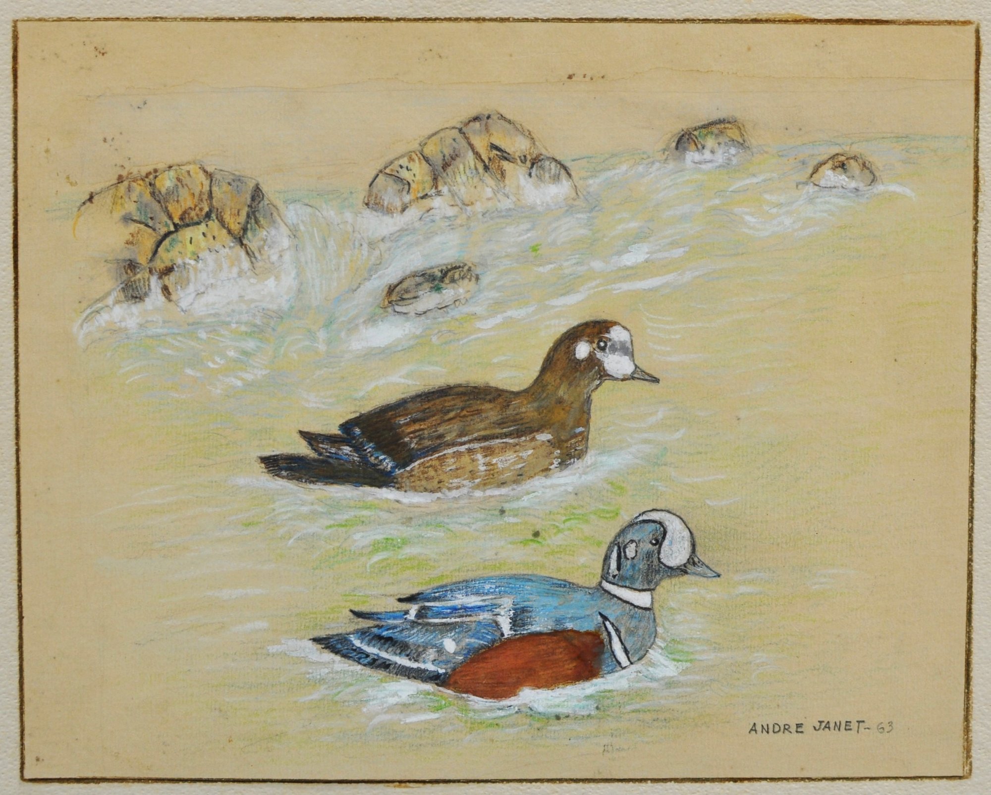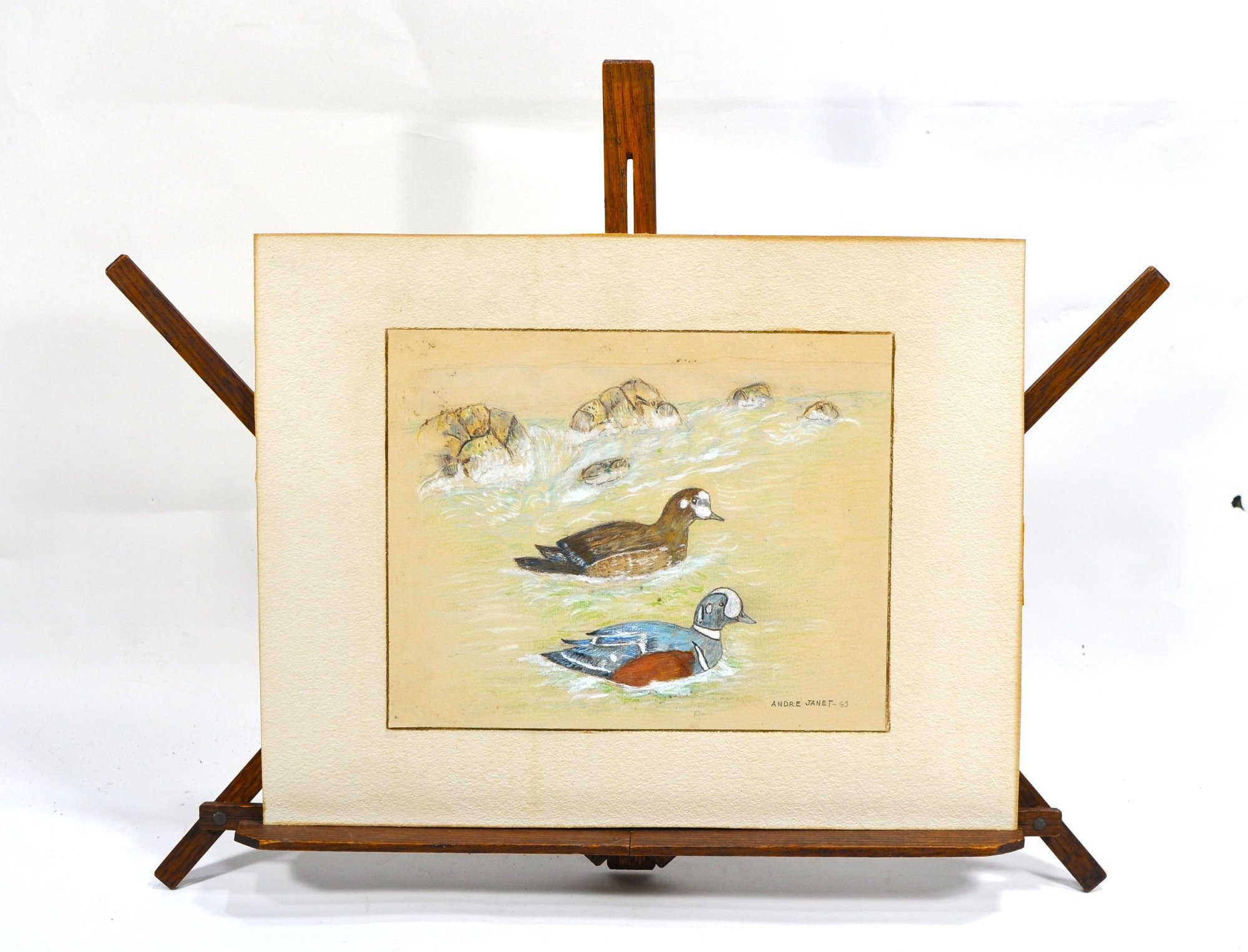 Original watercolor and gouache on paper depicting two ducks swimming in a shallow stream with rocks and flowing water behind. Nicely observed wildlife study with soft tonal washes and delicate line work. Signed lower right “Andre Janet – 63” and additionally signed and dated on verso July 1963.