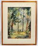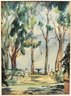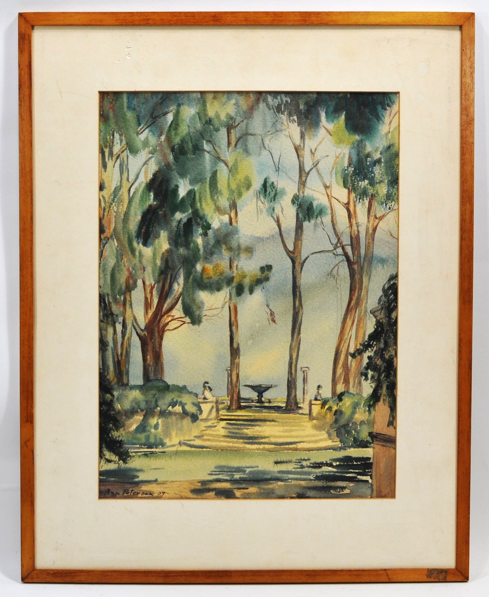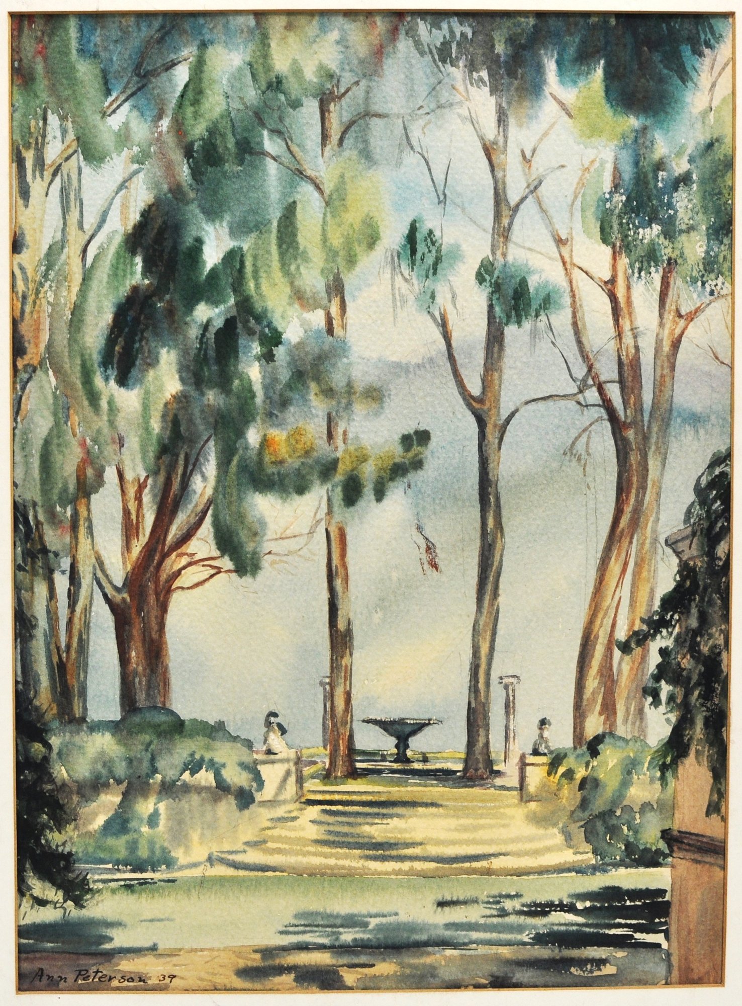 Charming vintage watercolor painting depicting a formal garden scene with tall trees, a central fountain, and distant landscape beyond. Signed lower left “Ann Peterson ’39,” indicating a 1939 date. The composition features loose, impressionistic brushwork with soft greens, blues, and warm earth tones, capturing dappled light and depth through the trees.