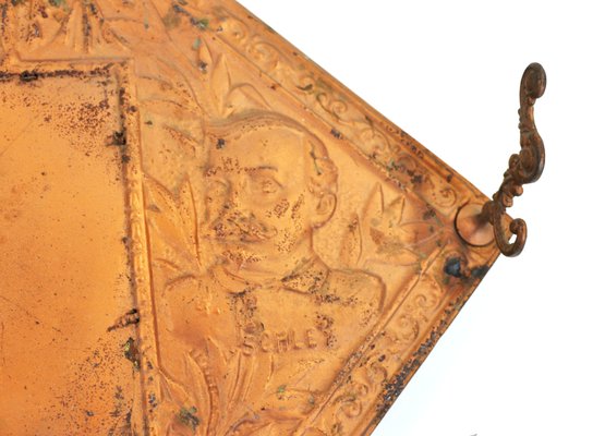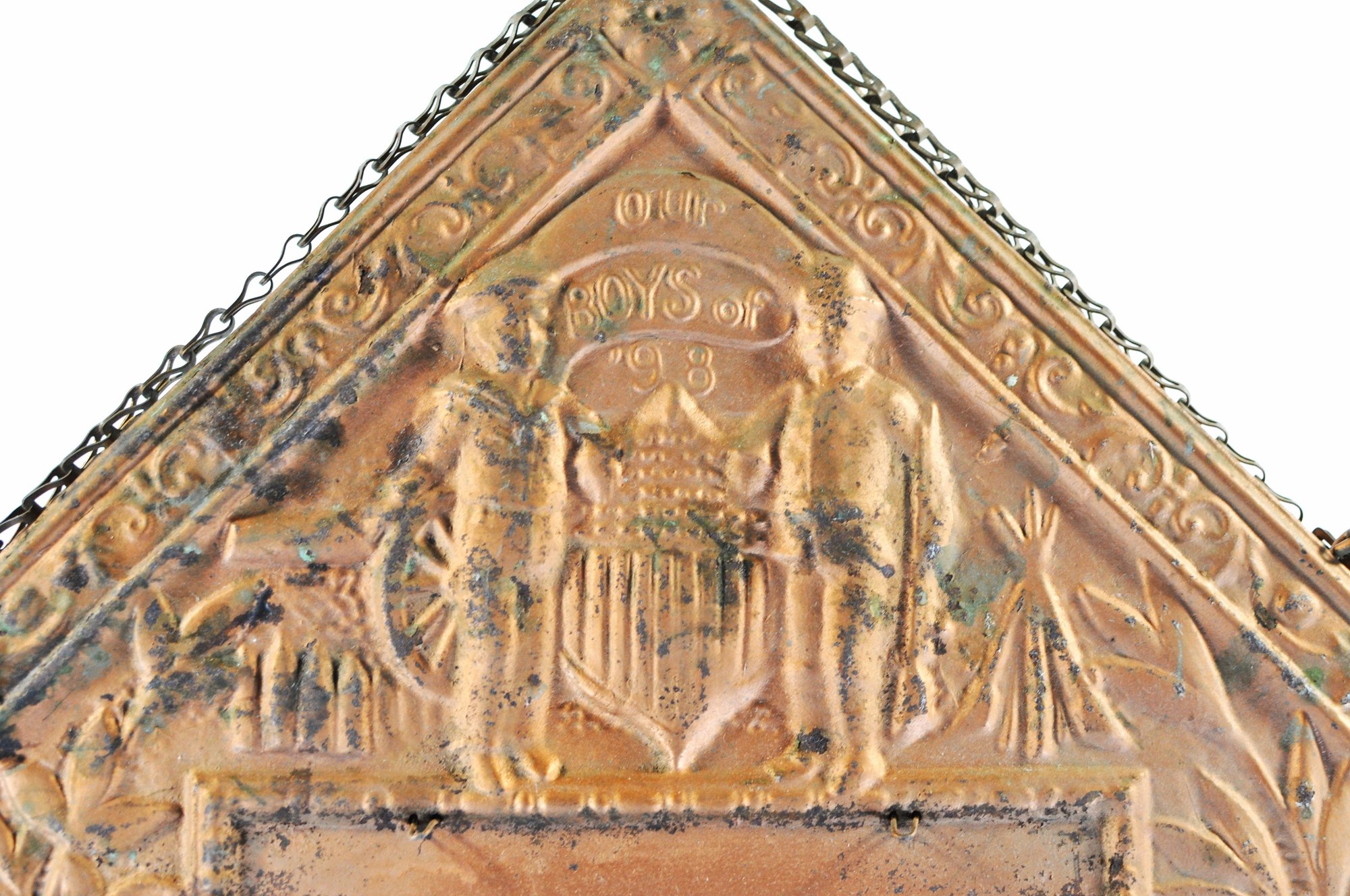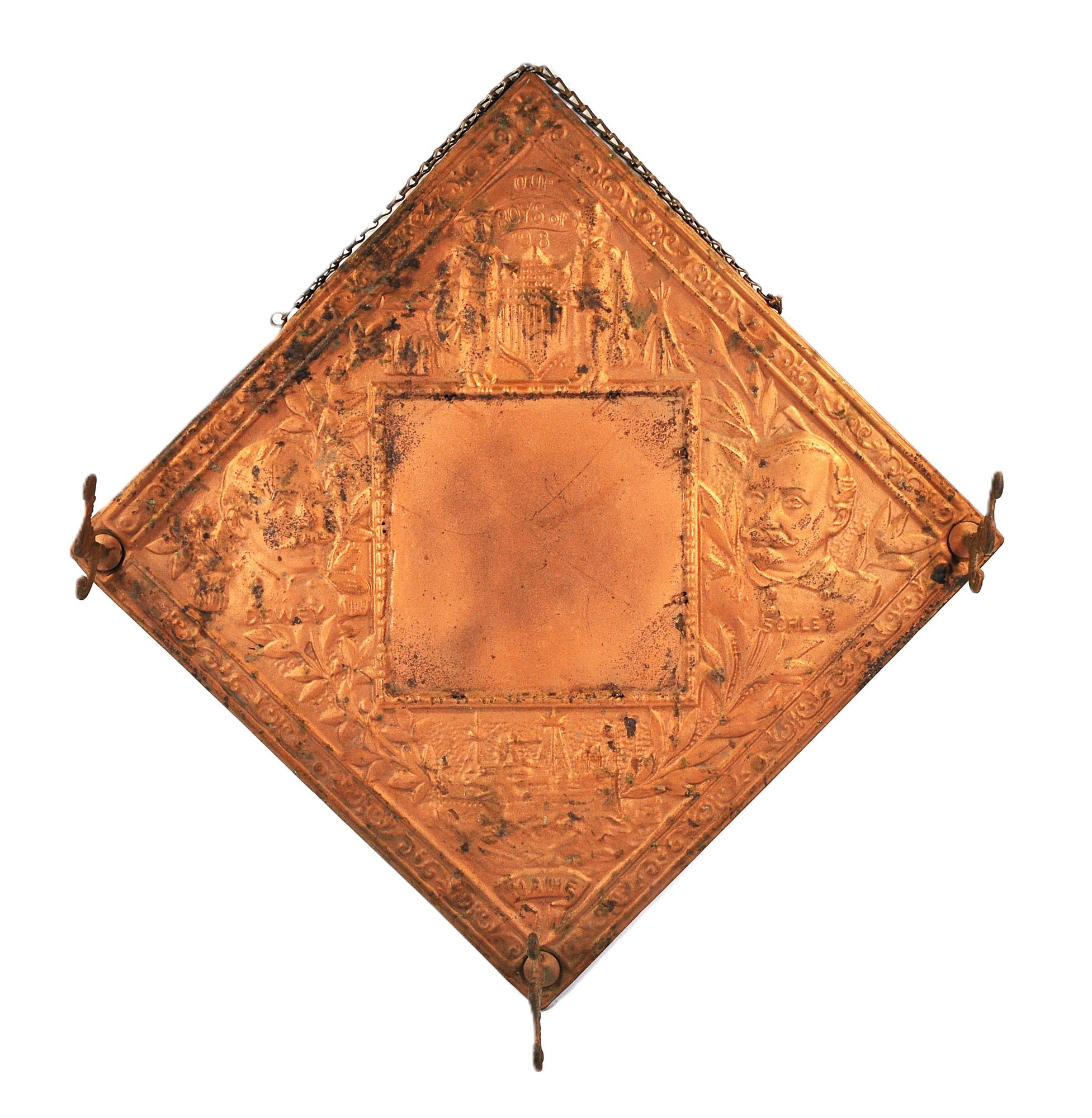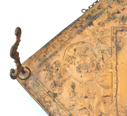 Antique "Our Boys" embossed mirror/wall rack commemorating the Spanish-American War of 1898, featuring raised portraits labeled “Dewey” and “Schley” flanking a U.S. eagle and shield motif. Decorative scrolling border and original hanging chain with three small brass hooks for keys, pipes, or small items.