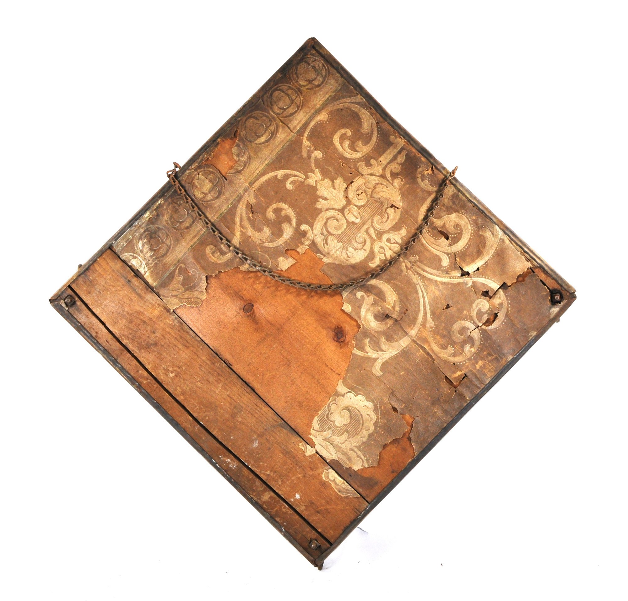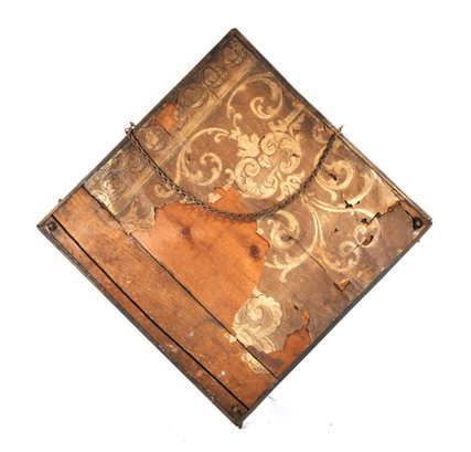 Back shows original wood support with remnants of old wallpaper. Has a hanging chain.