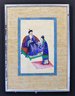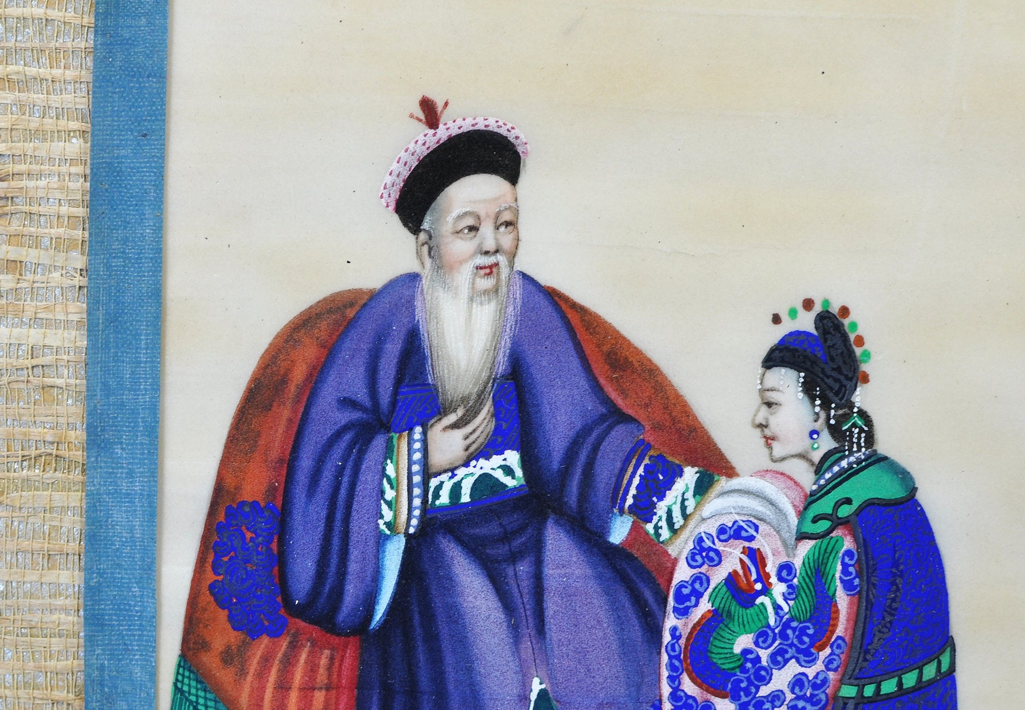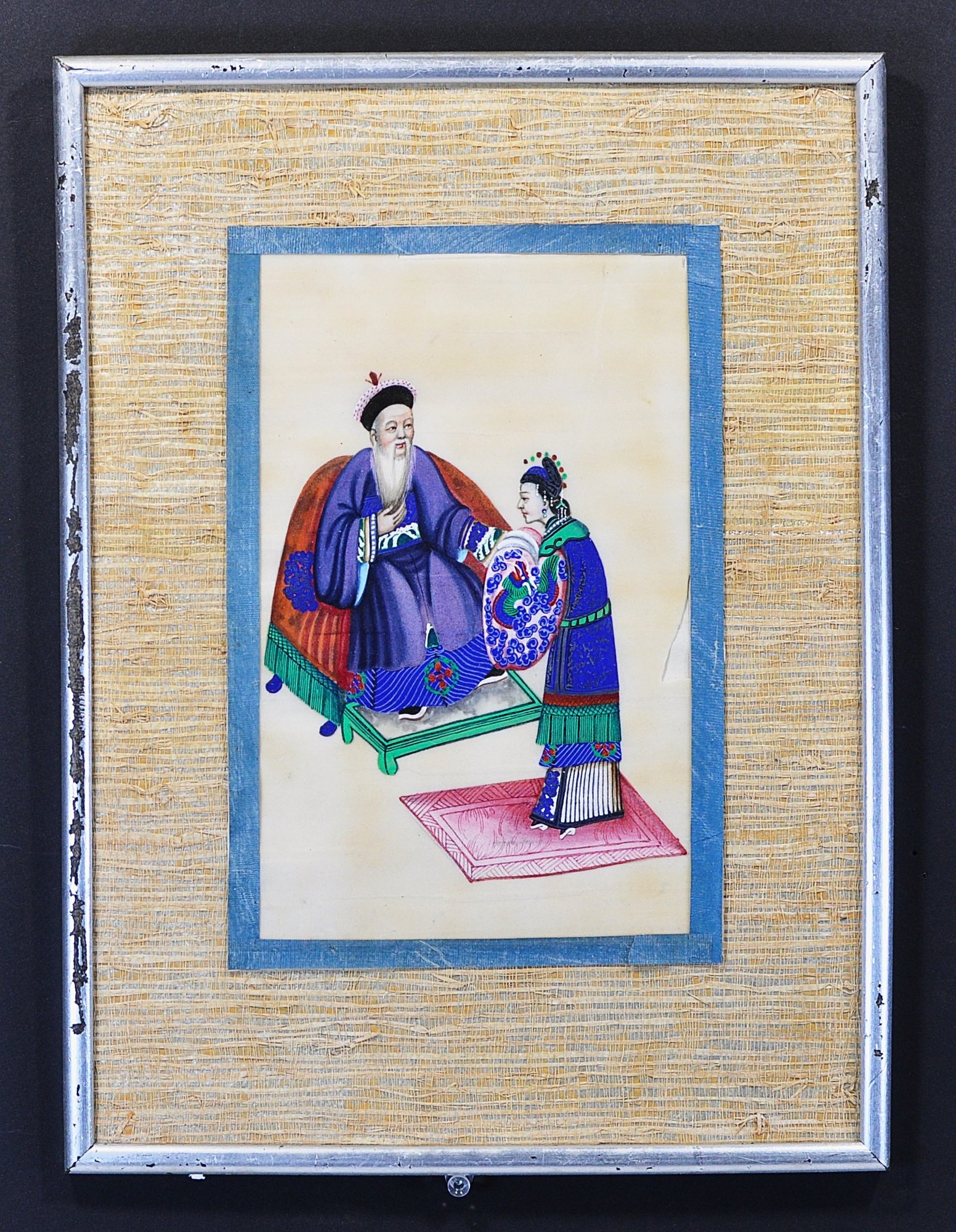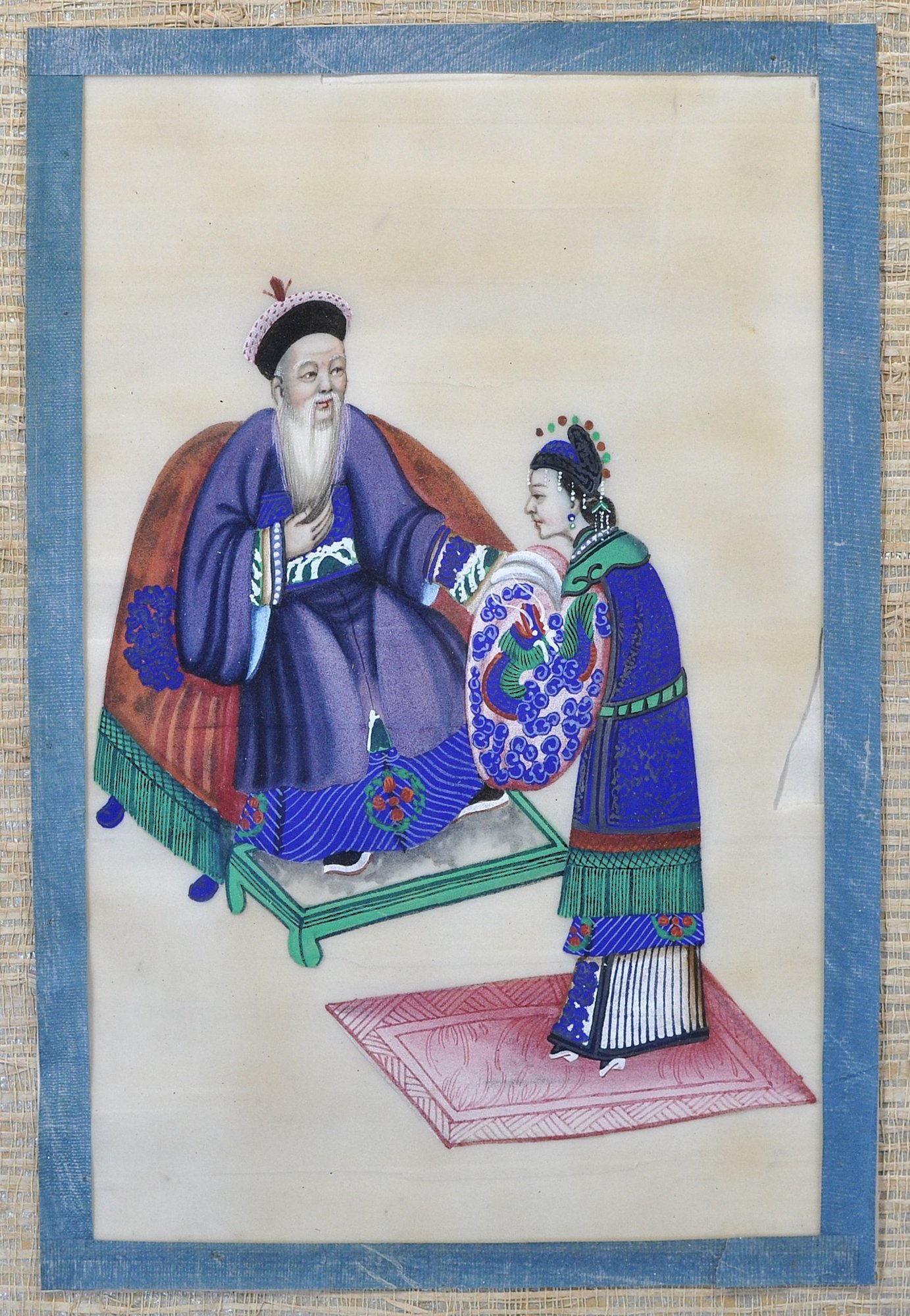 Offered is an antique 19th-century Chinese Export gouache painting on pith paper, likely from the Canton school, depicting a seated dignitary or mandarin attended by a court figure presenting an embroidered fan.