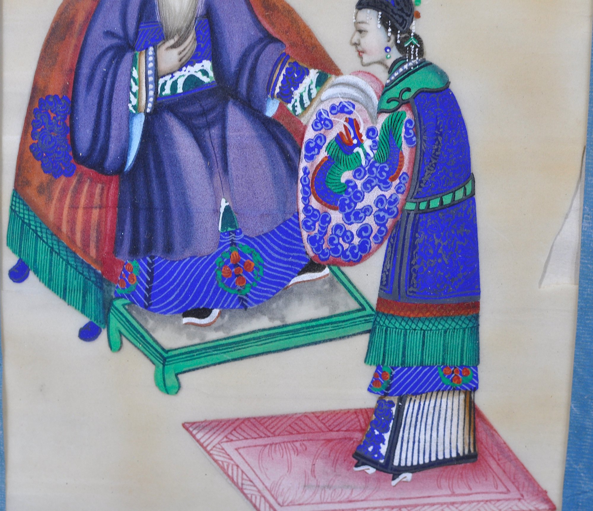 Executed in bright mineral pigments with fine detailing typical of export works produced for the Western market during the Qing dynasty period. Mounted with woven mat in a later frame.