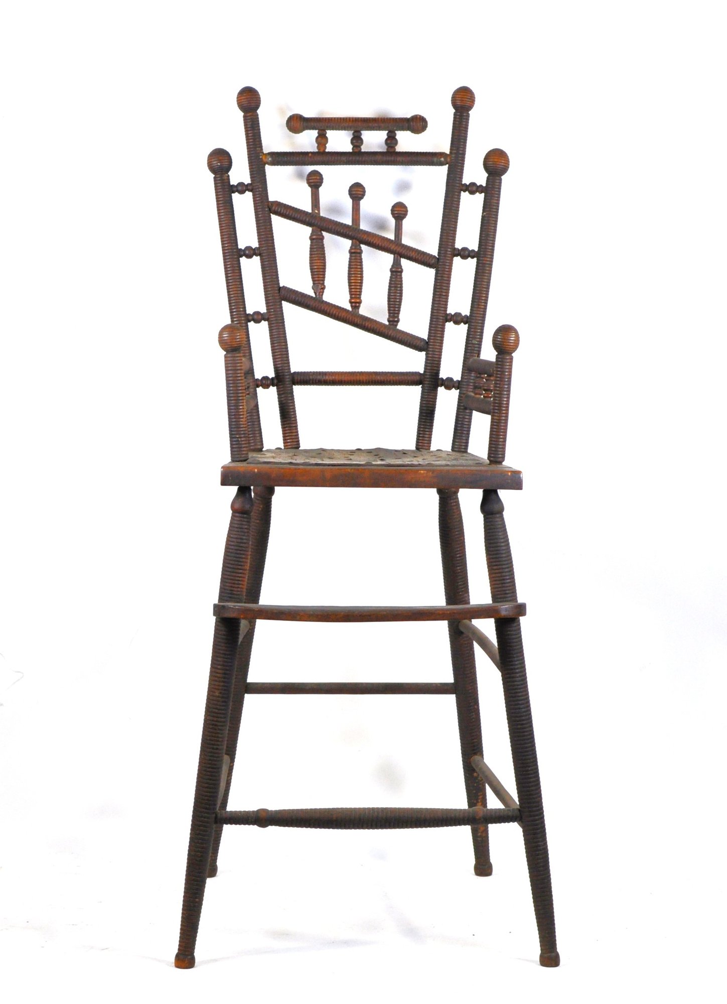 An excellent example of Victorian-era craftsmanship, blending playful design and functionality with sculptural appeal. The tall, narrow form and elevated seat indicate it was intended for a child.