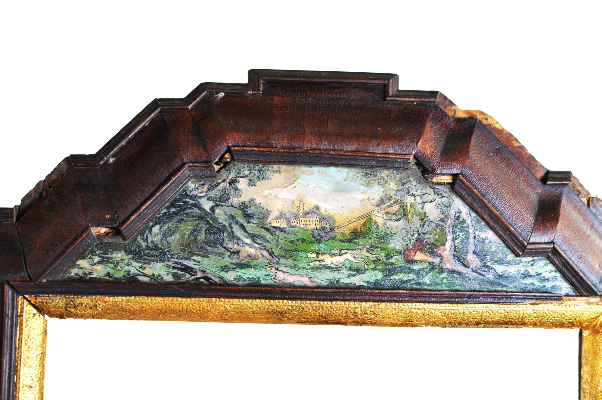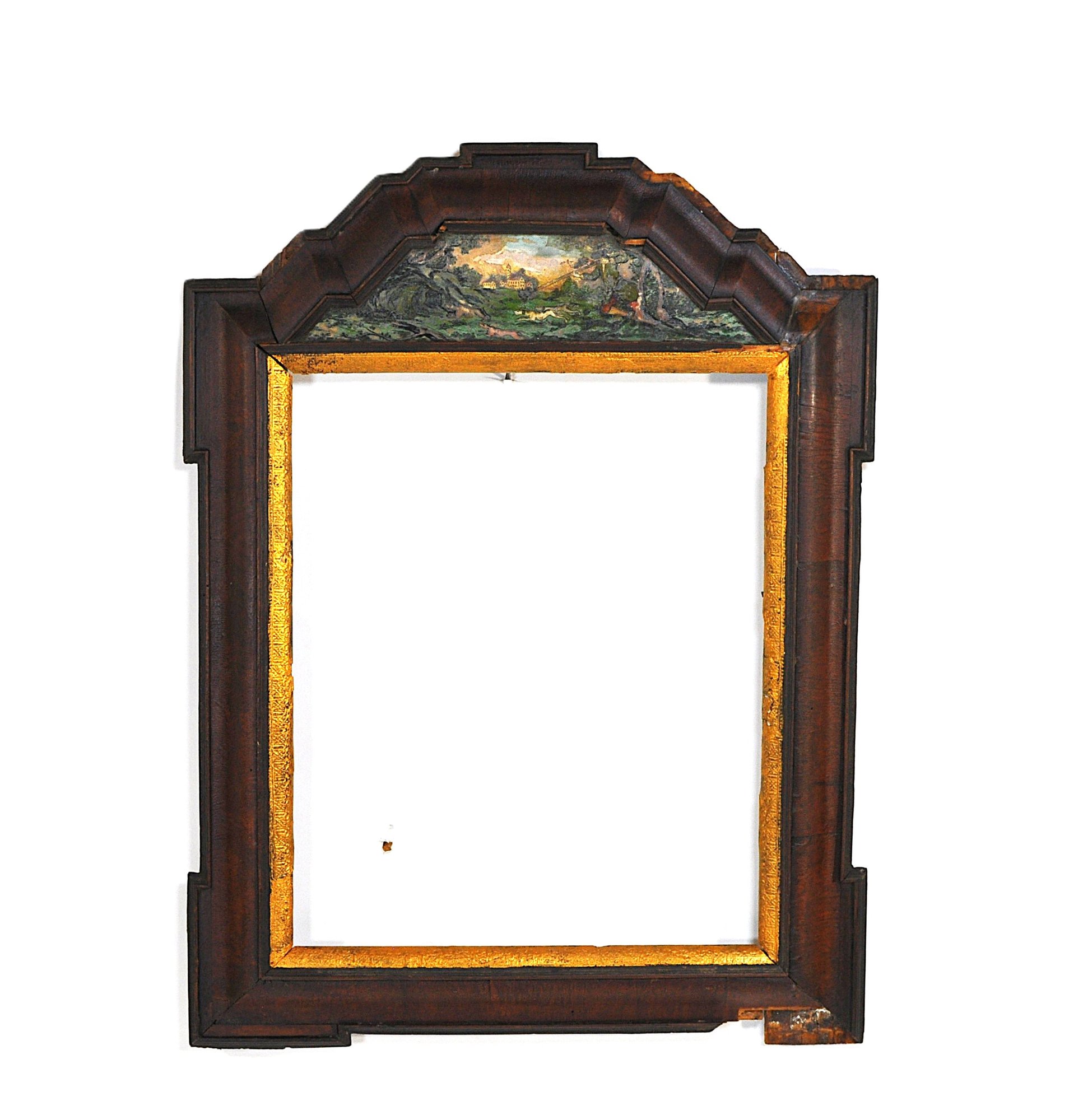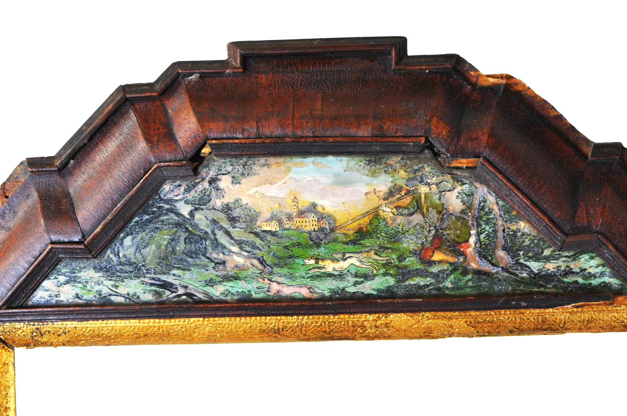 For restoration: antique wood picture frame, featuring a stepped architectural profile with warm dark finish and gilt inner liner. The crest panel is decorated with a charming hand-painted on glass pastoral hunting scene showing a hunter with rifle, dogs, and distant village—adding a distinctive decorative touch.