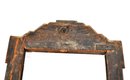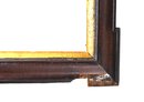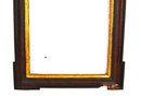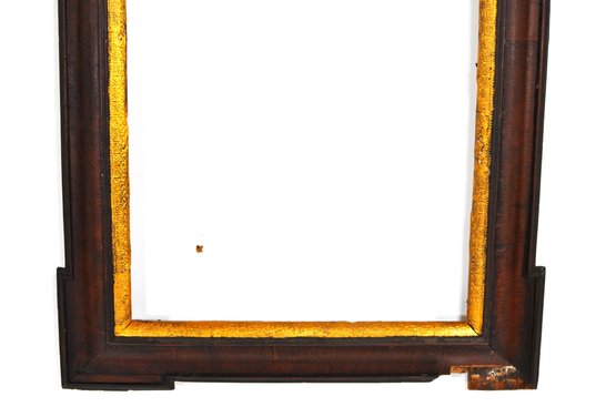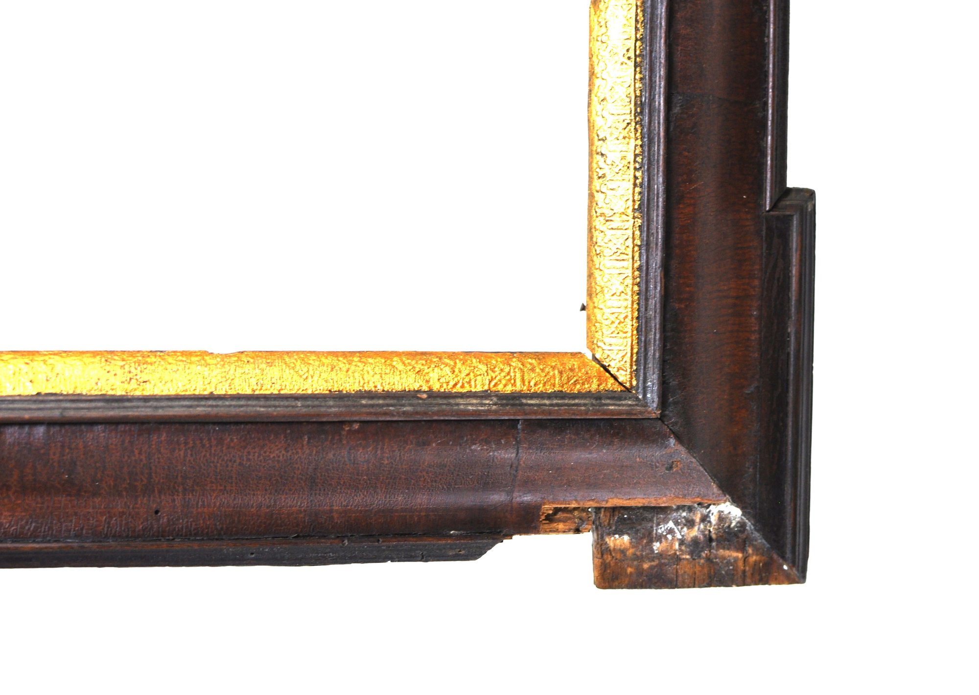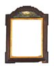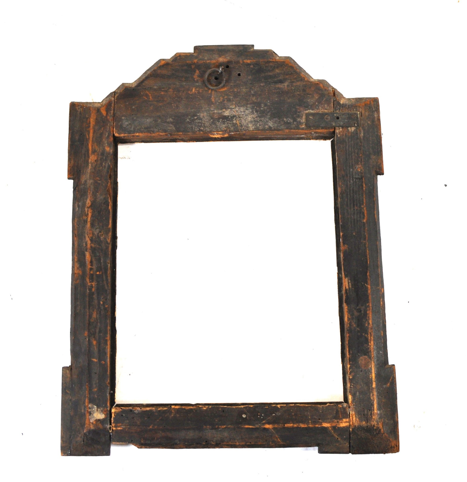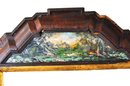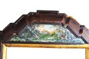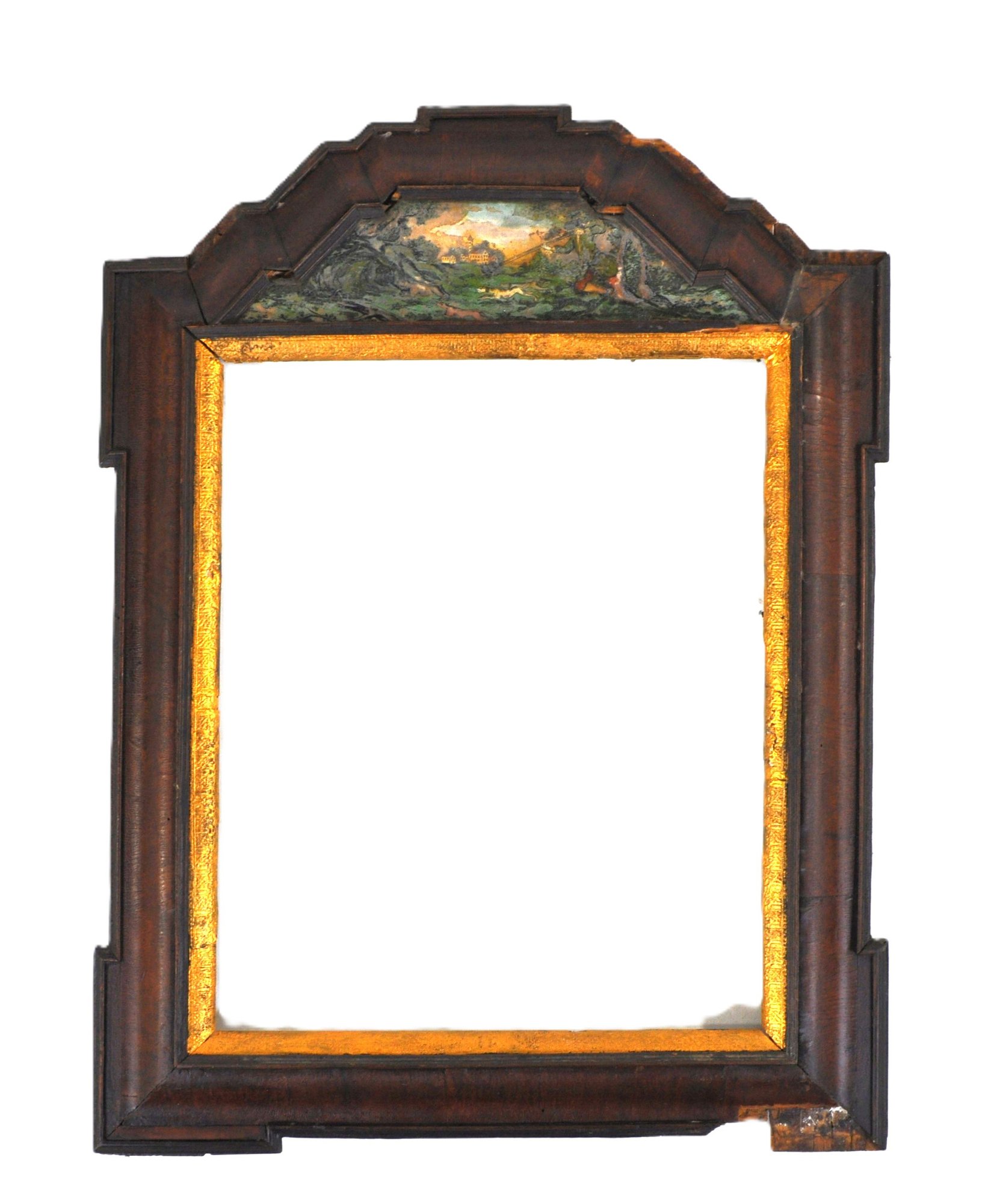 For restoration: antique wood picture frame, featuring a stepped architectural profile with warm dark finish and gilt inner liner. The crest panel is decorated with a charming hand-painted on glass pastoral hunting scene showing a hunter with rifle, dogs, and distant village—adding a distinctive decorative touch.