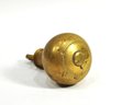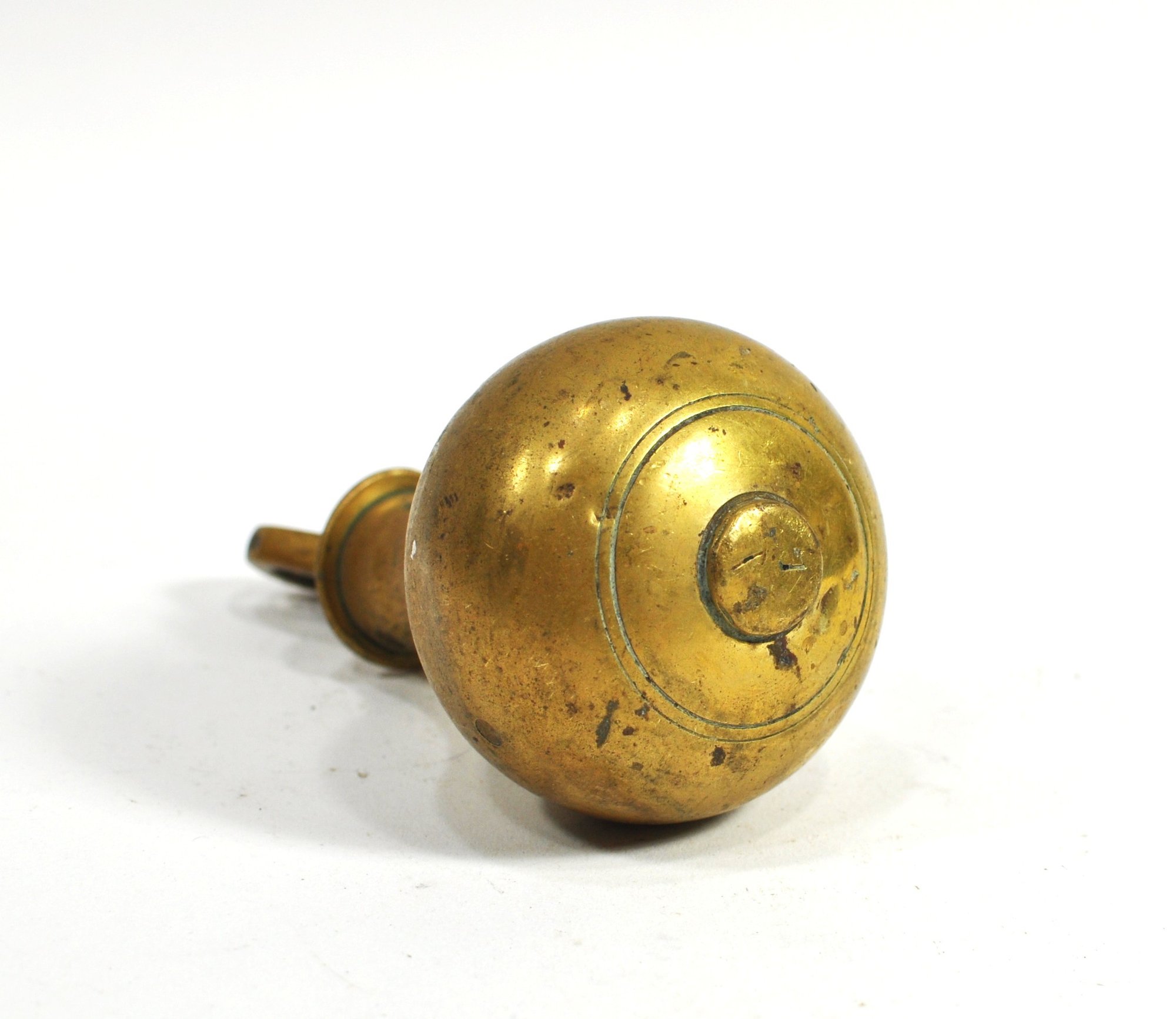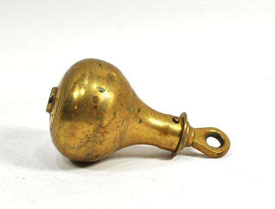 Antique brass plumb bob or clock weight of bulbous baluster form, fitted with an integral suspension eye at the top for hanging. The turned profile with incised rings and substantial mass is consistent with weights used on early weight-driven clocks, including wall, longcase, or regulator clocks.