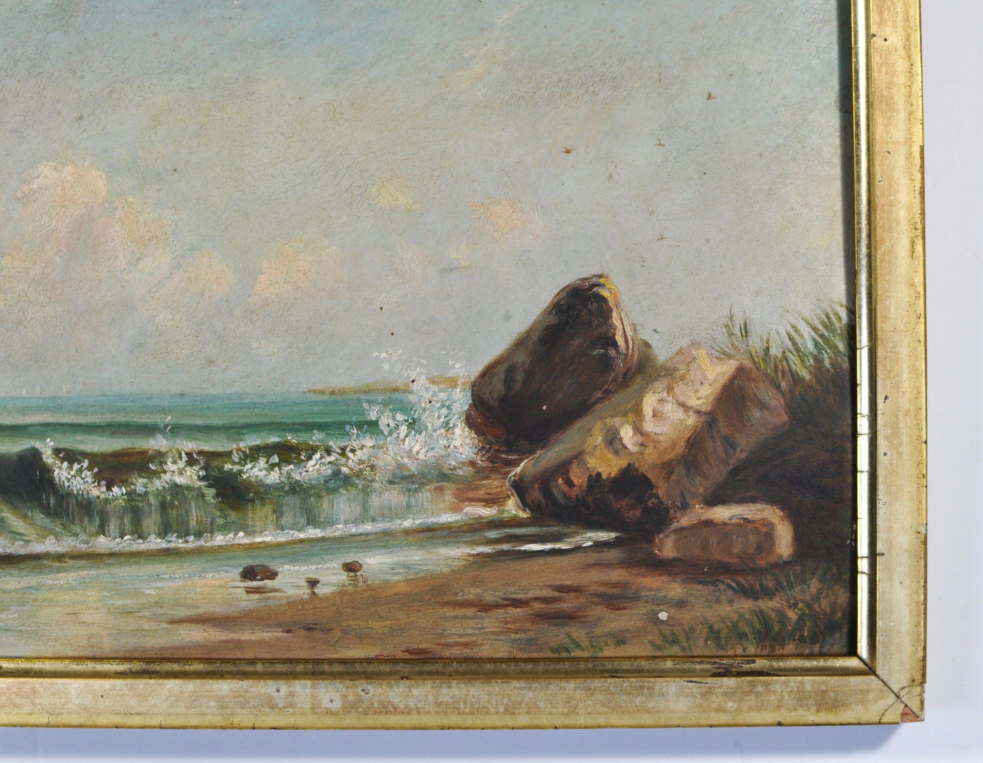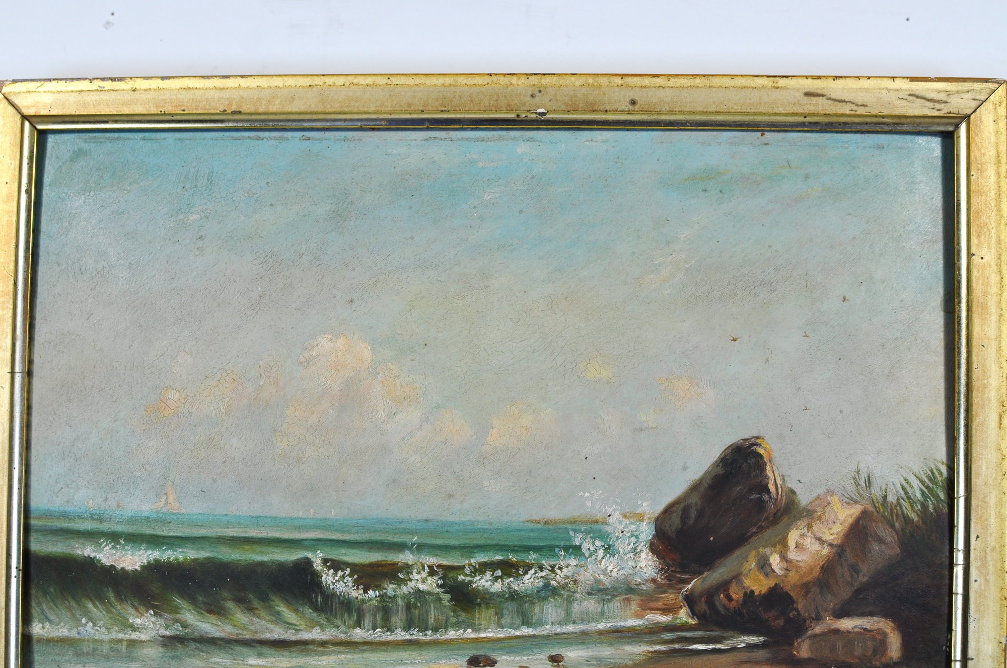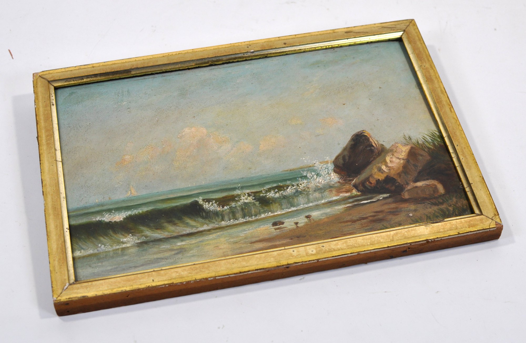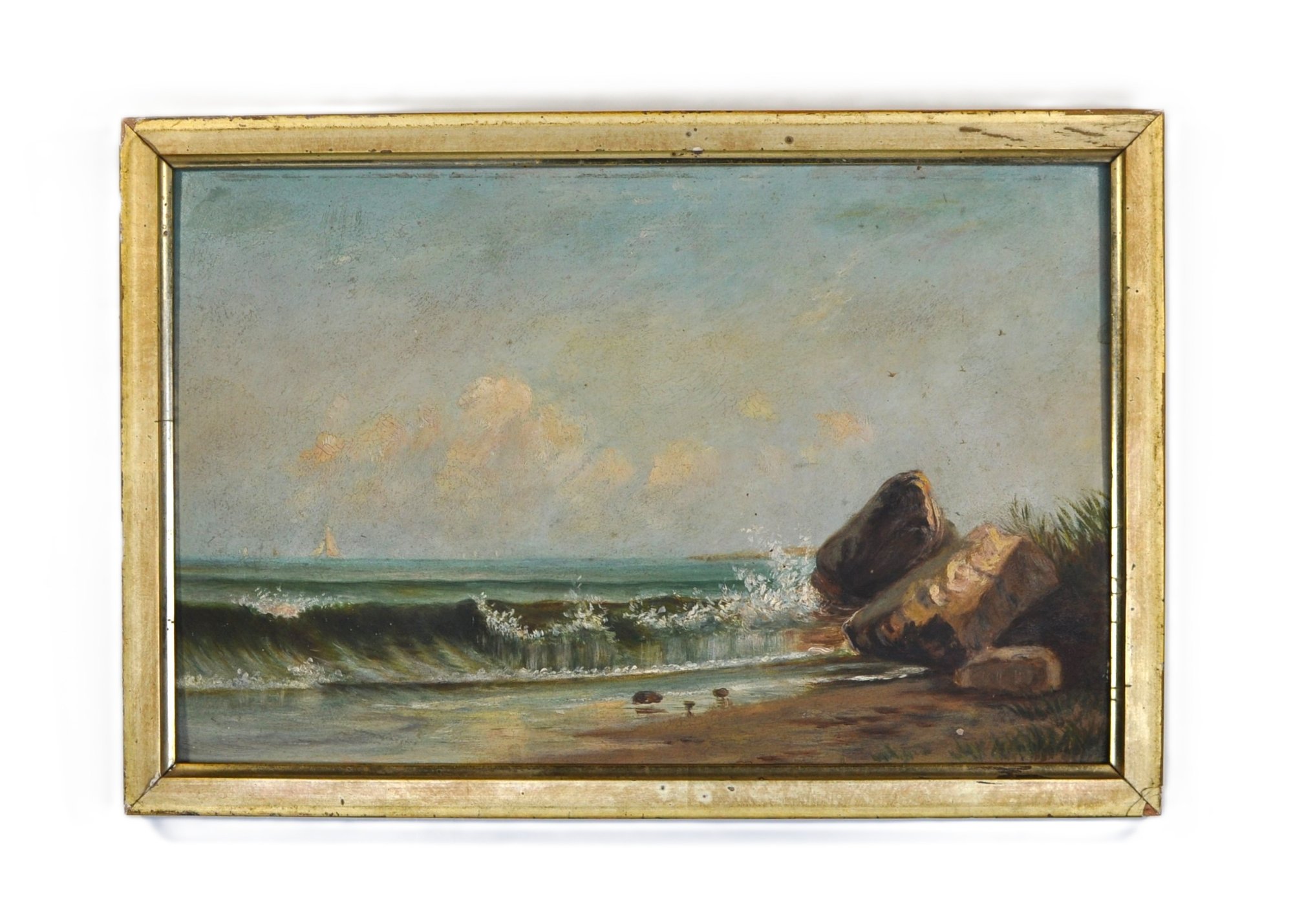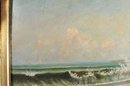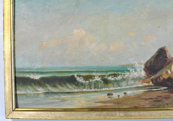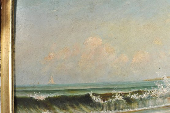 Unsigned oil painting depicting a tranquil coastal scene with rolling waves breaking against a rocky shoreline, a distant sailboat on the horizon, and seabirds in the sky. Executed in a restrained, atmospheric palette characteristic of late 19th to early 20th century American coastal painting, possibly New England.