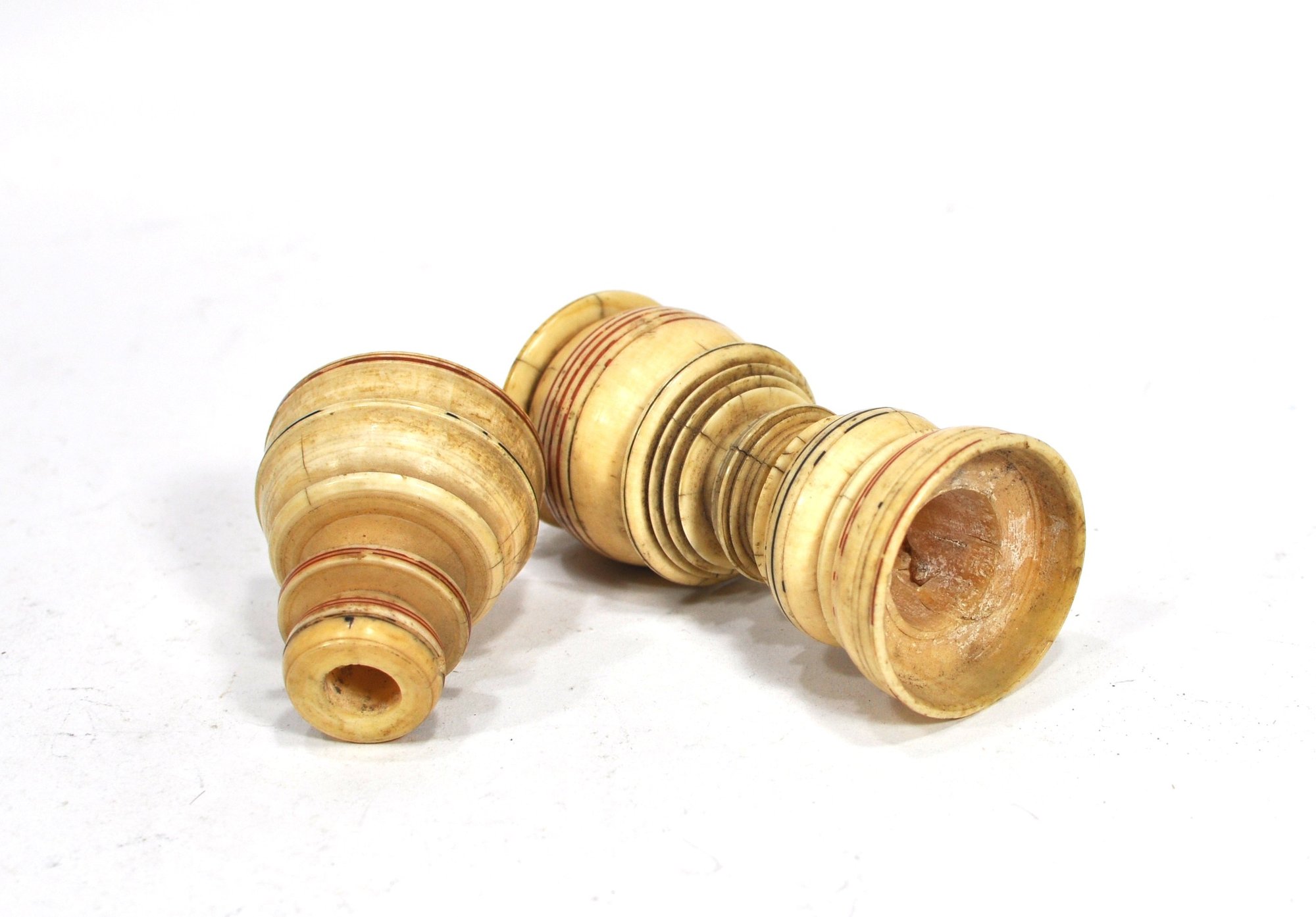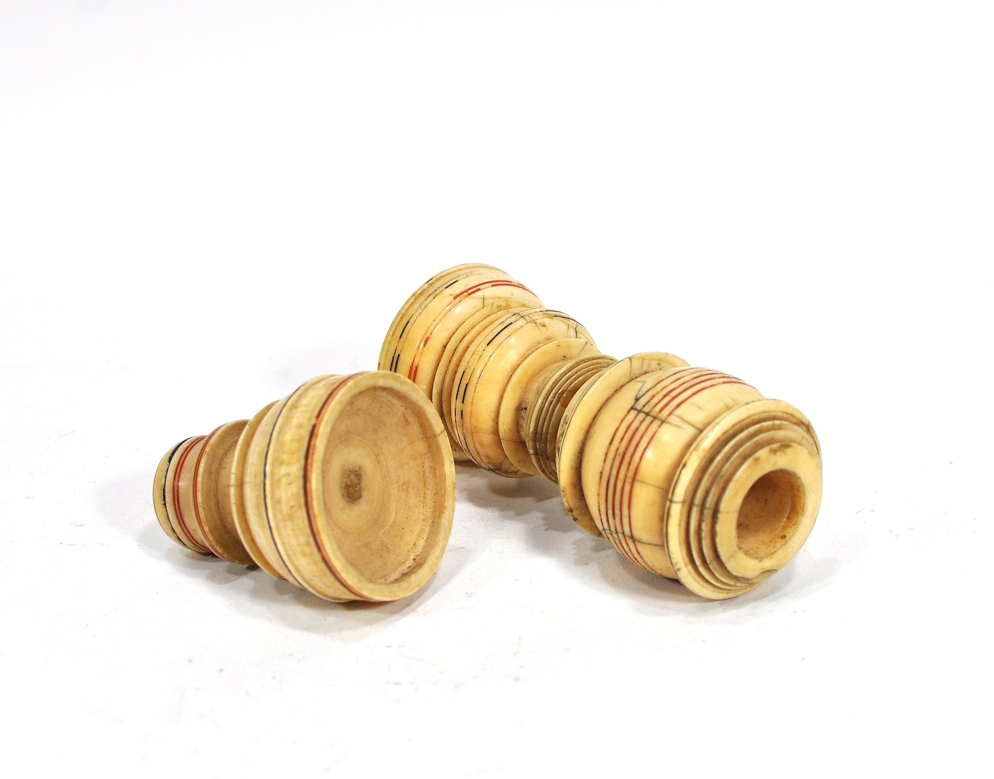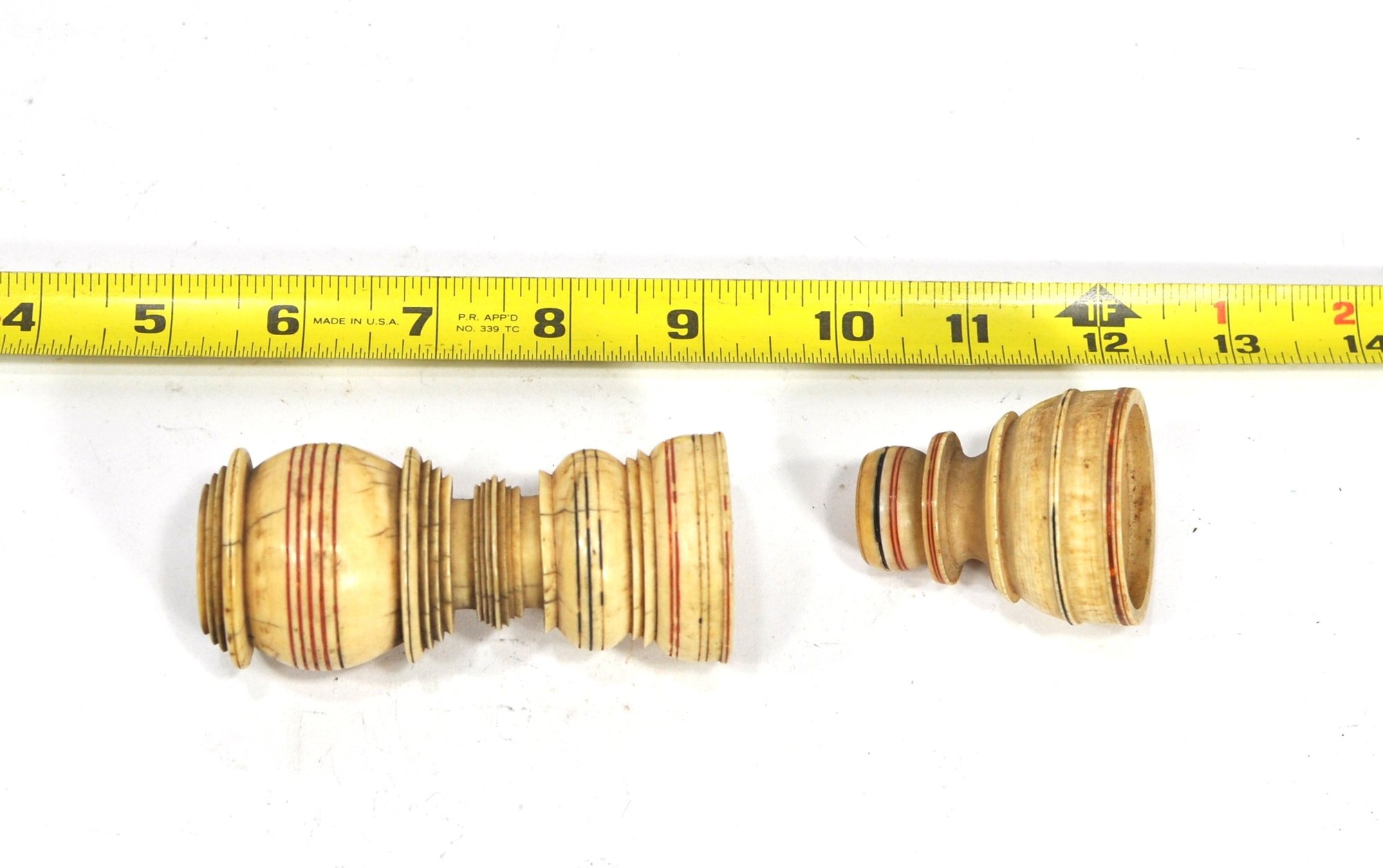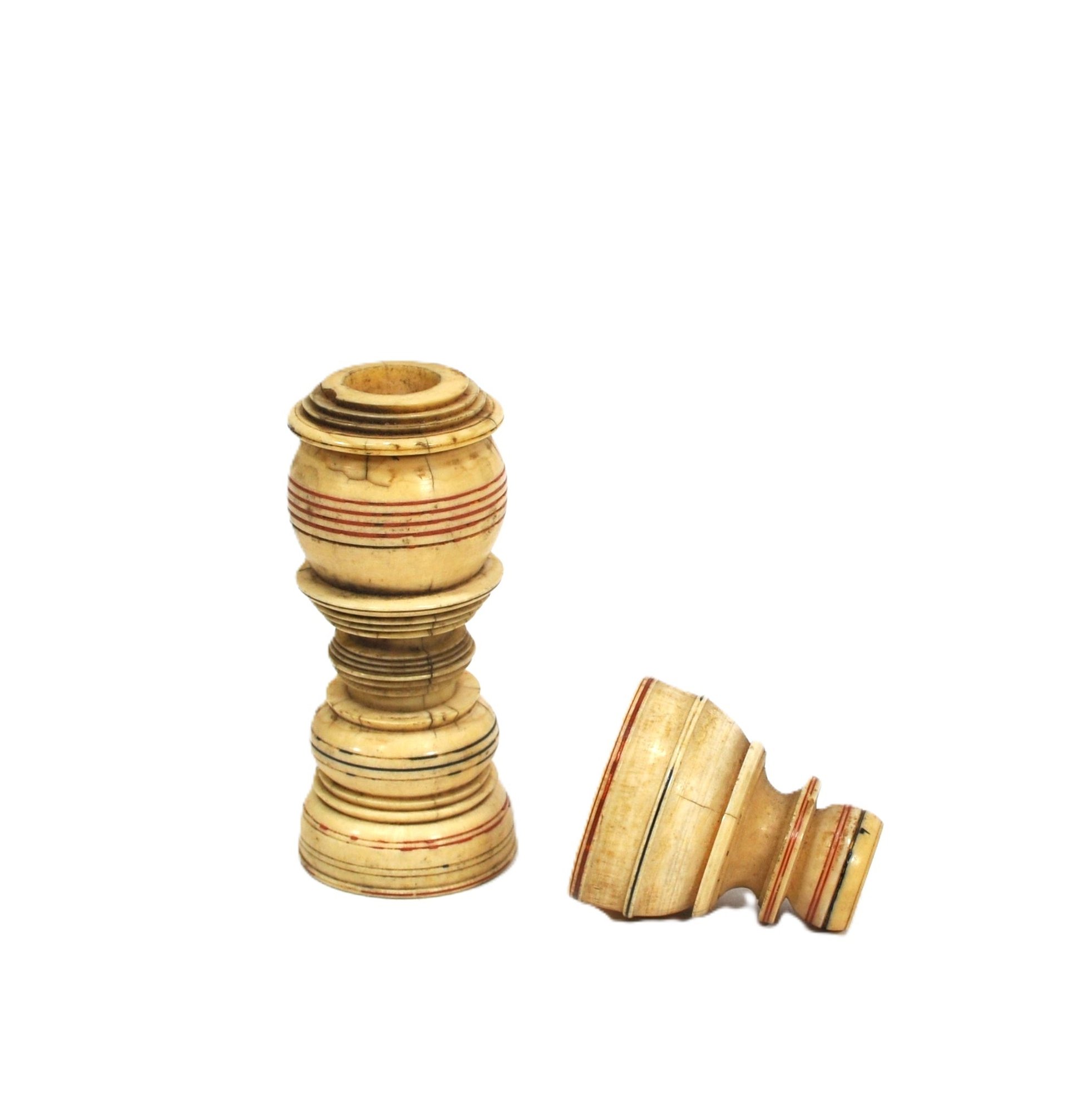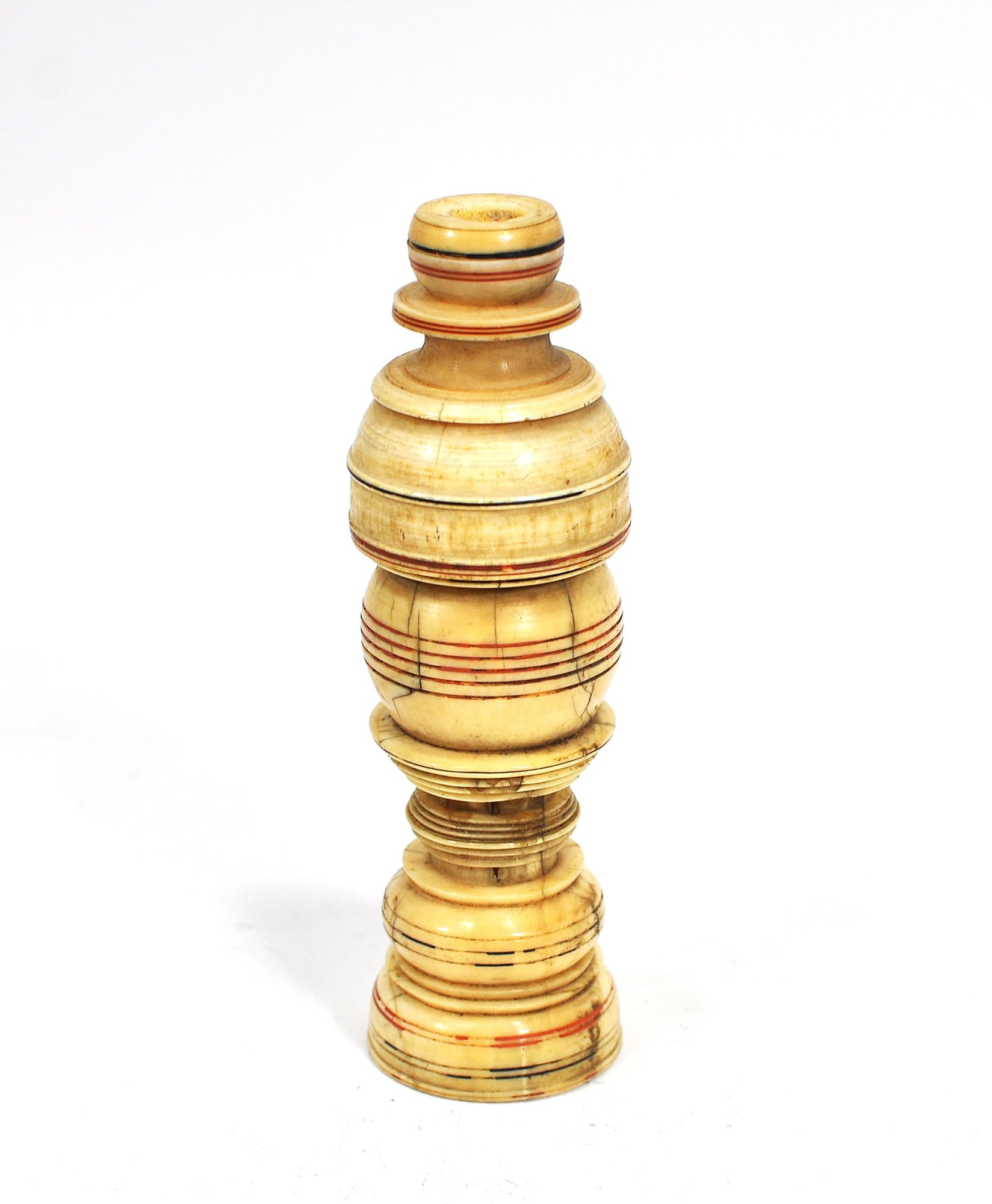 Antique turned bone object with incised red and black decoration, in a Pickwick-type form. Scrimshaw-style work with hollow interior and removable top. Appears to be a Pickwick, though exact function not confirmed.
