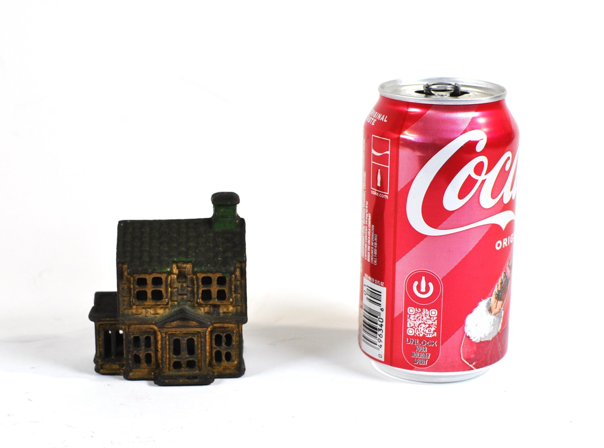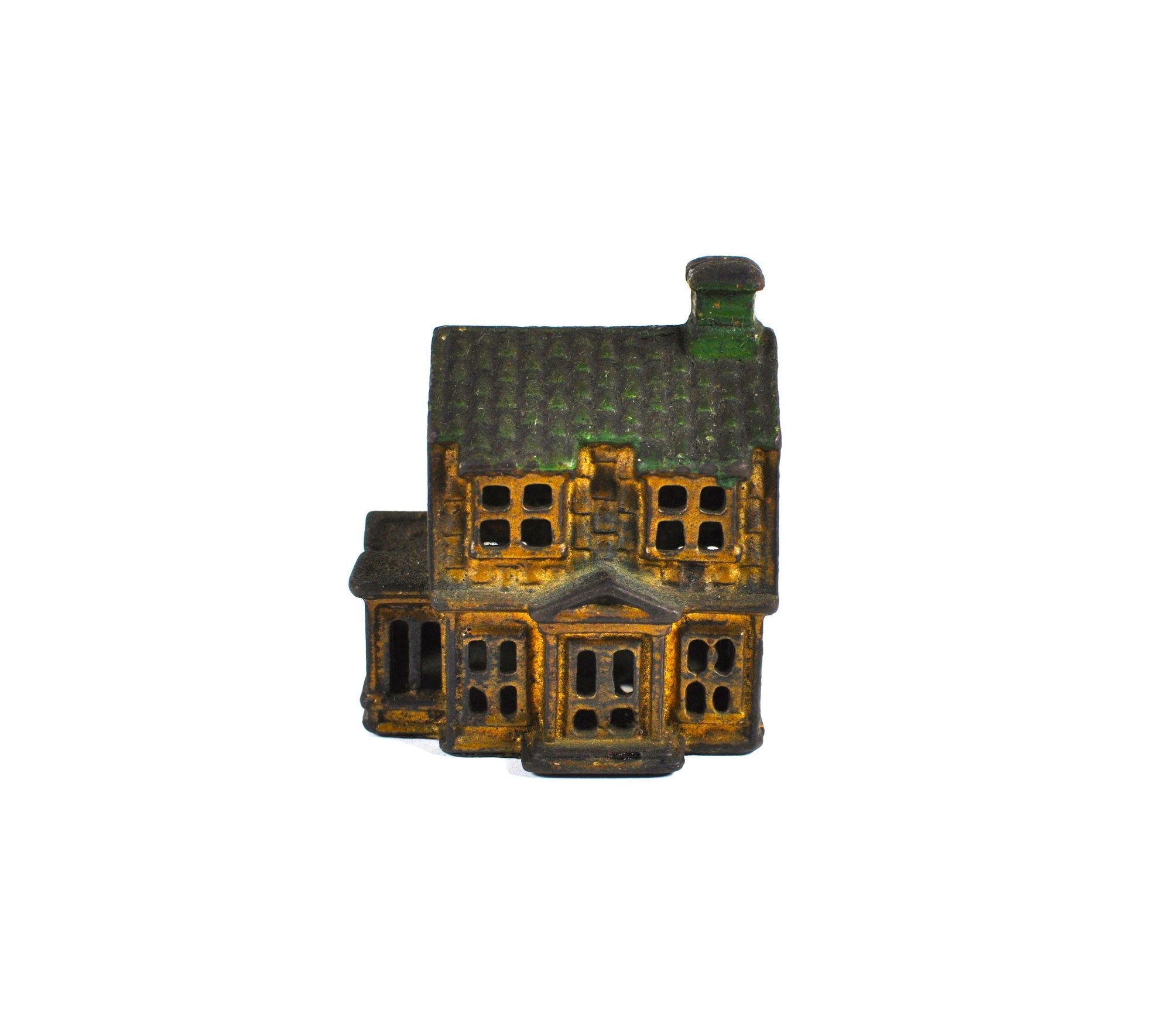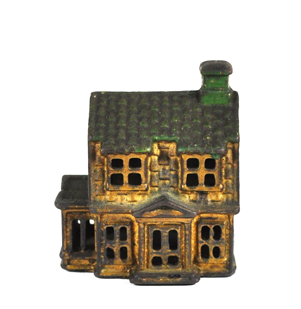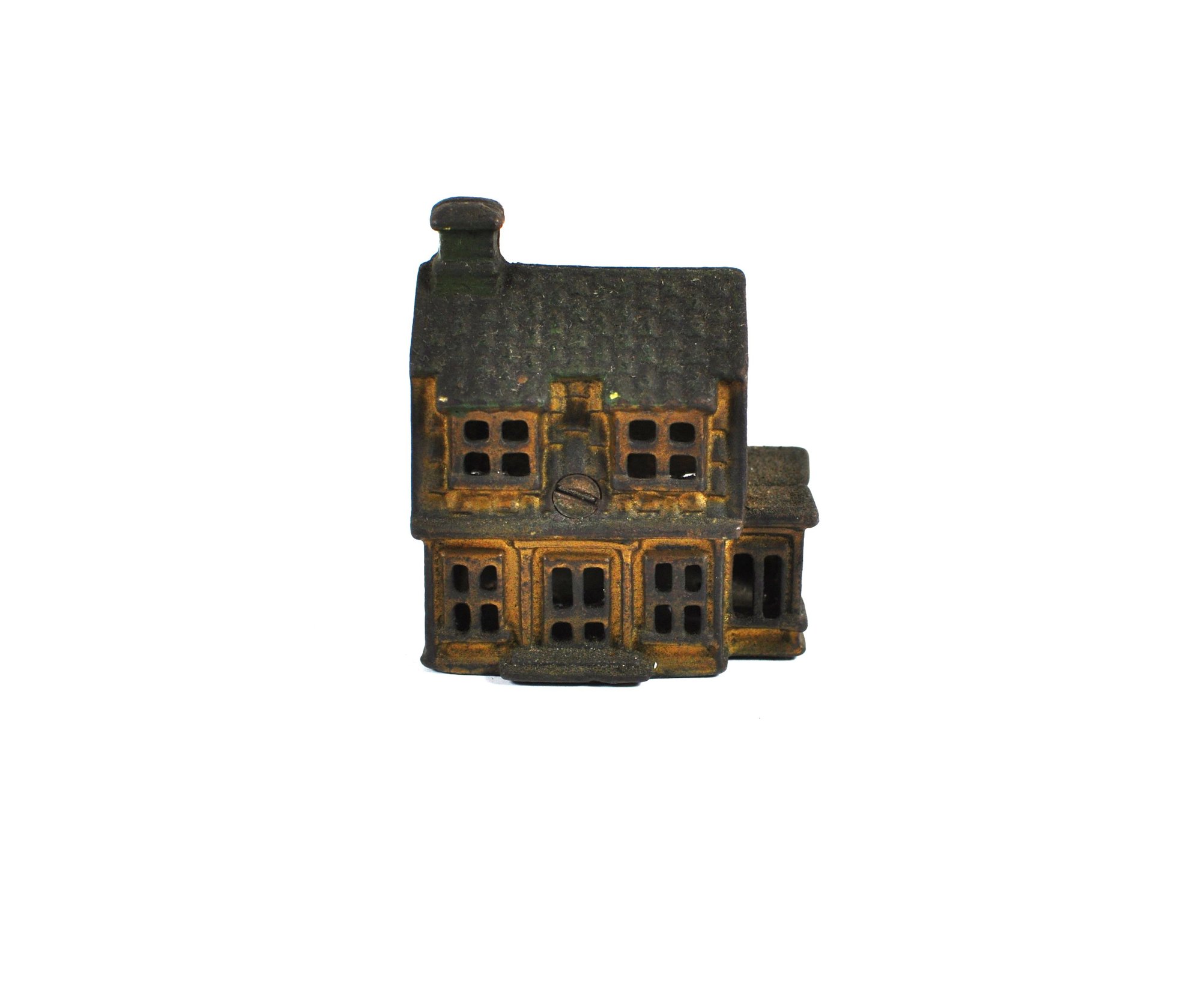 Offered is a charming antique cast iron still bank in the form of a small green roof house/cottage, attributed to A.C. Williams (Arcade Mfg. Co.), well known for their early 20th century cast iron banks.