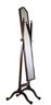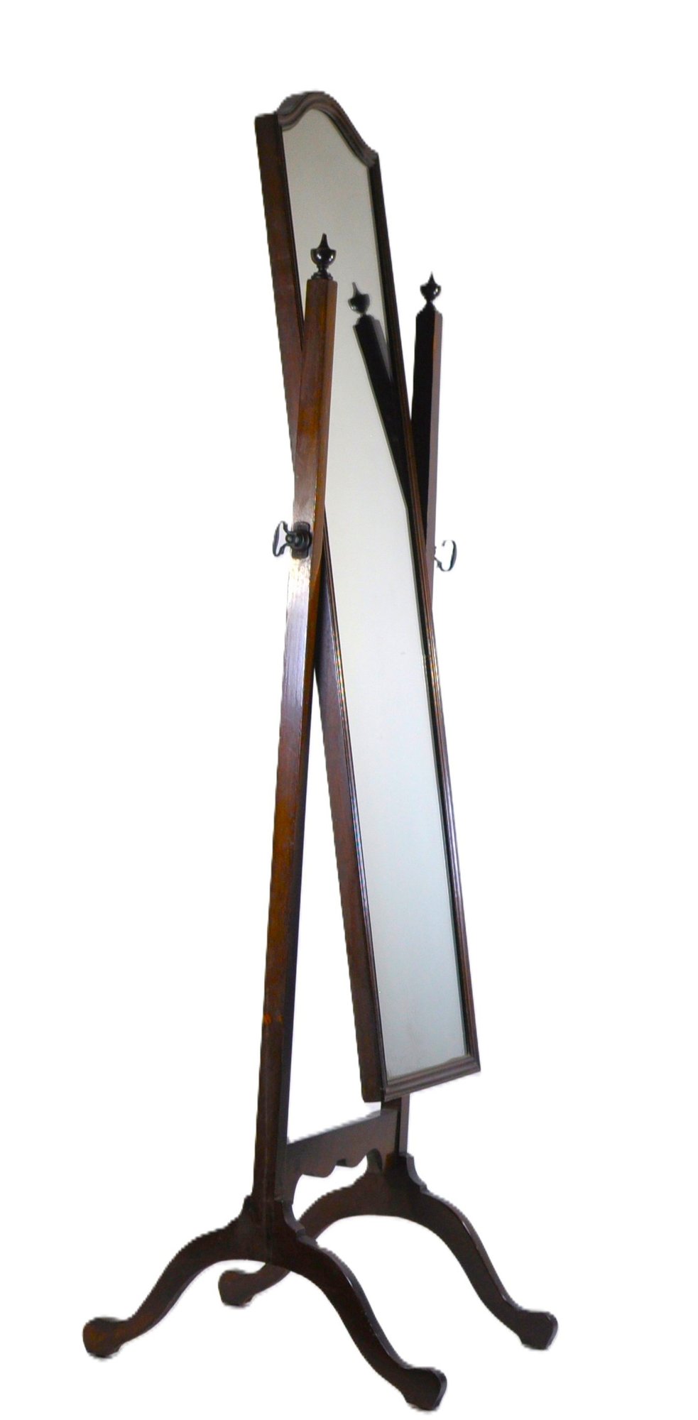 Elegant full-length cheval mirror in solid wood, featuring a shaped top and tilting frame supported by turned finials and cabriole-style legs. The mirror is mounted on a sturdy stretcher base with scrolled feet, balanced by decorative brass side knobs for easy angle adjustment.