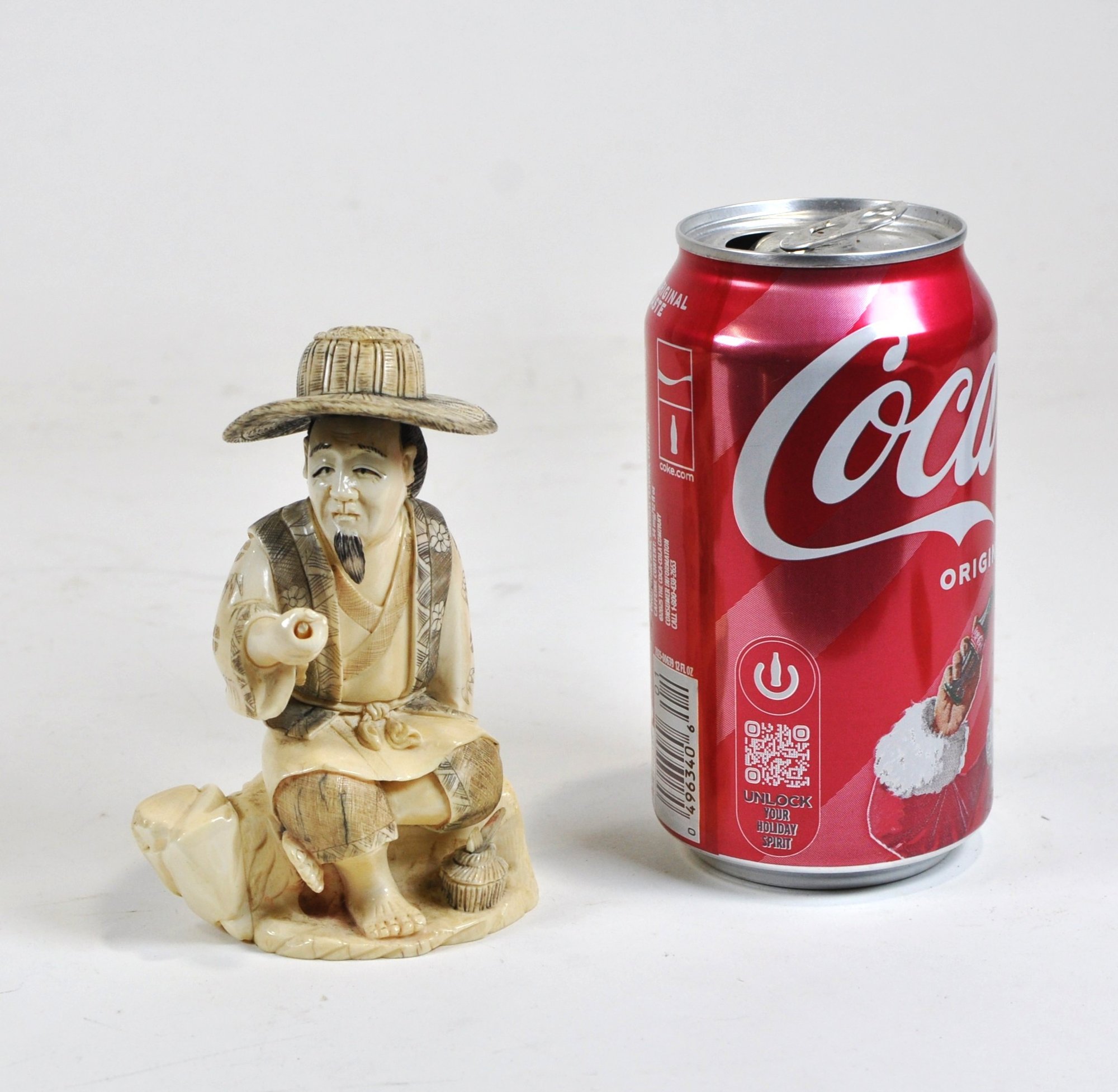 Antique Asian carved resin okimono depicting a seated fisherman wearing a wide-brimmed hat and patterned robes, holding a small object in his outstretched hand. Finely detailed with incised and inked decoration throughout the clothing, hat, and facial features, and seated on a carved rocky base with additional elements at his side. The underside bears a black ink signature or artist’s mark.