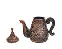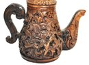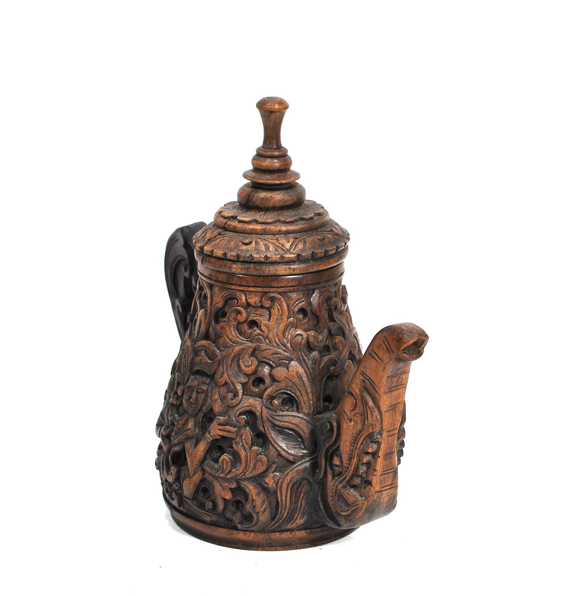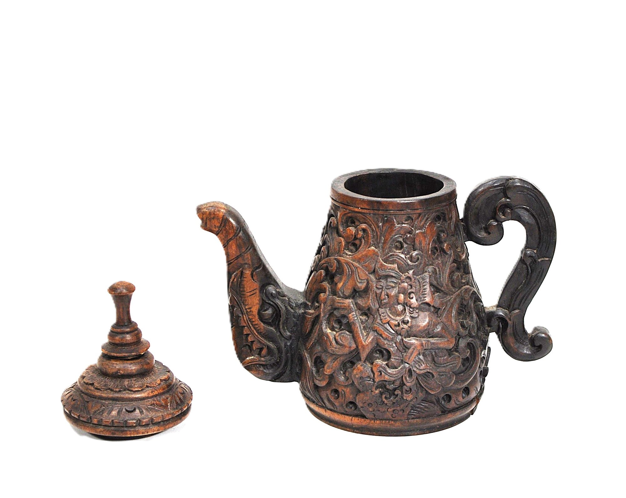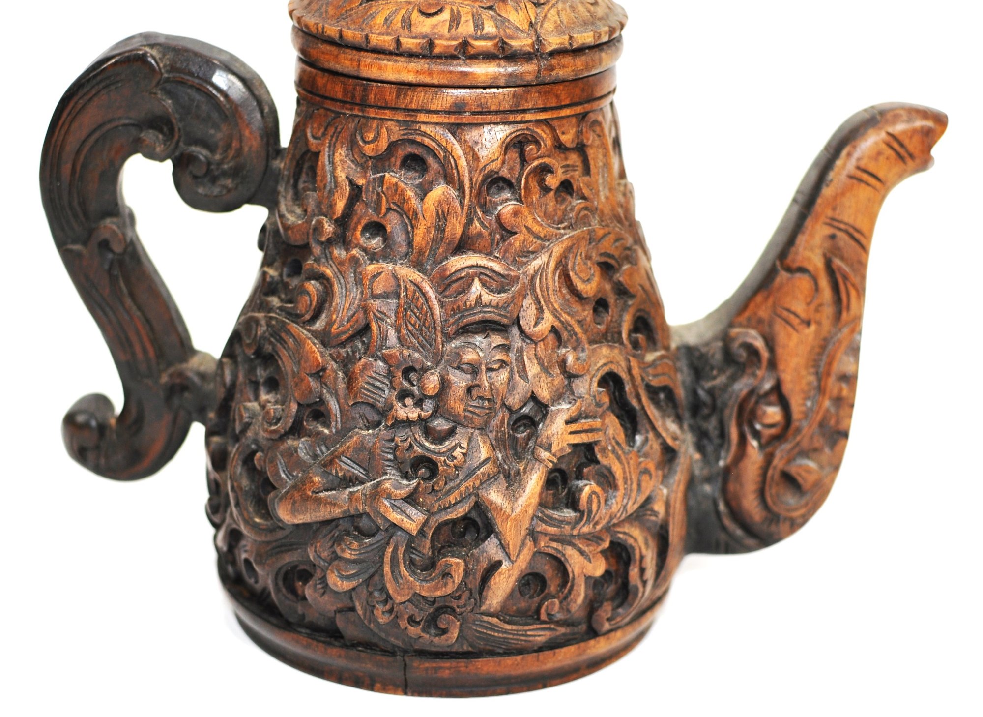 Antique hand-carved wooden teapot featuring elaborate openwork and relief carving of a figural scene amid scrolling foliage. Sculptural spout and handle, with fitted lid and finial.