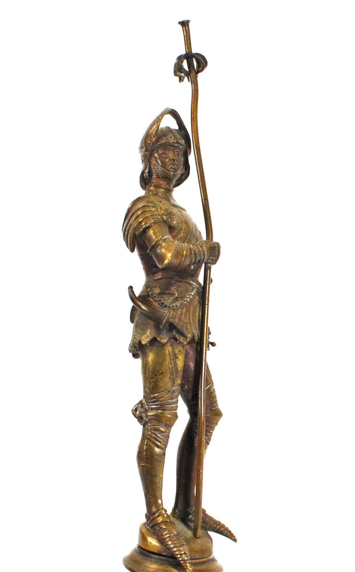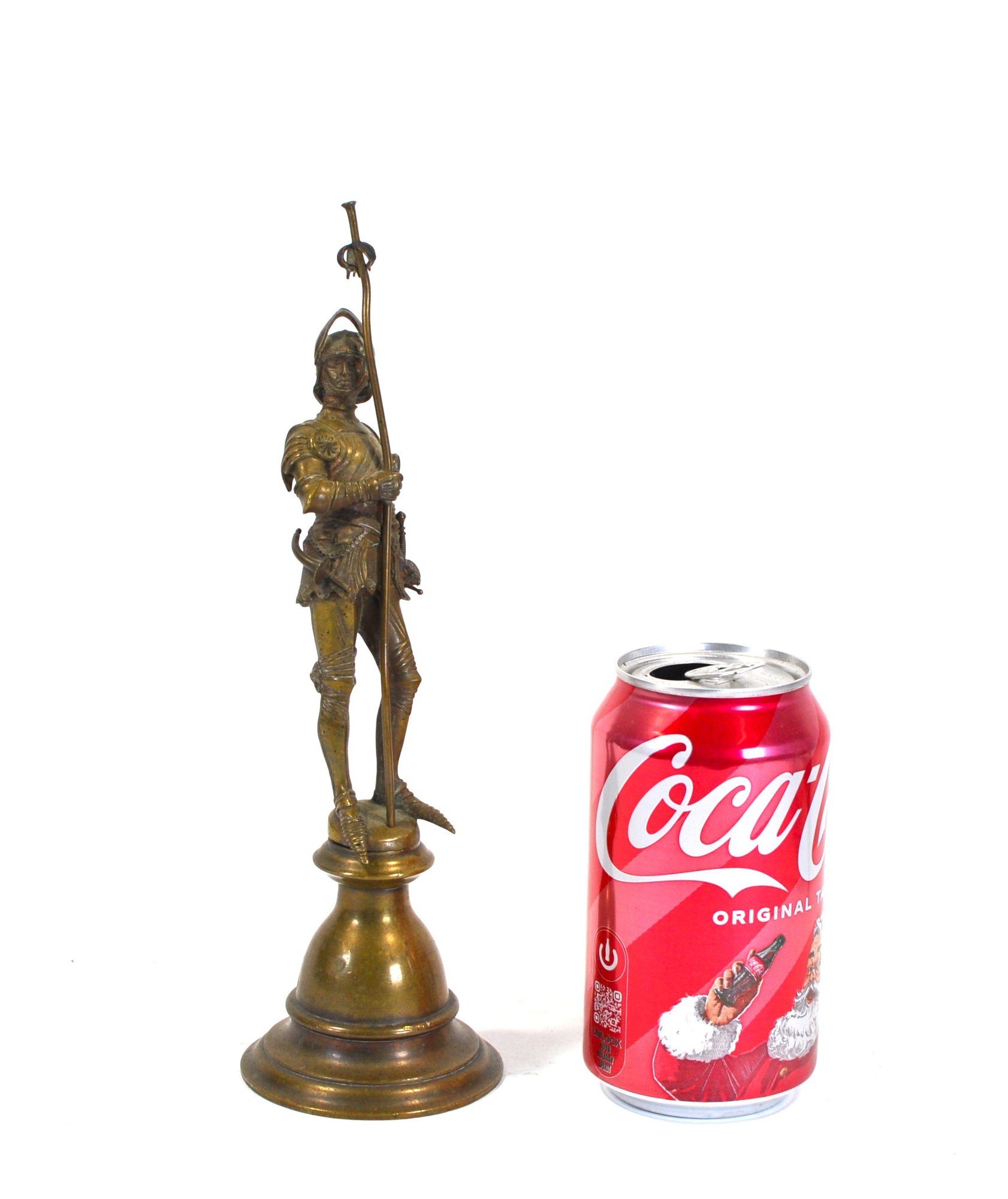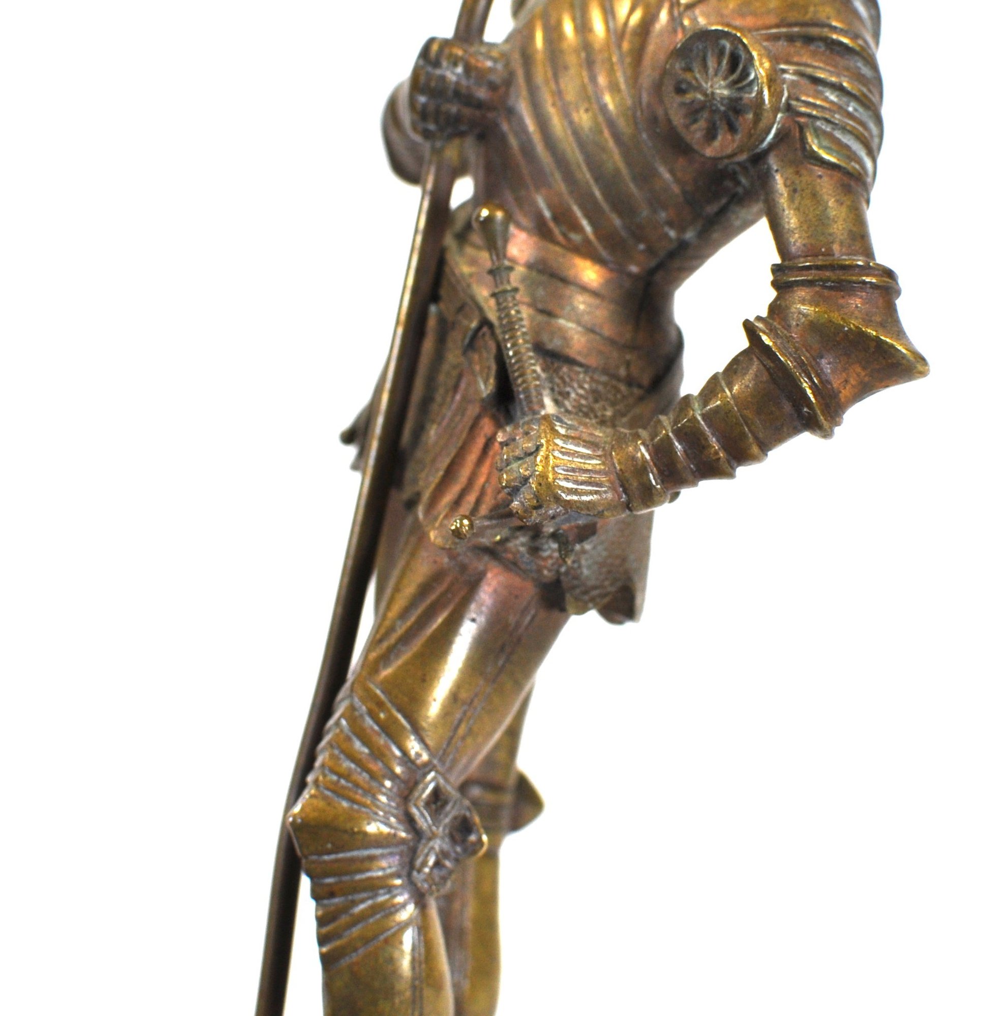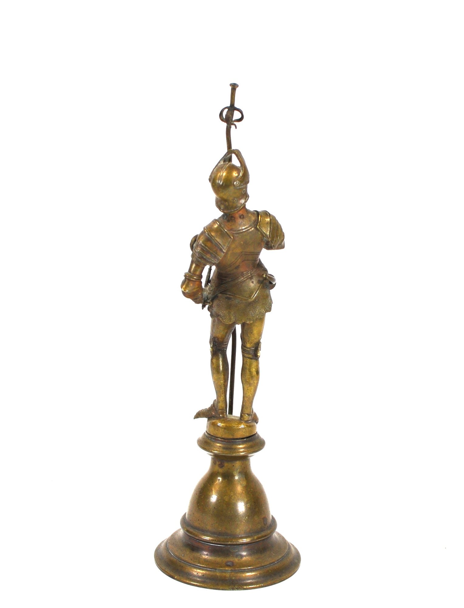 Antique brass figural sculpture depicting a standing medieval knight in full armor, holding a vertical staff or standard. The figure is finely modeled with detailed helmet, articulated armor, sword at the hip, and period footwear, mounted atop an integral stepped pedestal base.