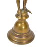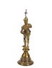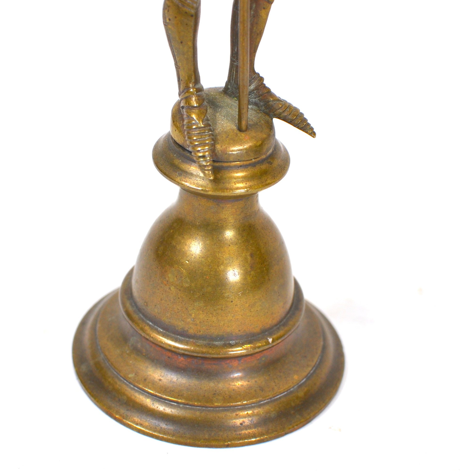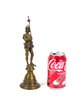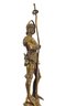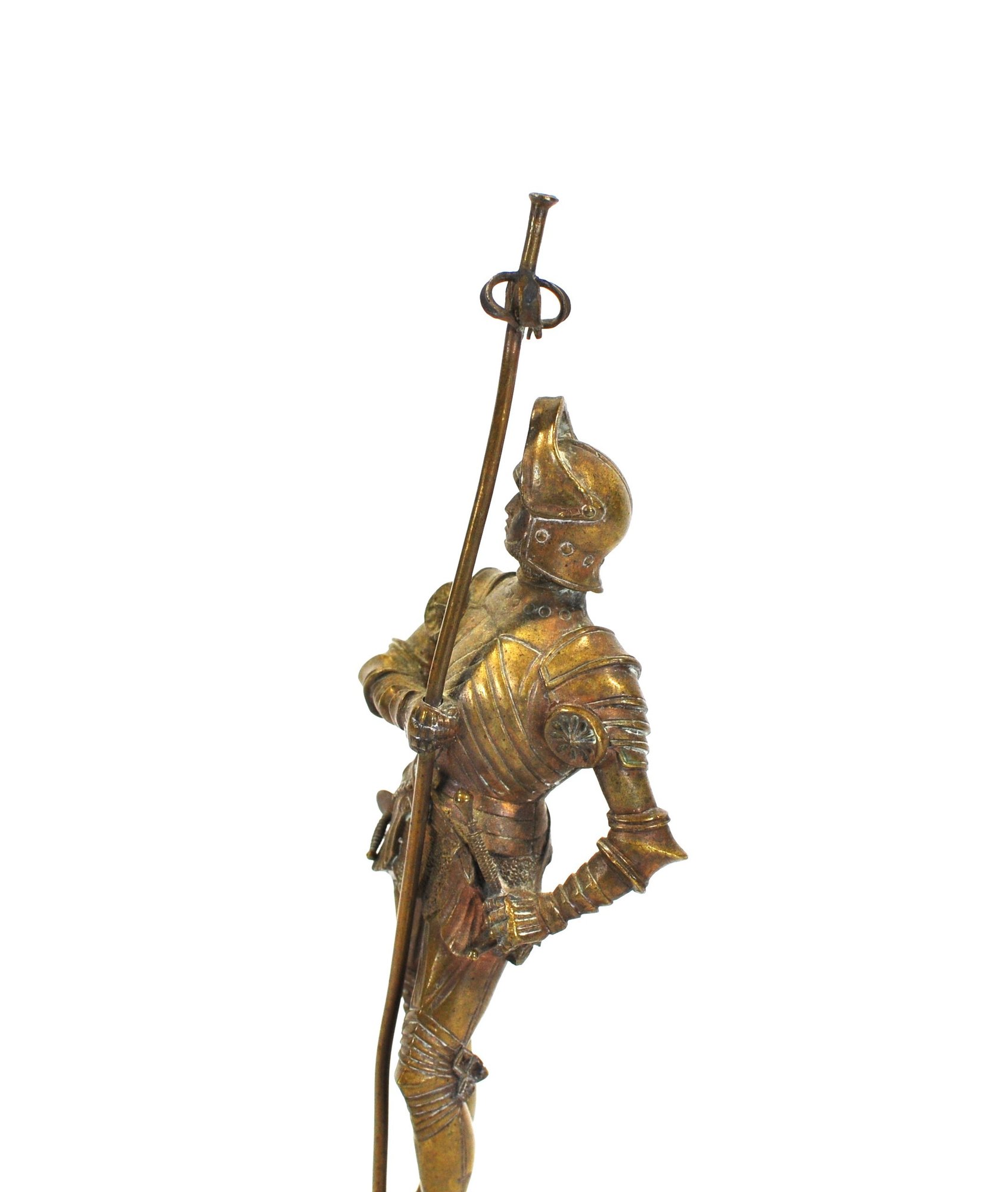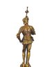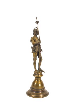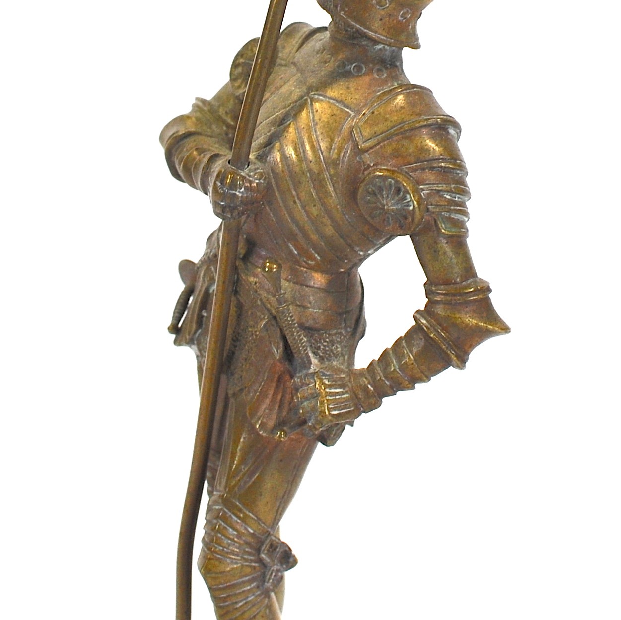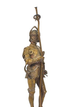 Antique brass figural sculpture depicting a standing medieval knight in full armor, holding a vertical staff or standard. The figure is finely modeled with detailed helmet, articulated armor, sword at the hip, and period footwear, mounted atop an integral stepped pedestal base.