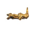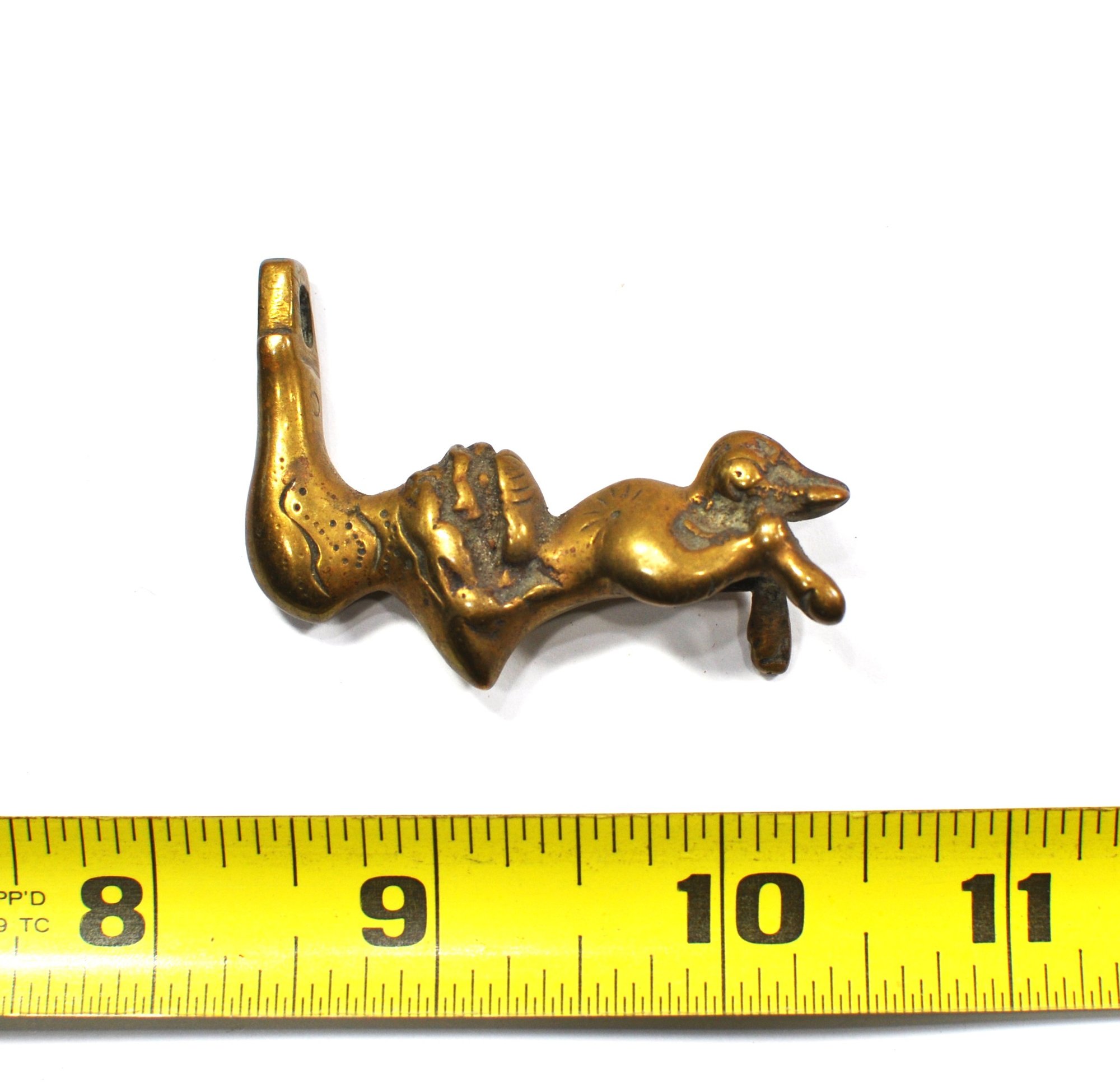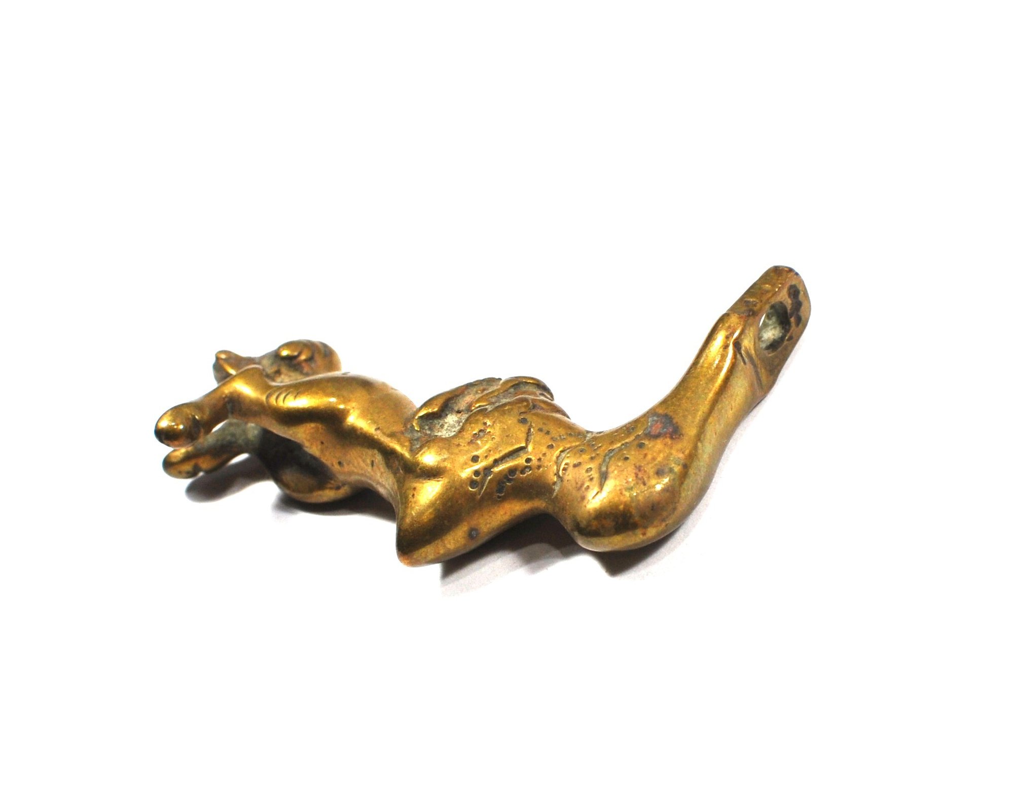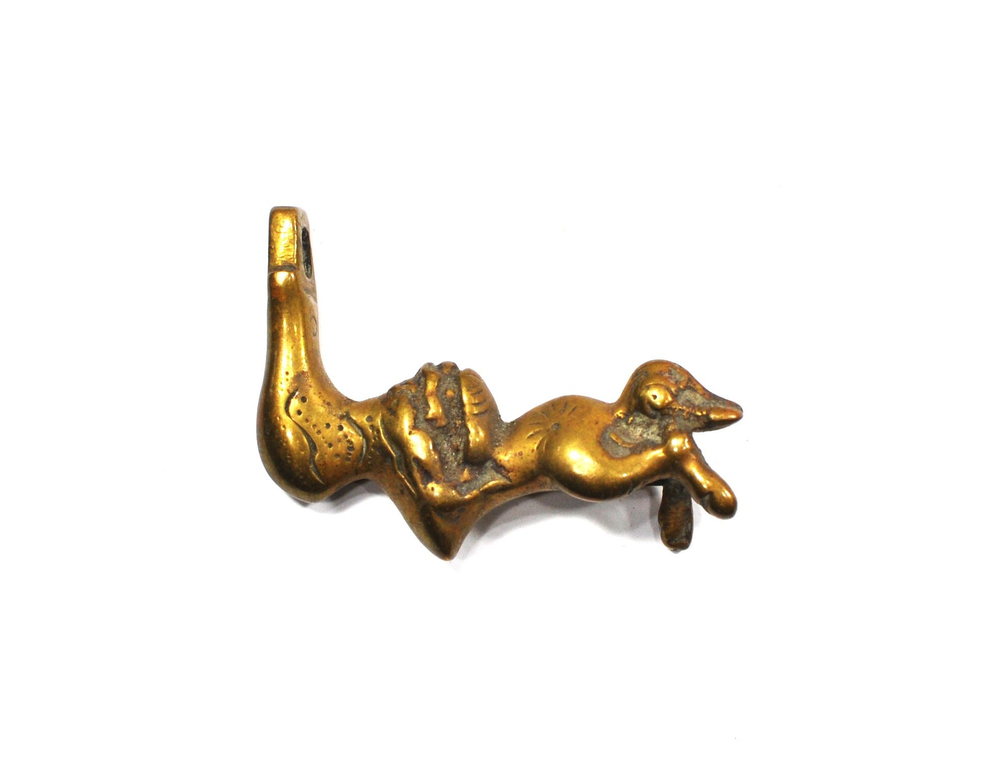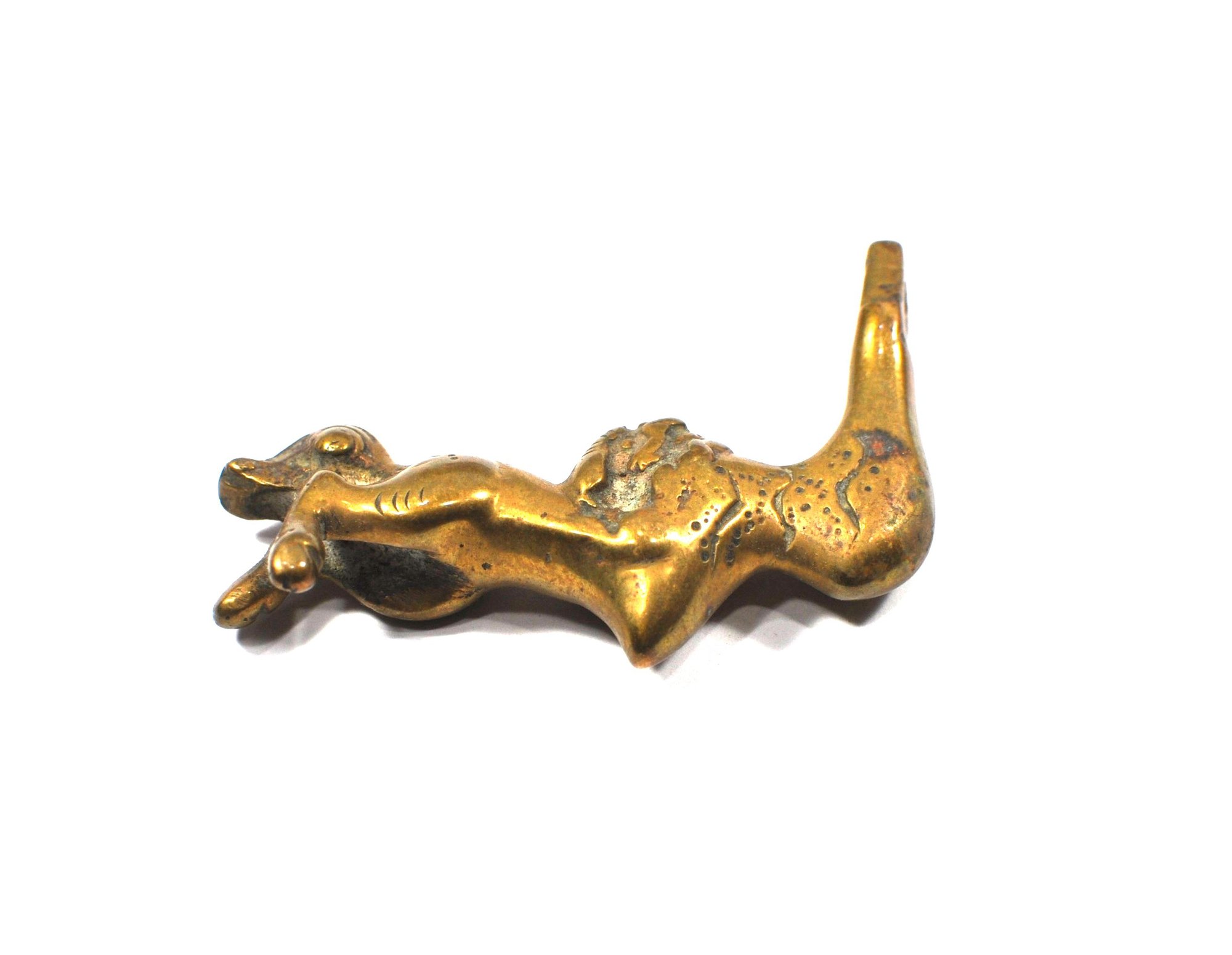 Antique cast brass figural door or cabinet pull, modeled in the form of a stylized animal, possibly a dog or fox. The piece features a sculptural, flowing form with a raised tail that functions as the grip. Cast in solid brass with a warm aged patina and areas of surface wear consistent with age and use. Single rear mounting point. Likely late 19th to early 20th century.