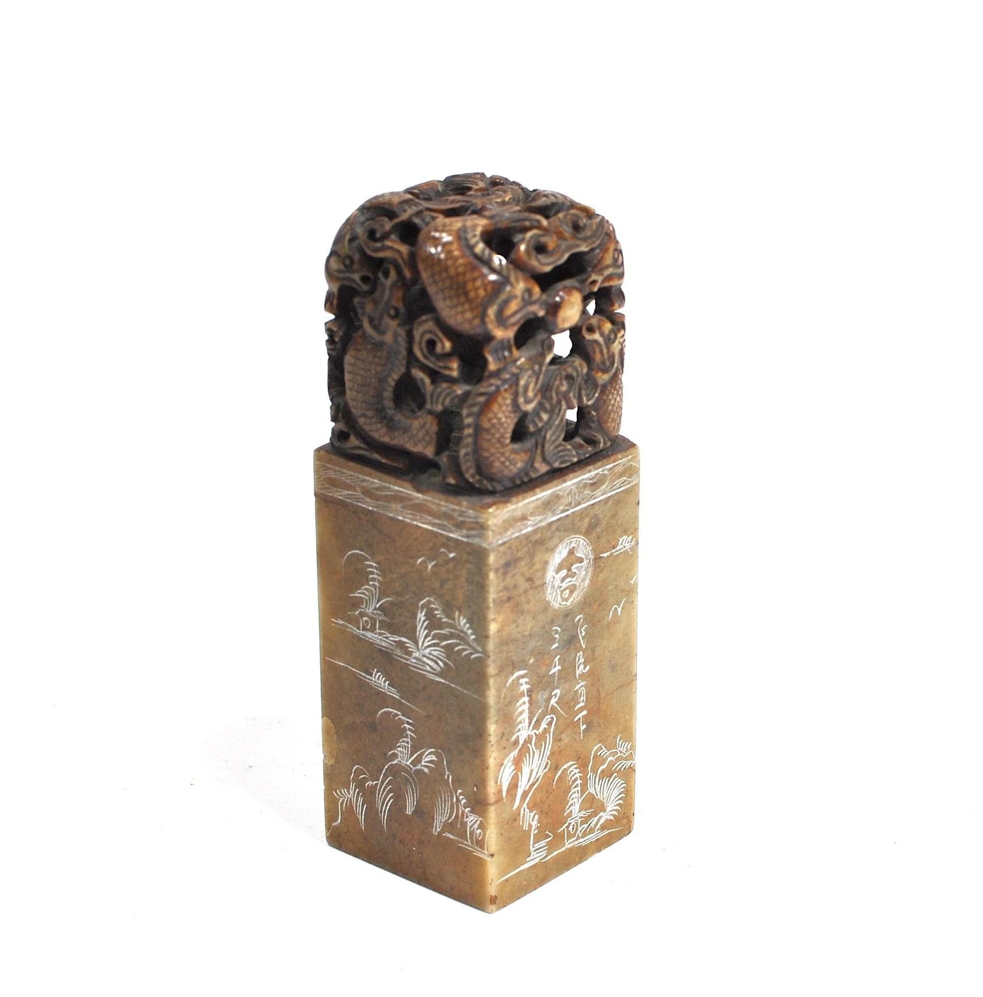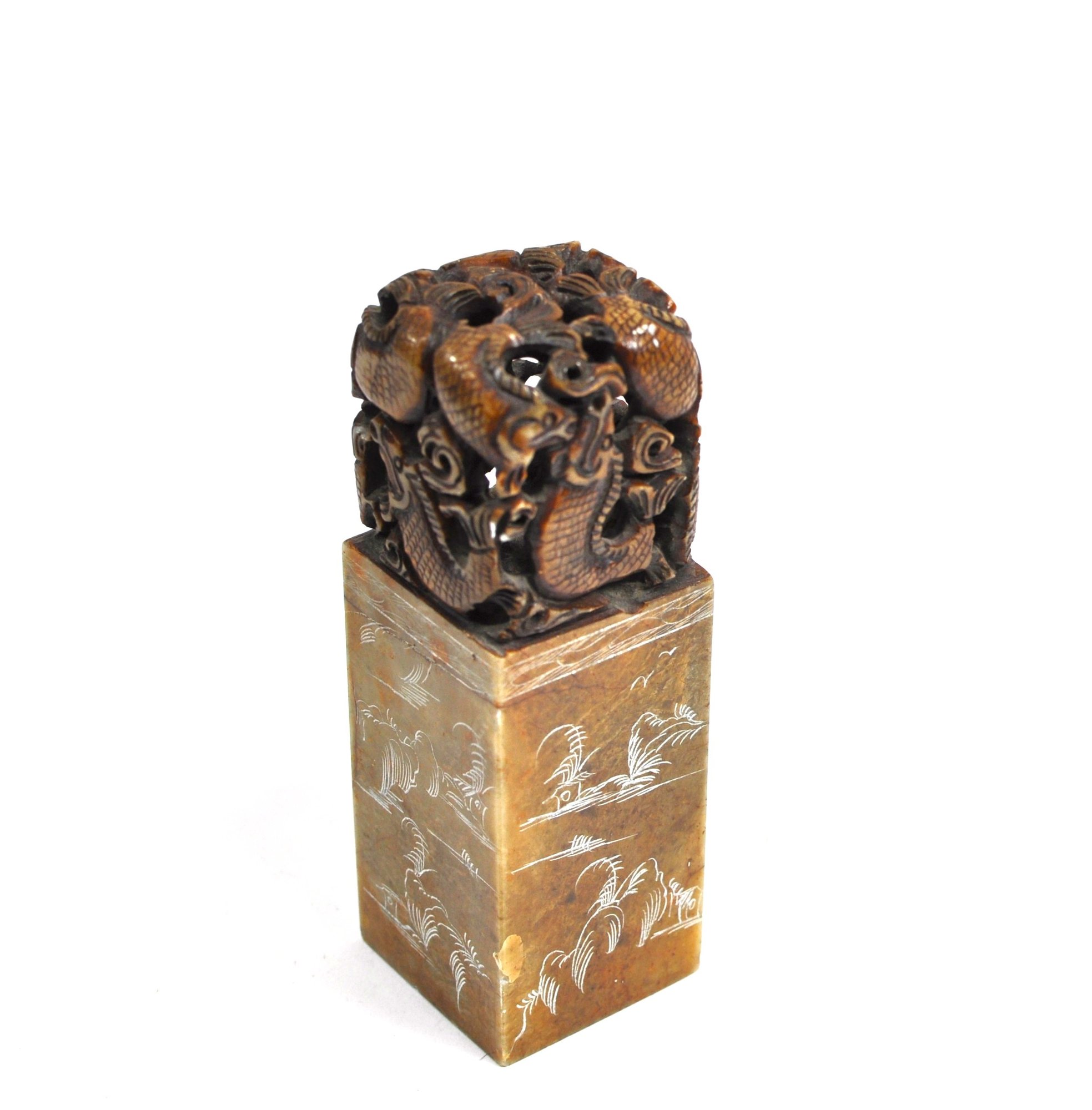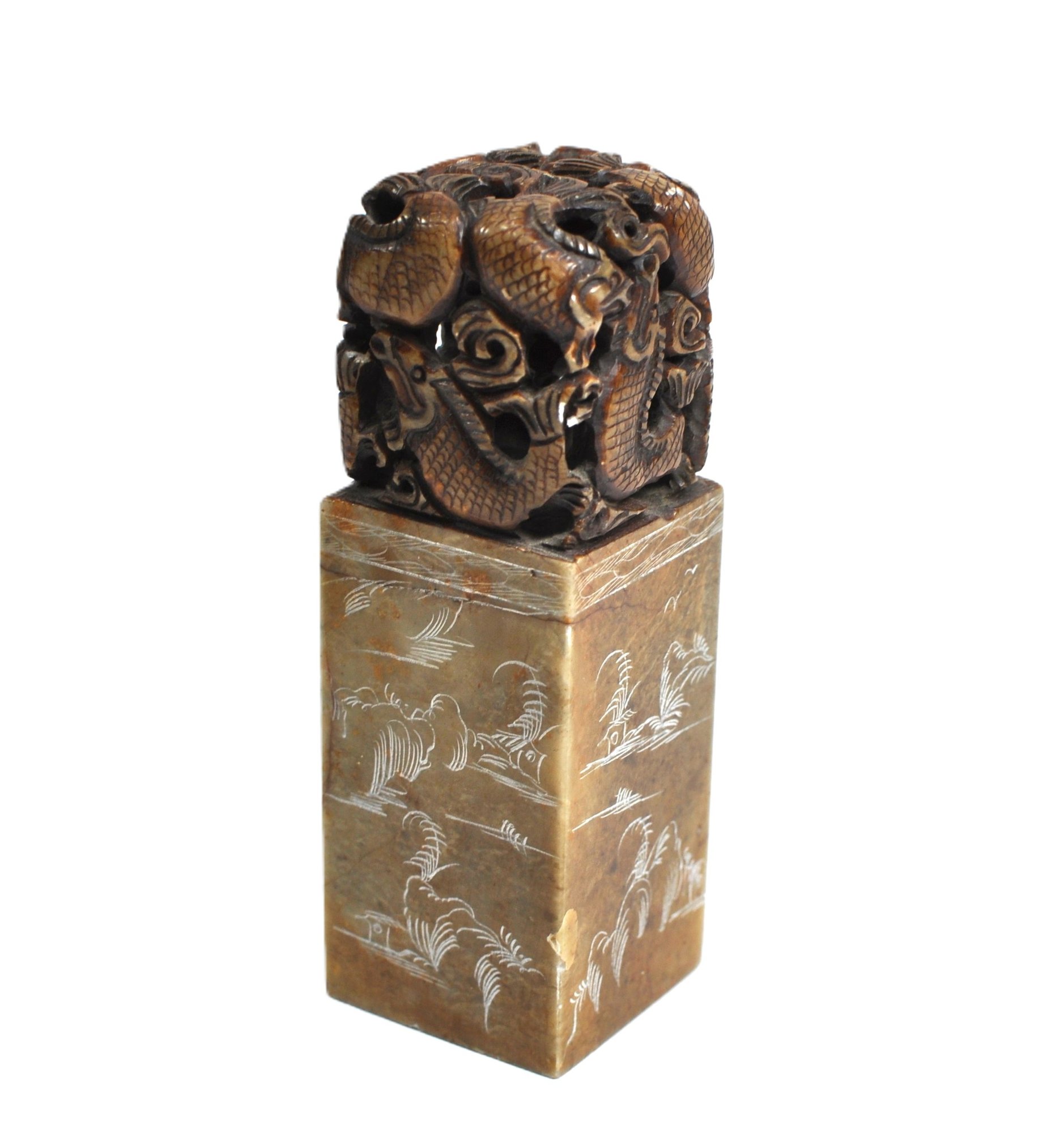 Rectangular carved stone seal topped with an intricately pierced dragon/ fish finial. The seal body is engraved on all sides with landscape scenes, birds, and calligraphic inscriptions, with a carved character seal mark on the base. Well-executed carving with attractive age patina, likely late Qing to early Republic period. Displays well as a scholar’s object or collector’s piece.
