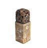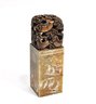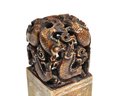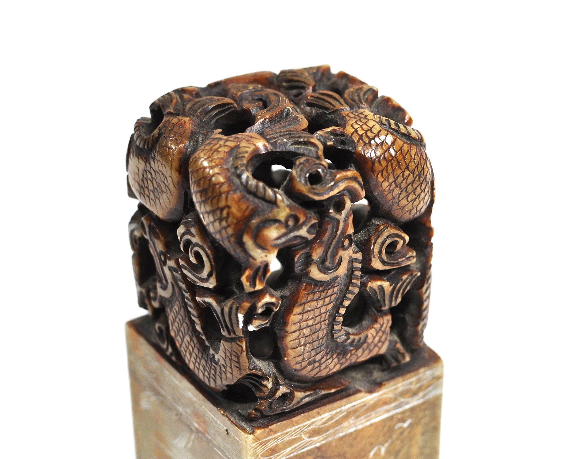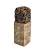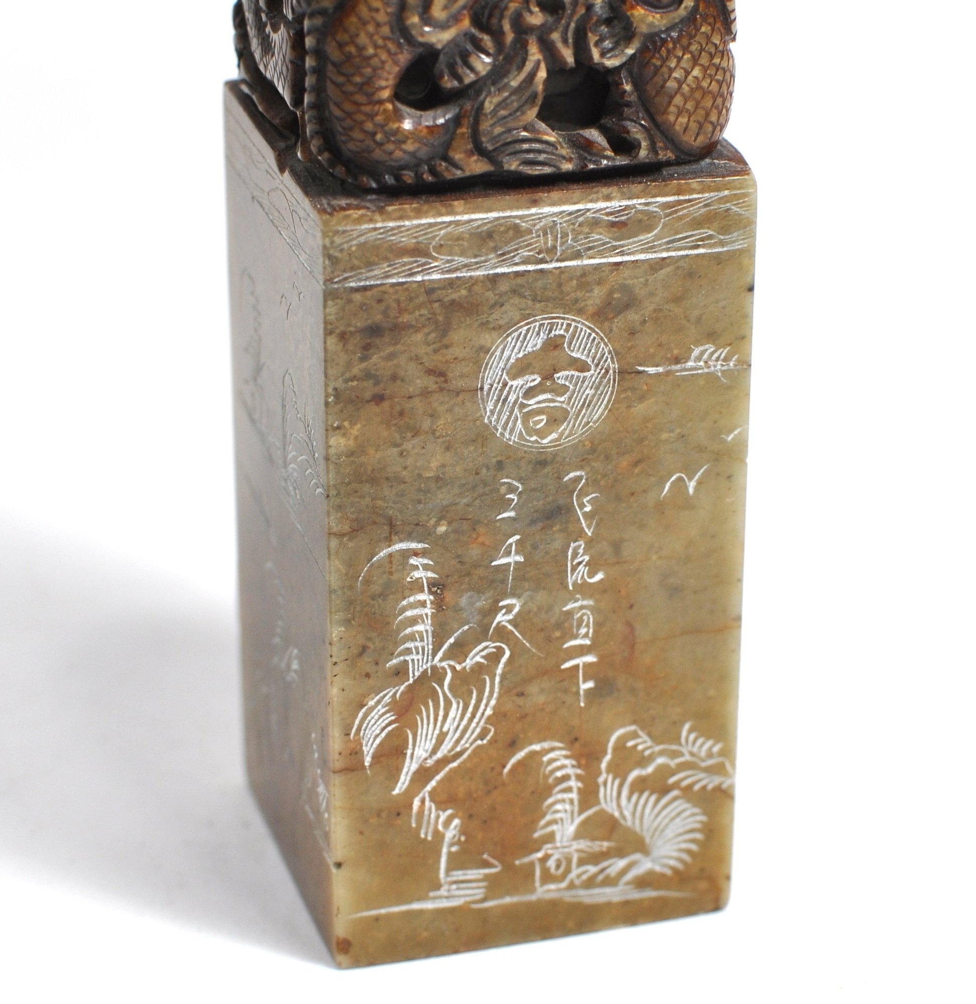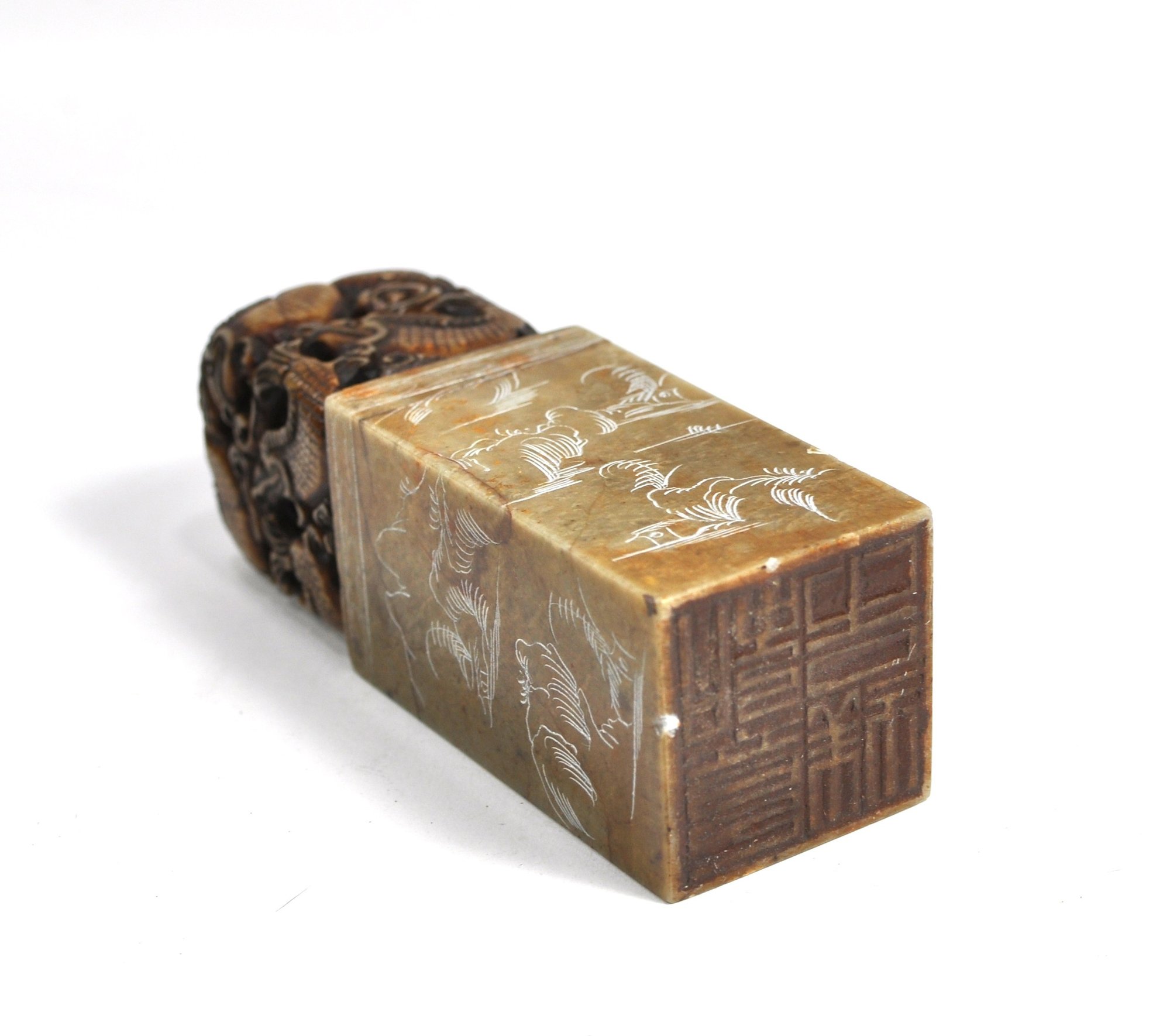Rectangular carved stone seal topped with an intricately pierced dragon/ fish finial. The seal body is engraved on all sides with landscape scenes, birds, and calligraphic inscriptions, with a carved character seal mark on the base. Well-executed carving with attractive age patina, likely late Qing to early Republic period. Displays well as a scholar’s object or collector’s piece.