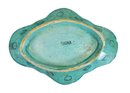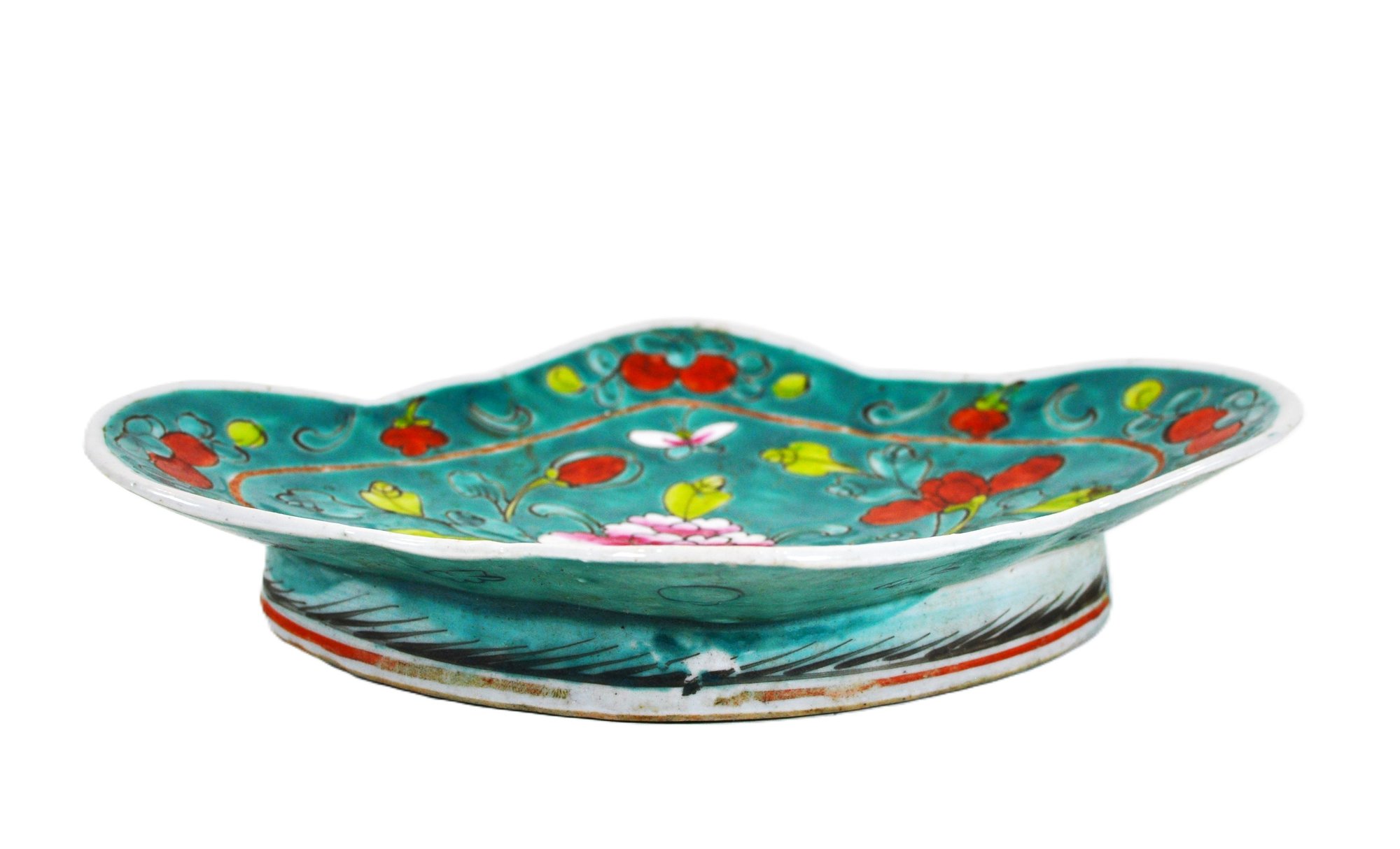 Attractive antique Chinese porcelain dish is a footed lobed serving plate, dating from the late 19th century to the early 20th century. It features a characteristic Famille Verte hand-painted floral pattern, with chrysanthemums and other blossoms on a vibrant turquoise or celadon green background.