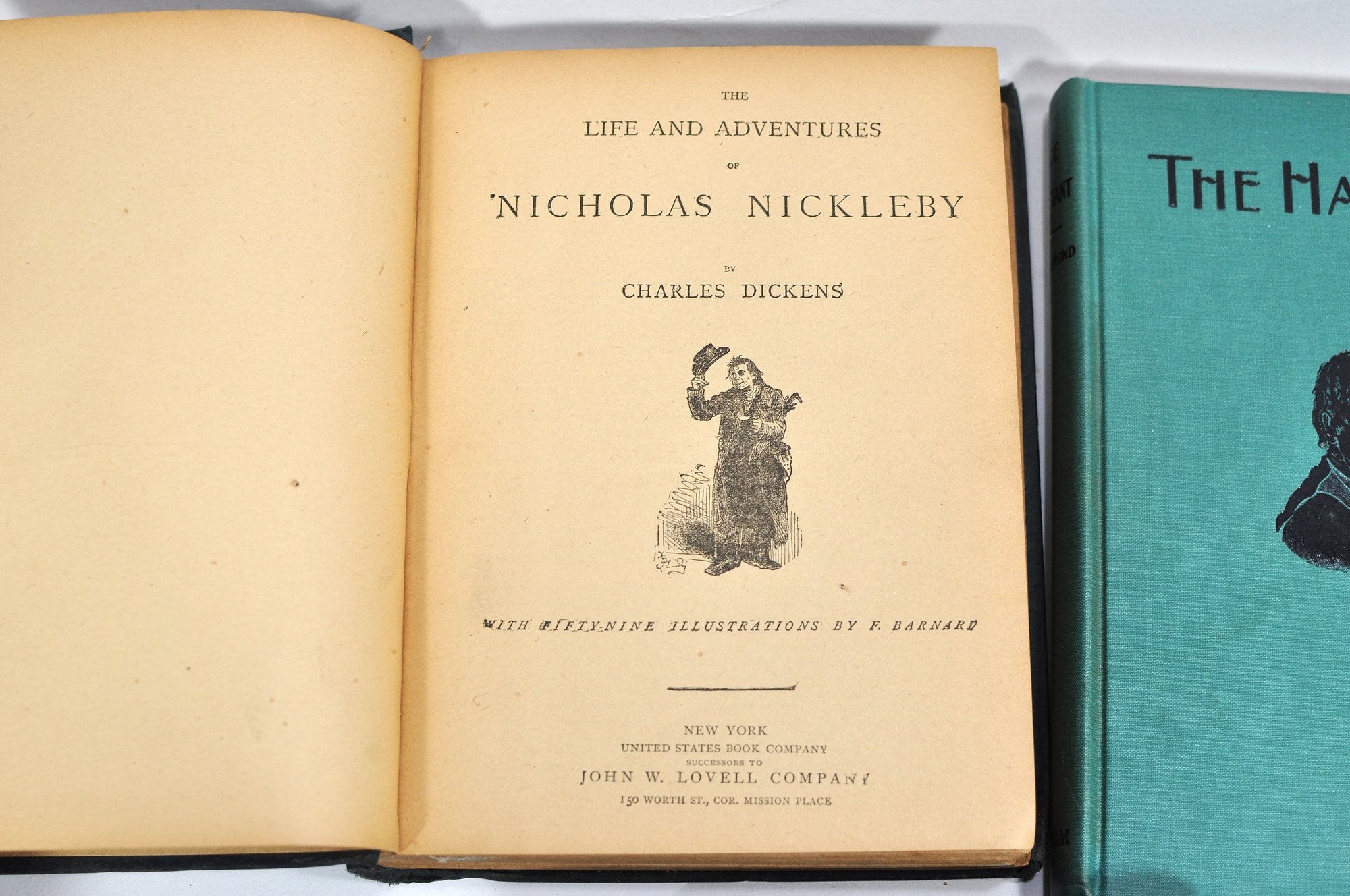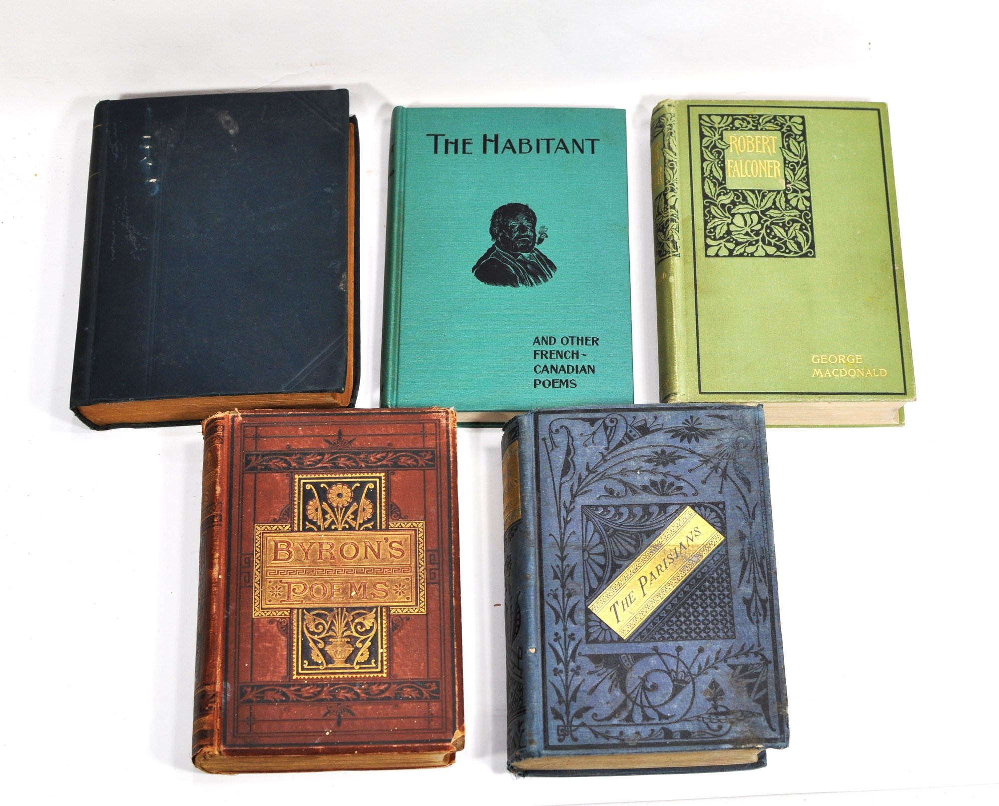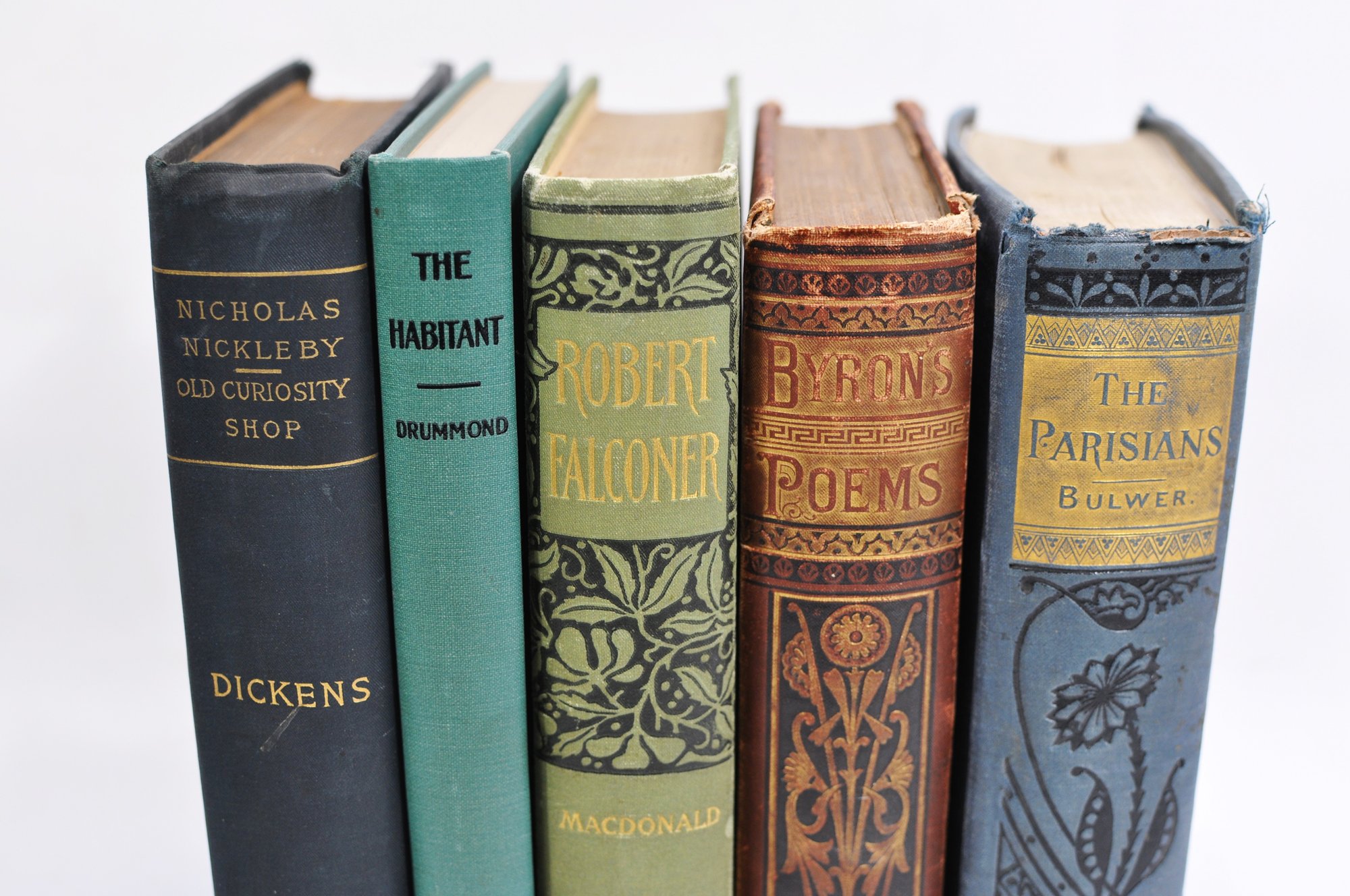 Group of five antique and vintage clothbound books featuring classic literary works, including Nicholas Nickleby by Charles Dickens, Byron’s Poems, The Parisians by Edward Bulwer-Lytton, Robert Falconer by George MacDonald, and The Habitant and Other French-Canadian Poems by William Henry Drummond.