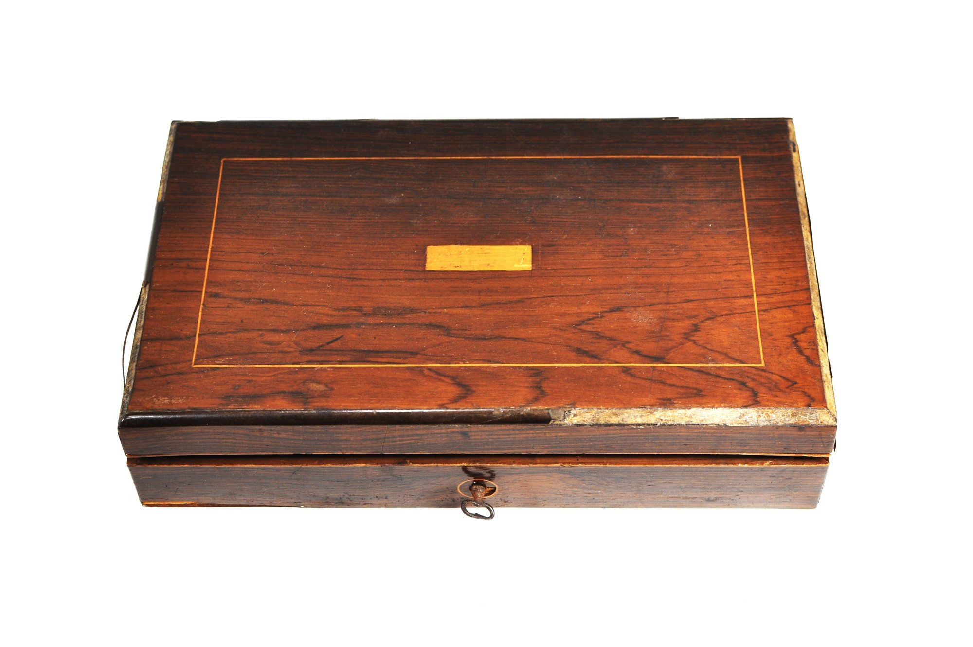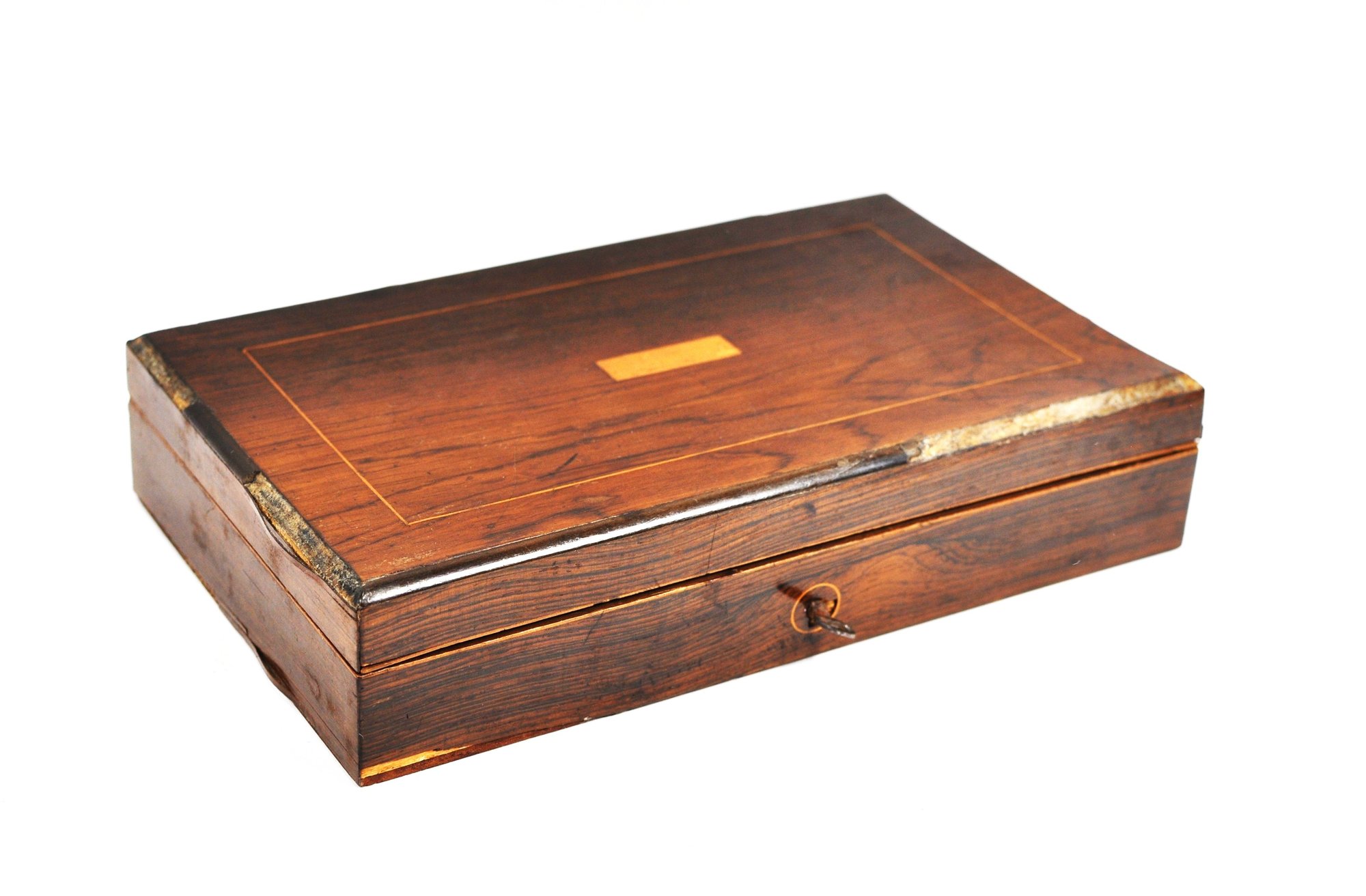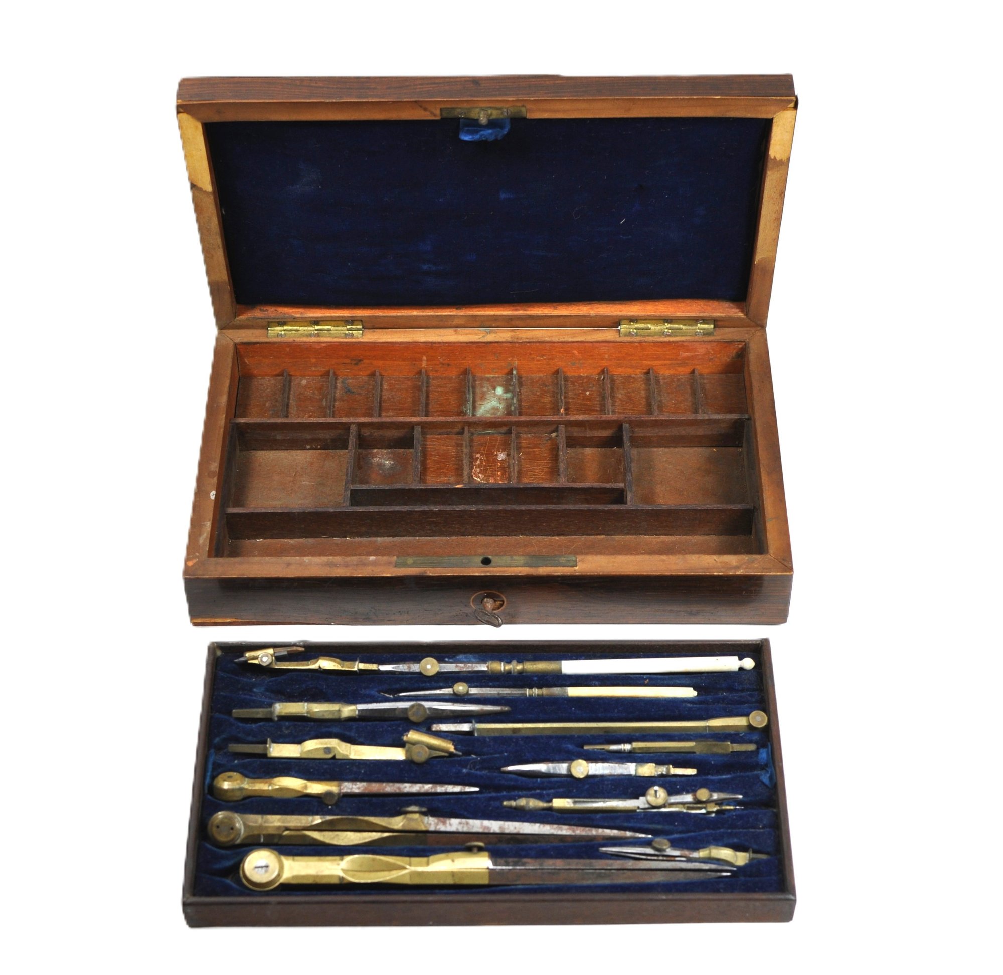 The case shows honest age and use, with edge wear, surface scratches, and some losses to the veneer consistent with age. The interior lining shows wear and discoloration, and some metal tools exhibit oxidation and patina. Overall, a genuine and appealing antique set suitable for collectors of scientific instruments, architects’ tools, or decorative desk display.
