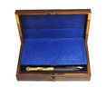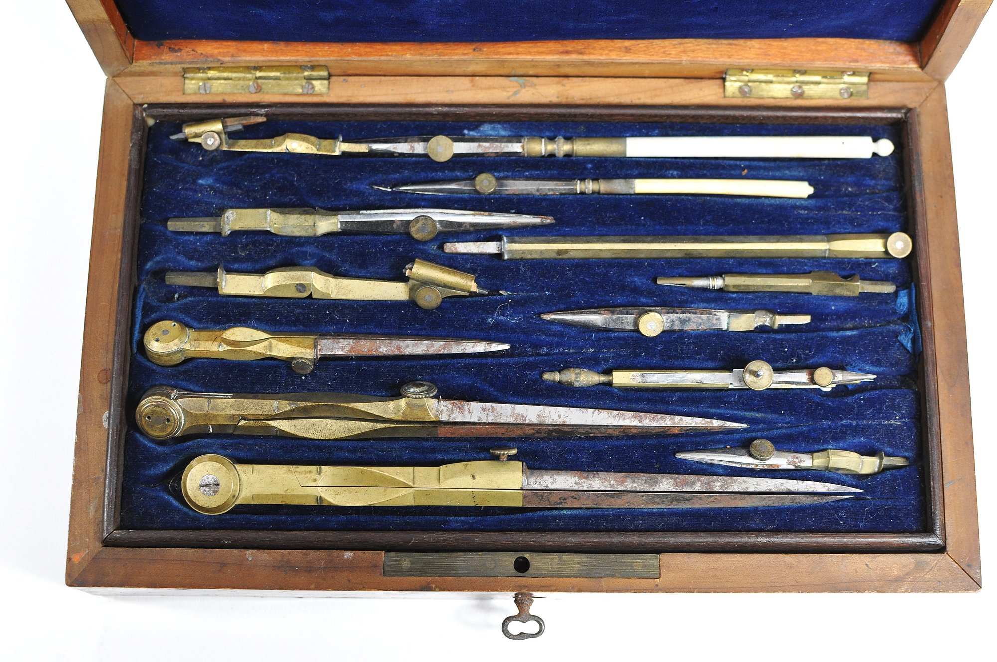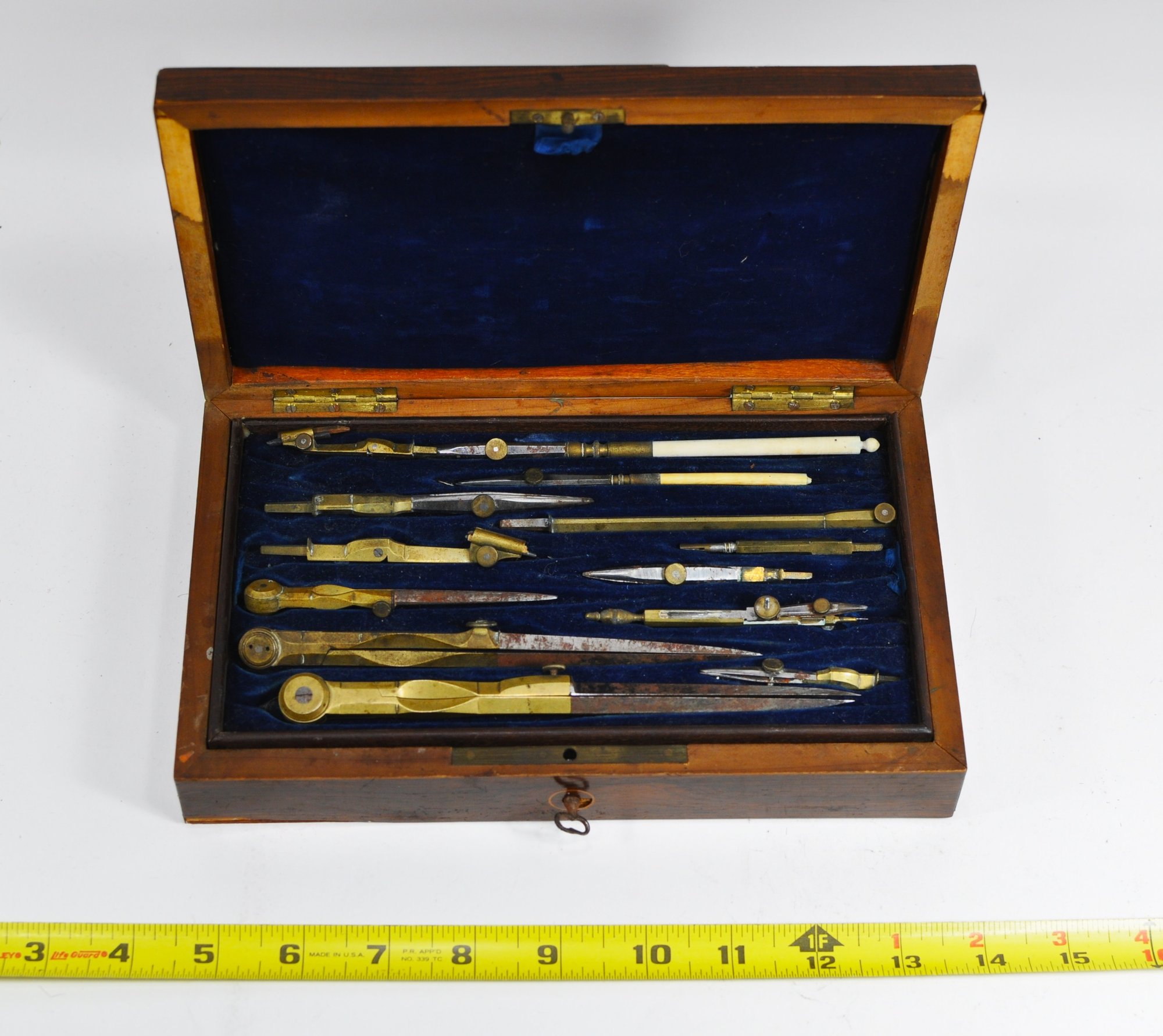 Offered is an attractive antique drafting and drawing instruments set housed in a fitted wooden case with decorative inlay and original key. The interior is lined in blue velvet and contains a variety of brass and steel instruments including compasses, dividers, ruling pens, and related drafting tools, arranged in a removable tray with additional compartments beneath.