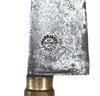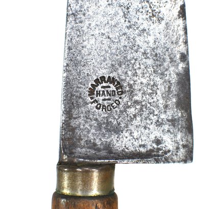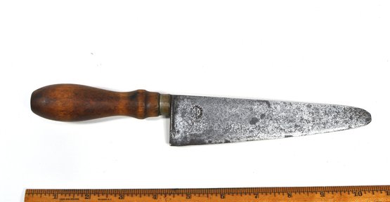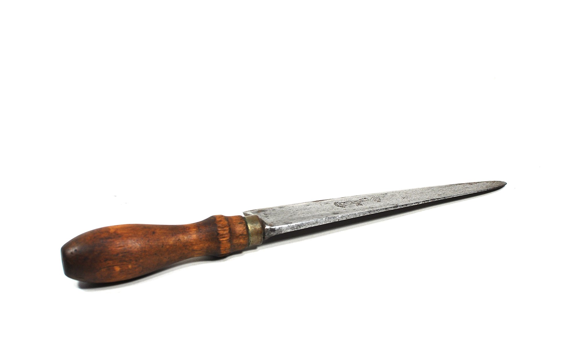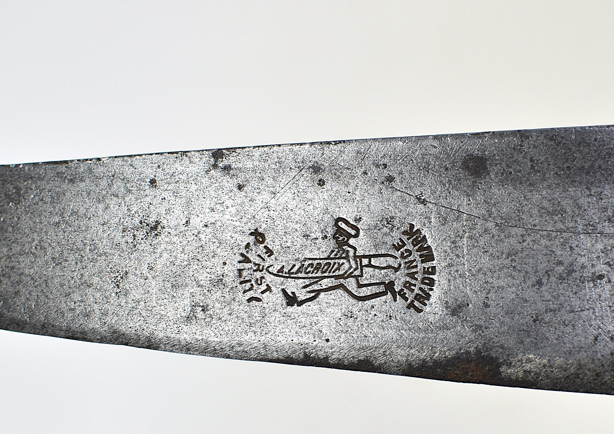 Antique French carbon steel kitchen knife marked “Lacroix France Depose” with running figure logo, likely Thiers production, late 19th–early 20th century. Hand-forged blade with age patina and wear; wooden handle with metal ferrule. Structurally sound, edge would benefit from sharpening.