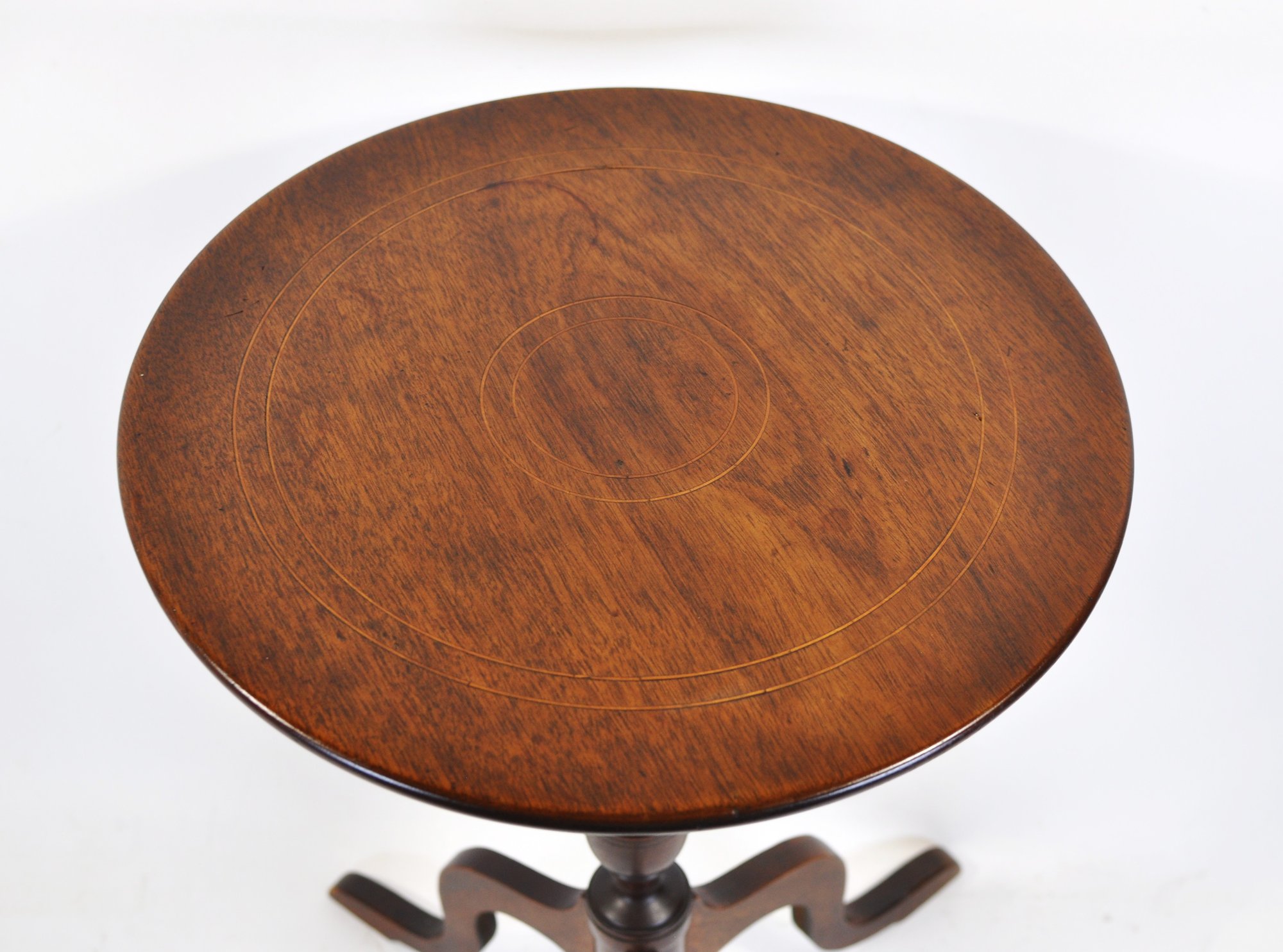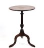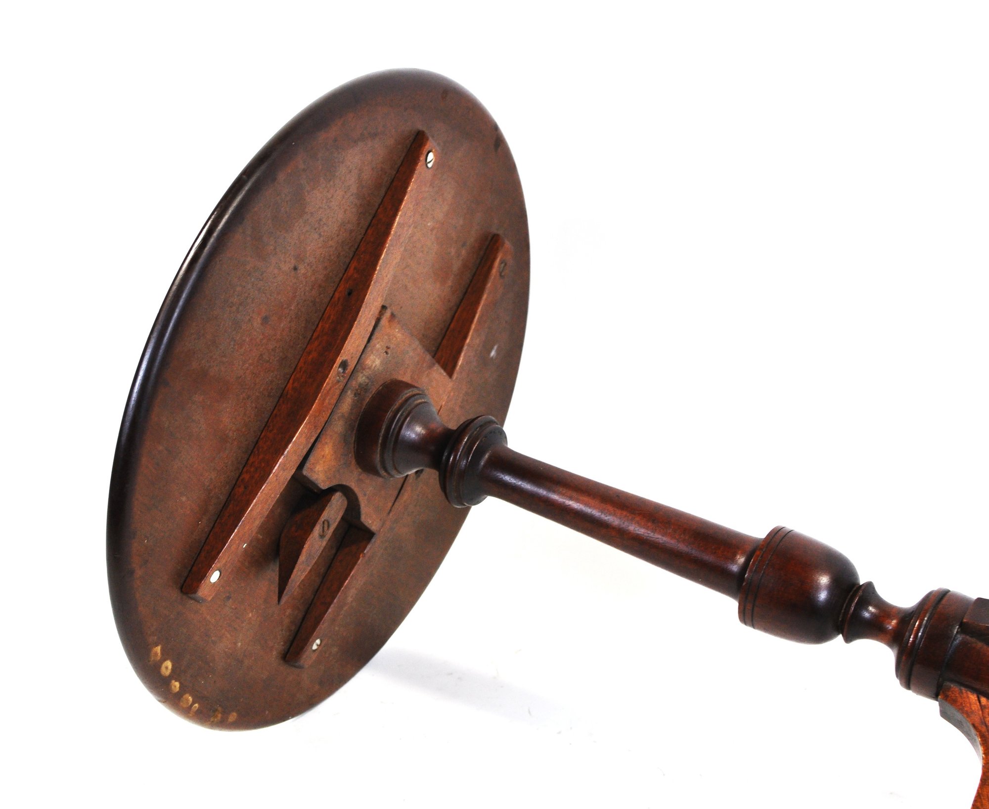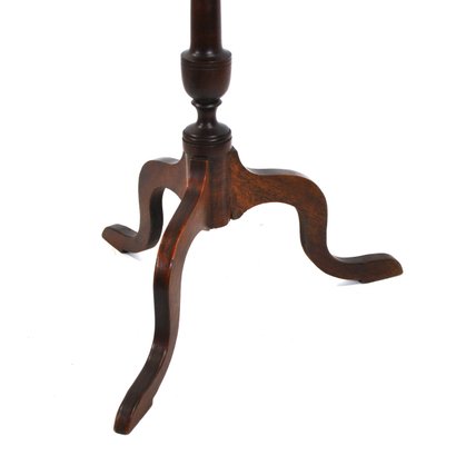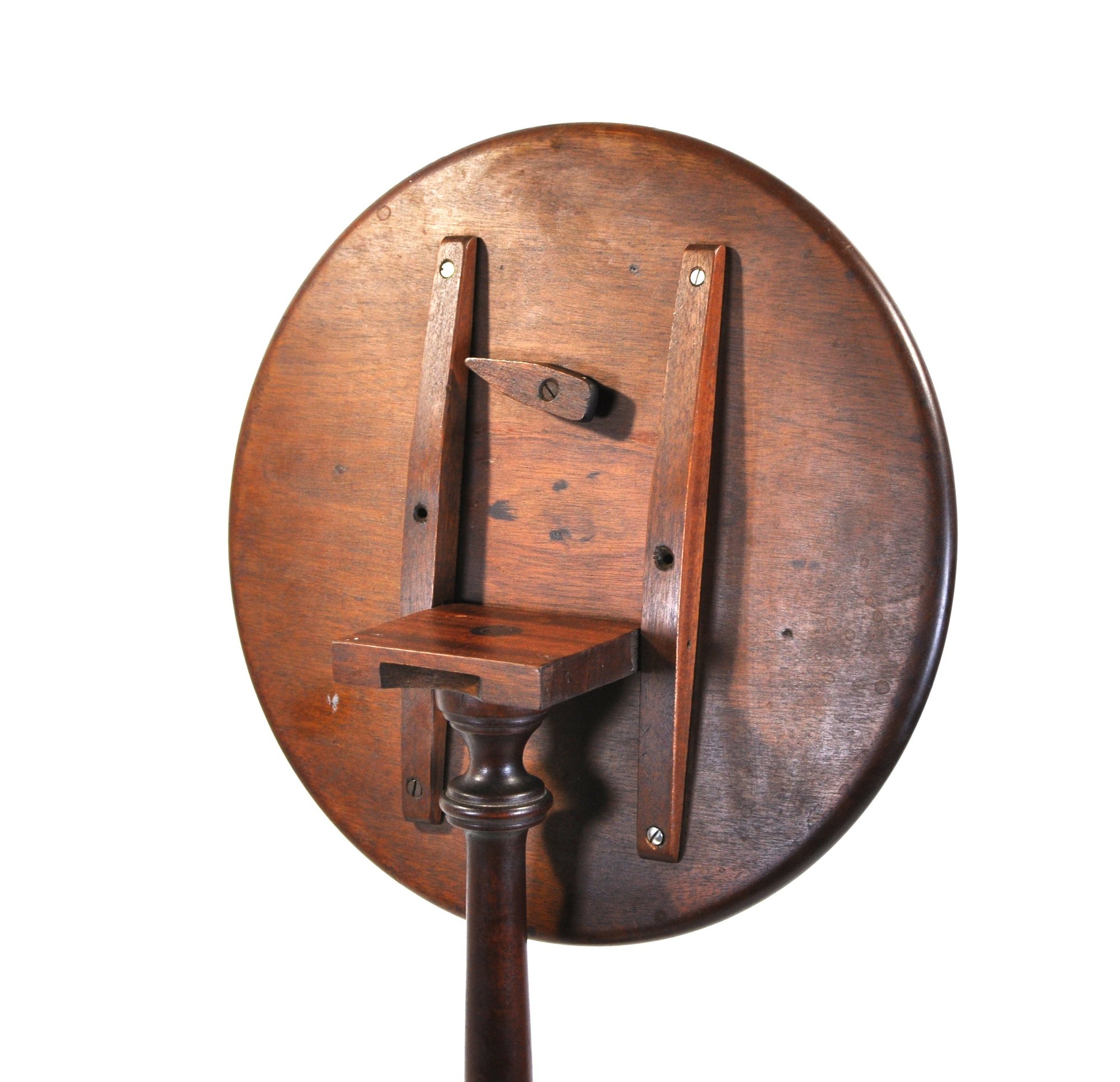 Elegant antique round pedestal side table in the Georgian taste, crafted in mahogany with a turned column support and graceful three-leg cabriole base. The circular top tilts vertically for storage or display, secured by the original wooden catch mechanism underneath.