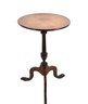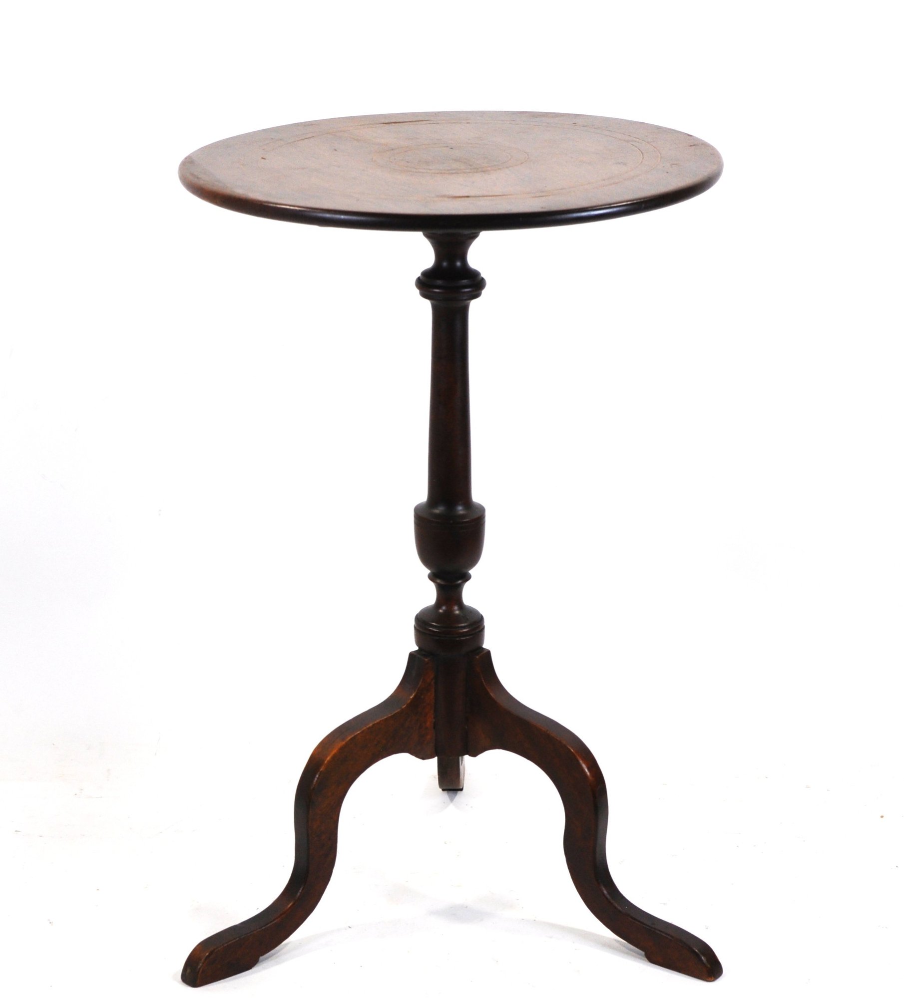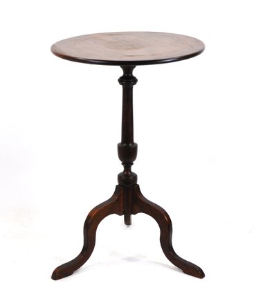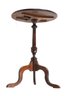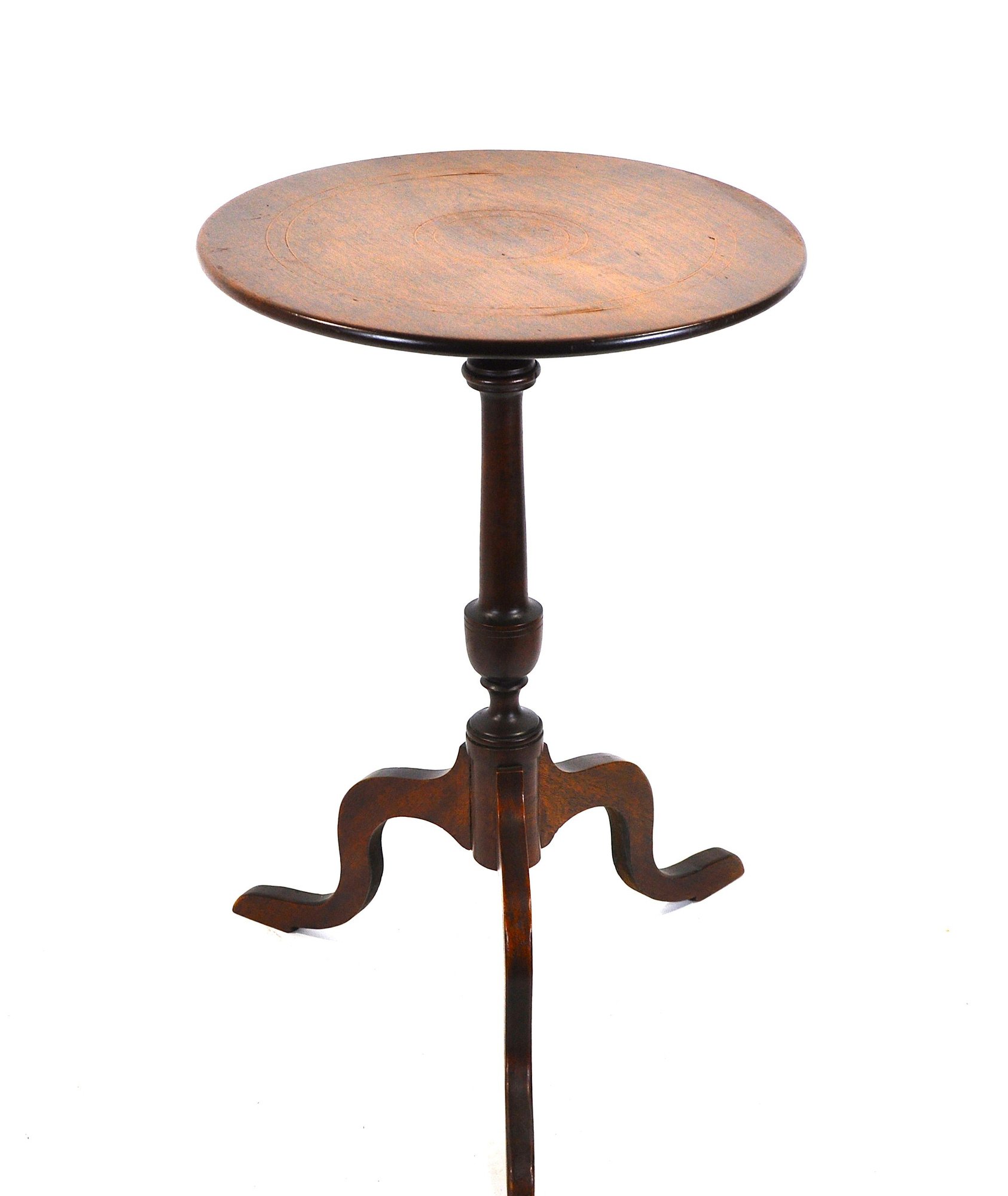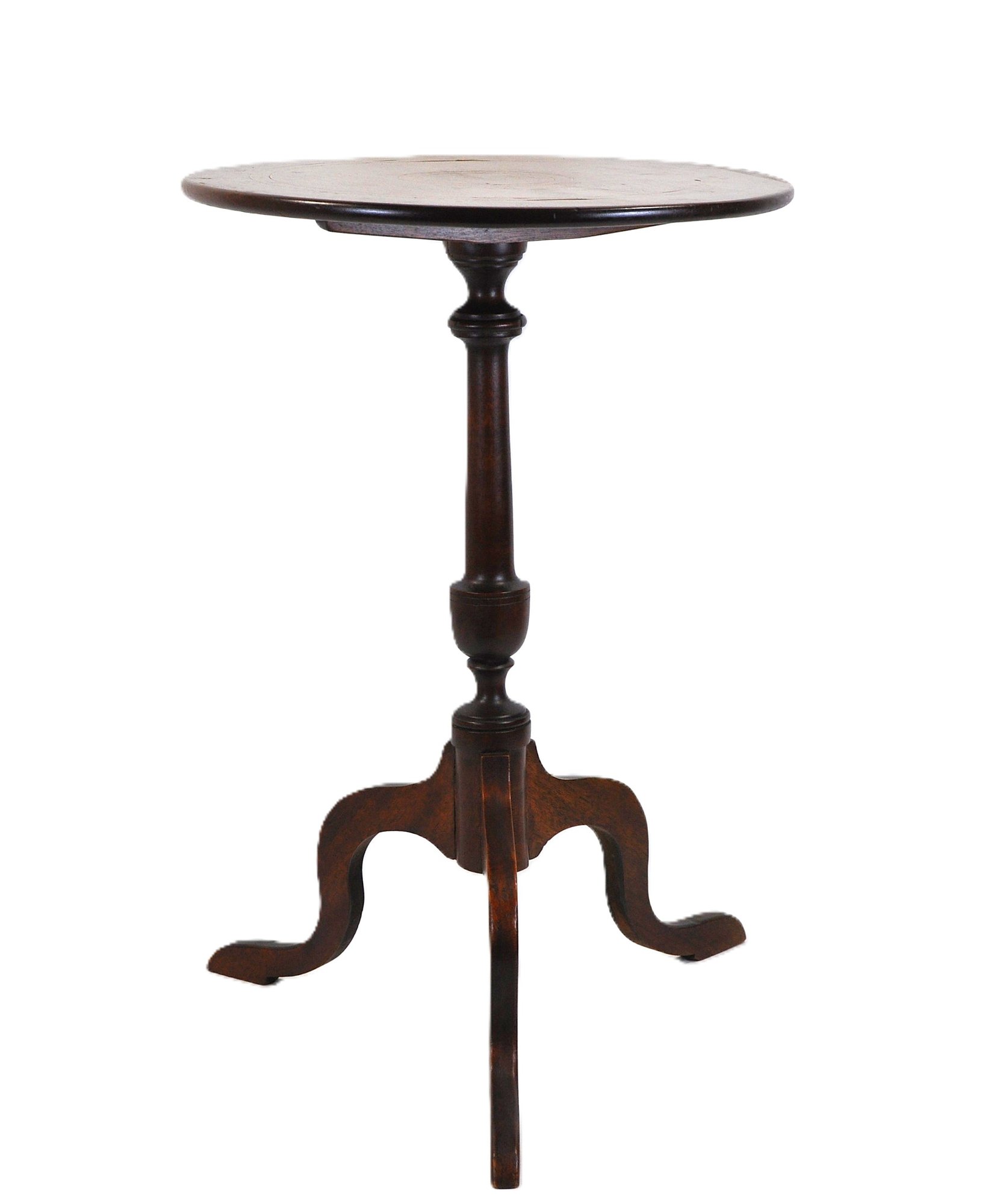 Elegant antique round pedestal side table in the Georgian taste, crafted in mahogany with a turned column support and graceful three-leg cabriole base. The circular top tilts vertically for storage or display, secured by the original wooden catch mechanism underneath.