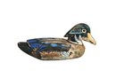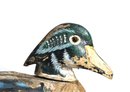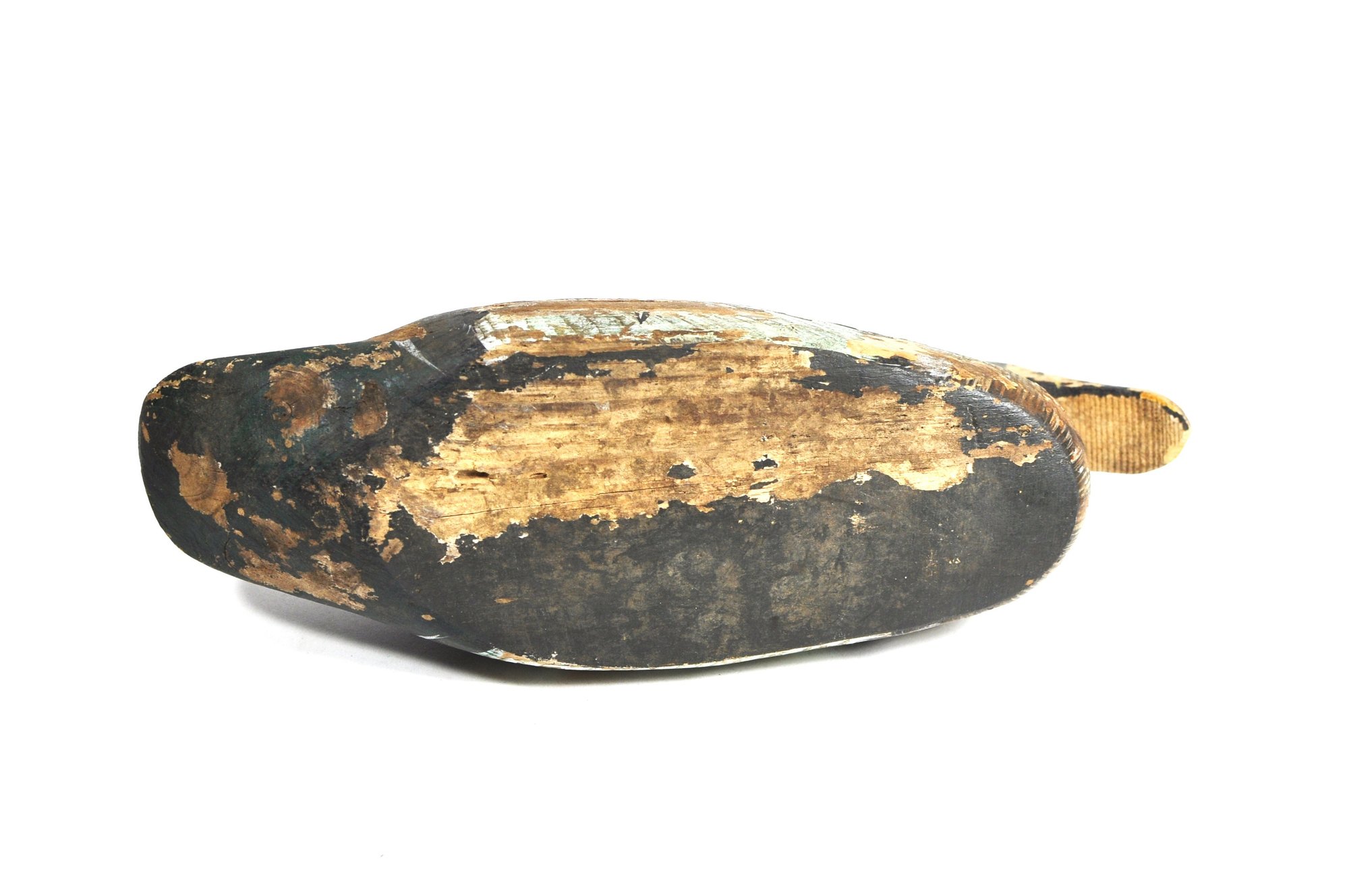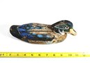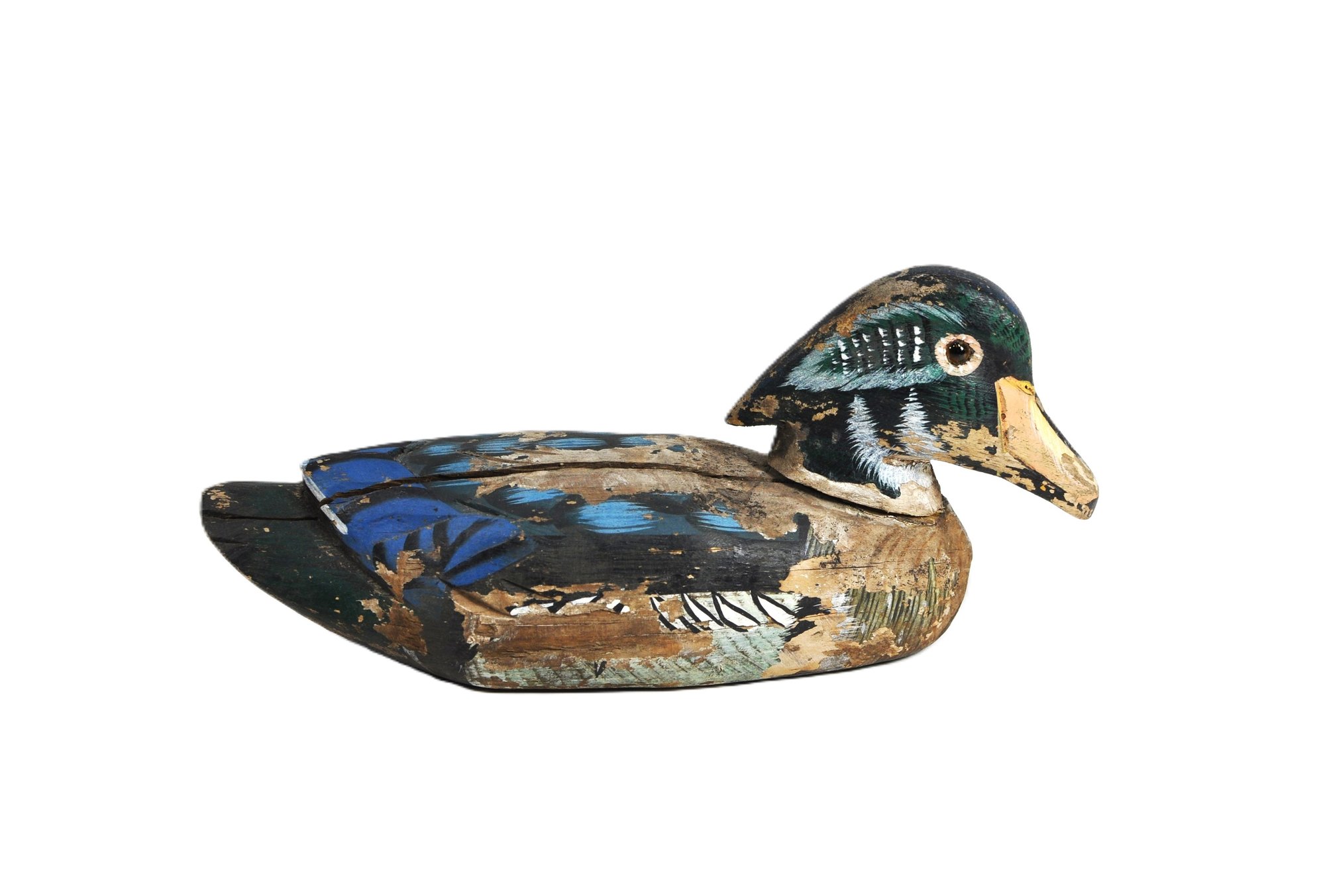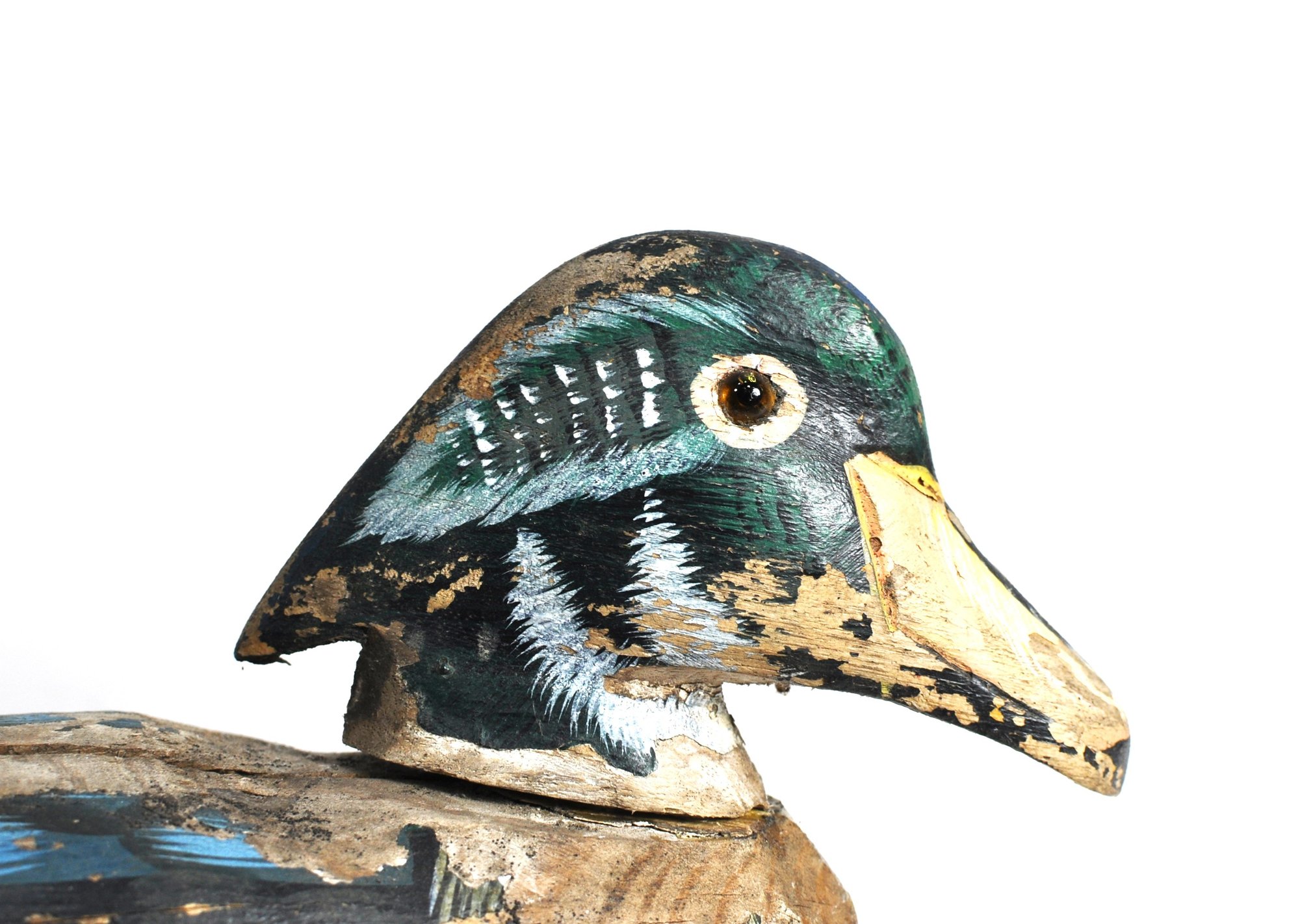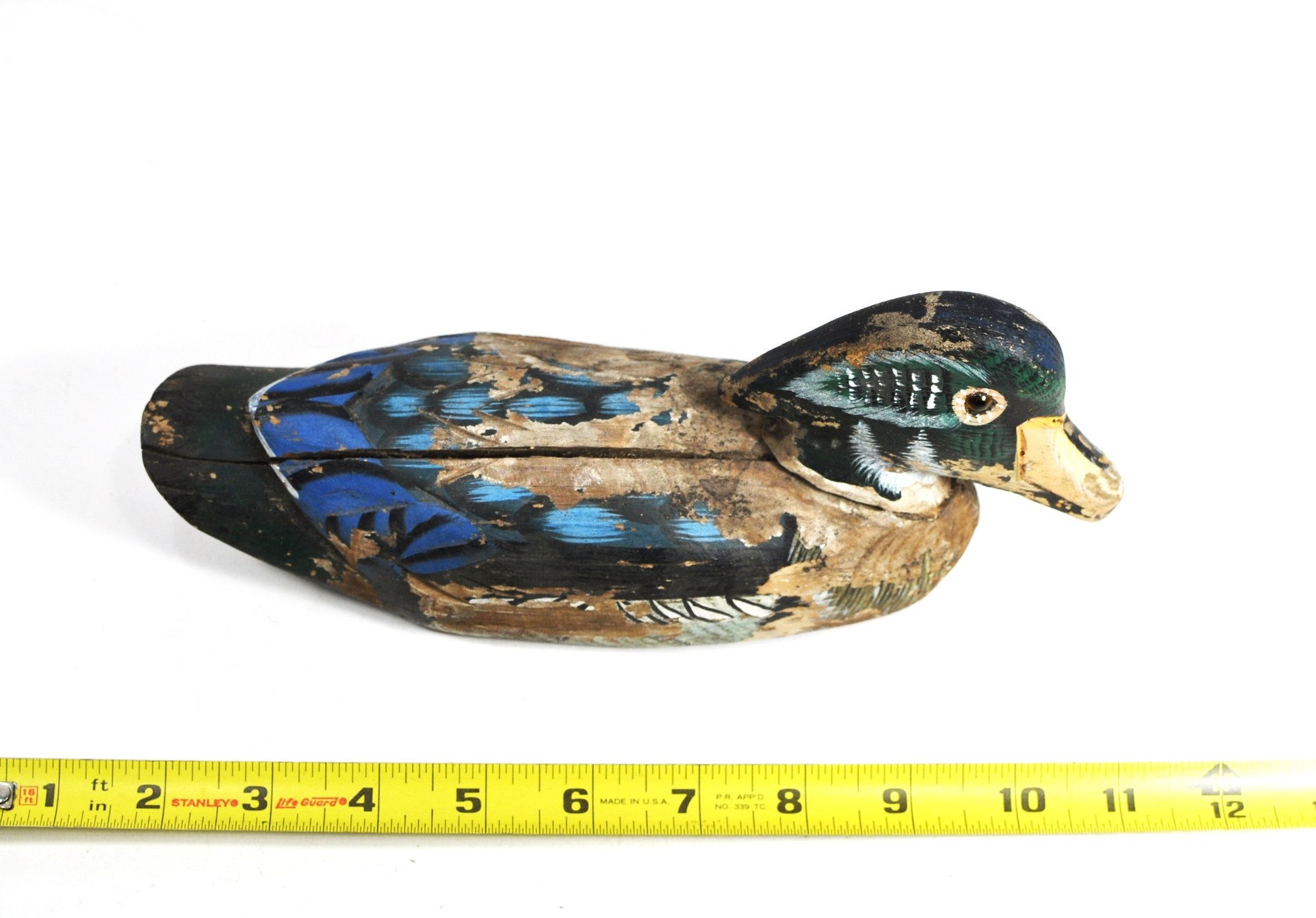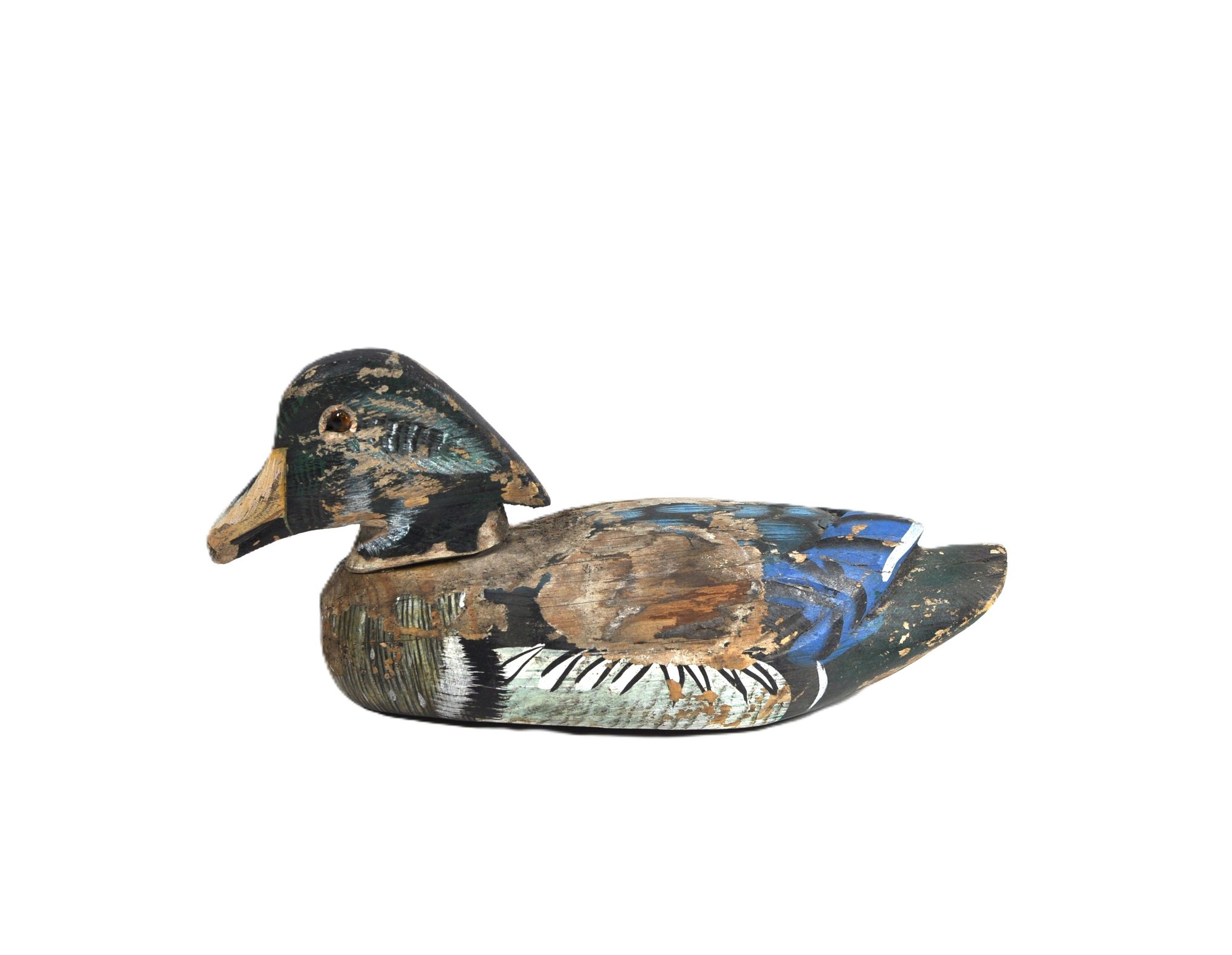Antique hand-carved wooden duck decoy, likely early to mid-20th century. Carved in a classic hollow-body form with applied head and original hand-painted surface showing expressive brushwork in greens, blues, browns, and cream tones. Retains a wonderful, honest patina from age and use.