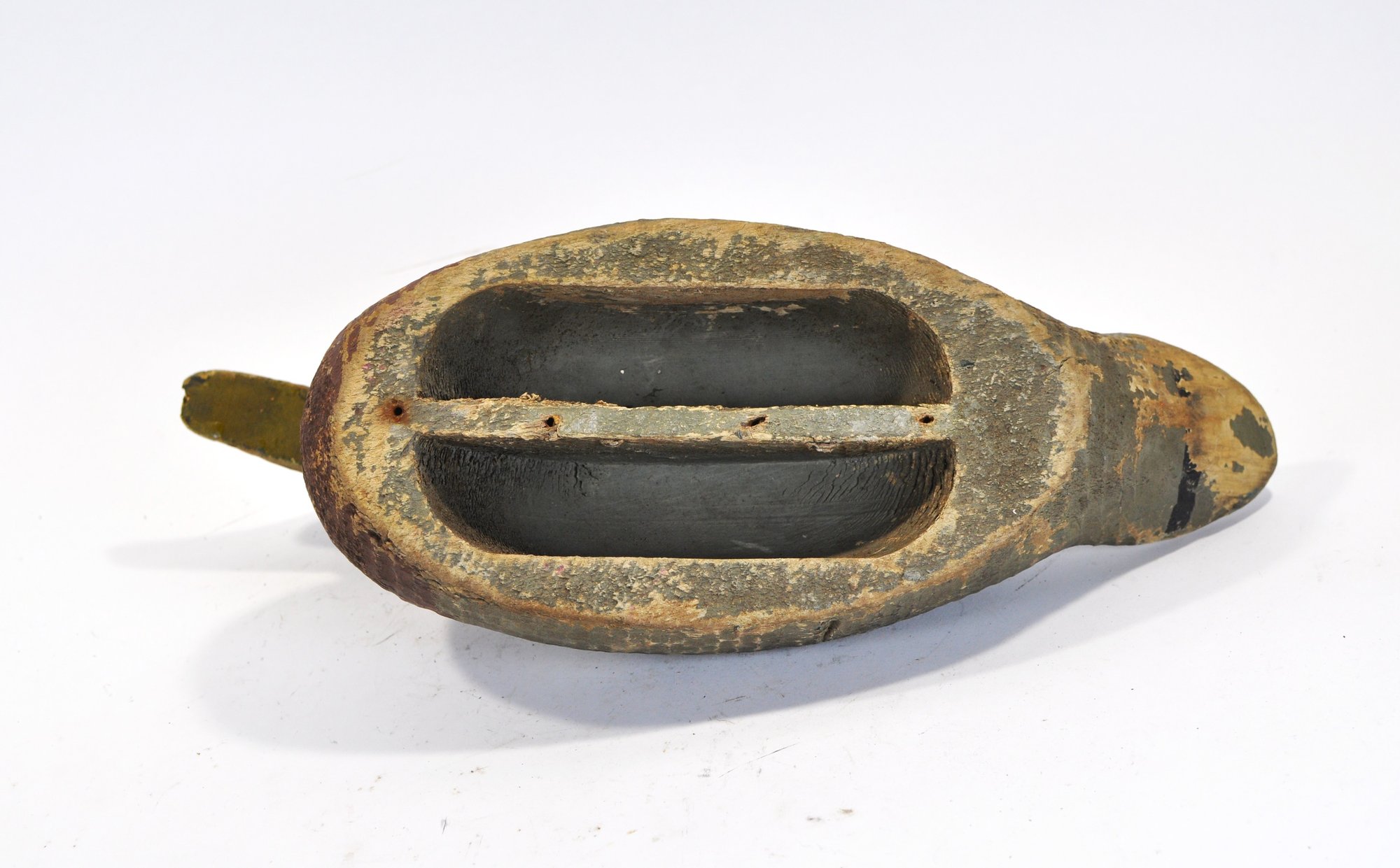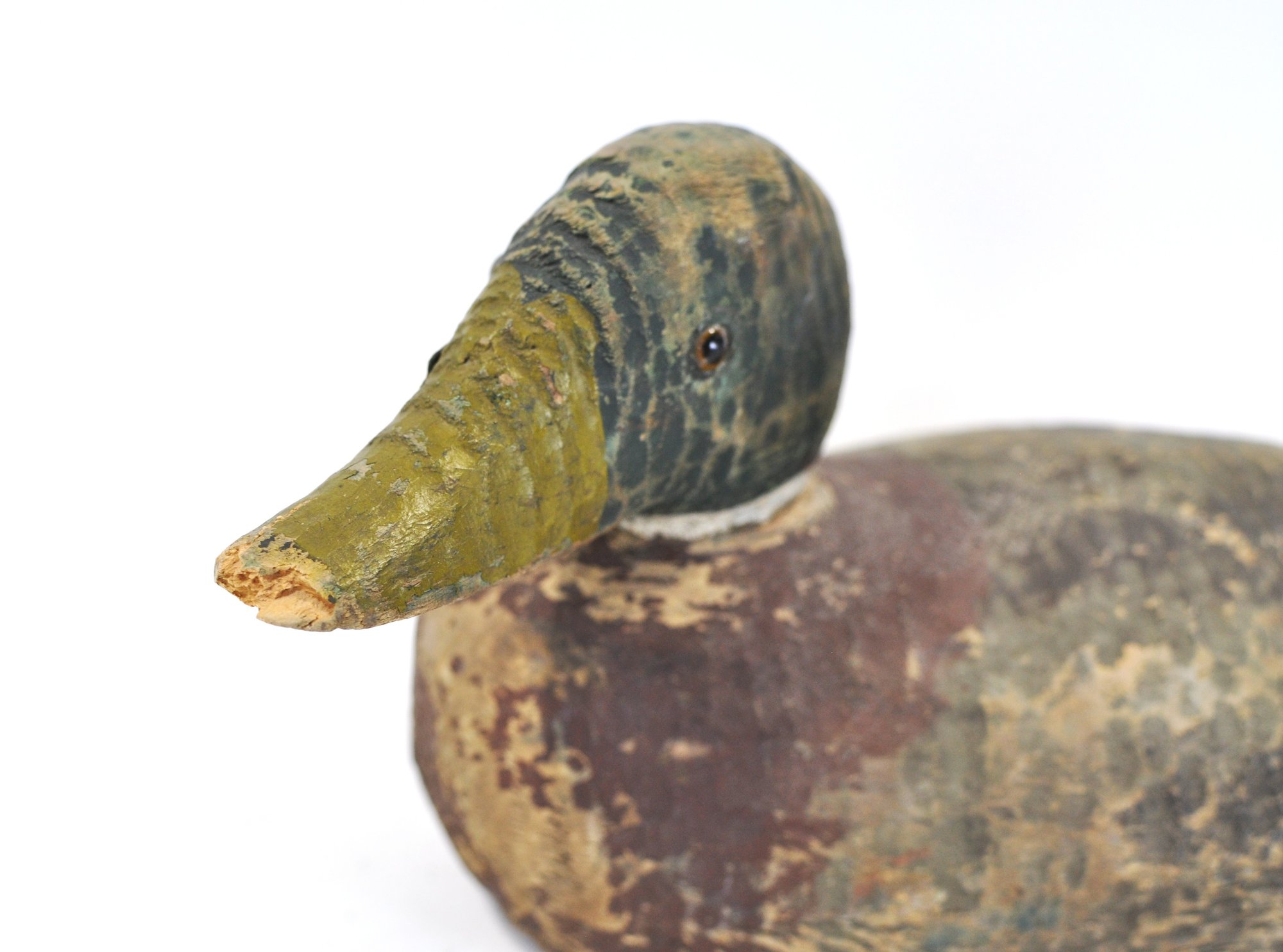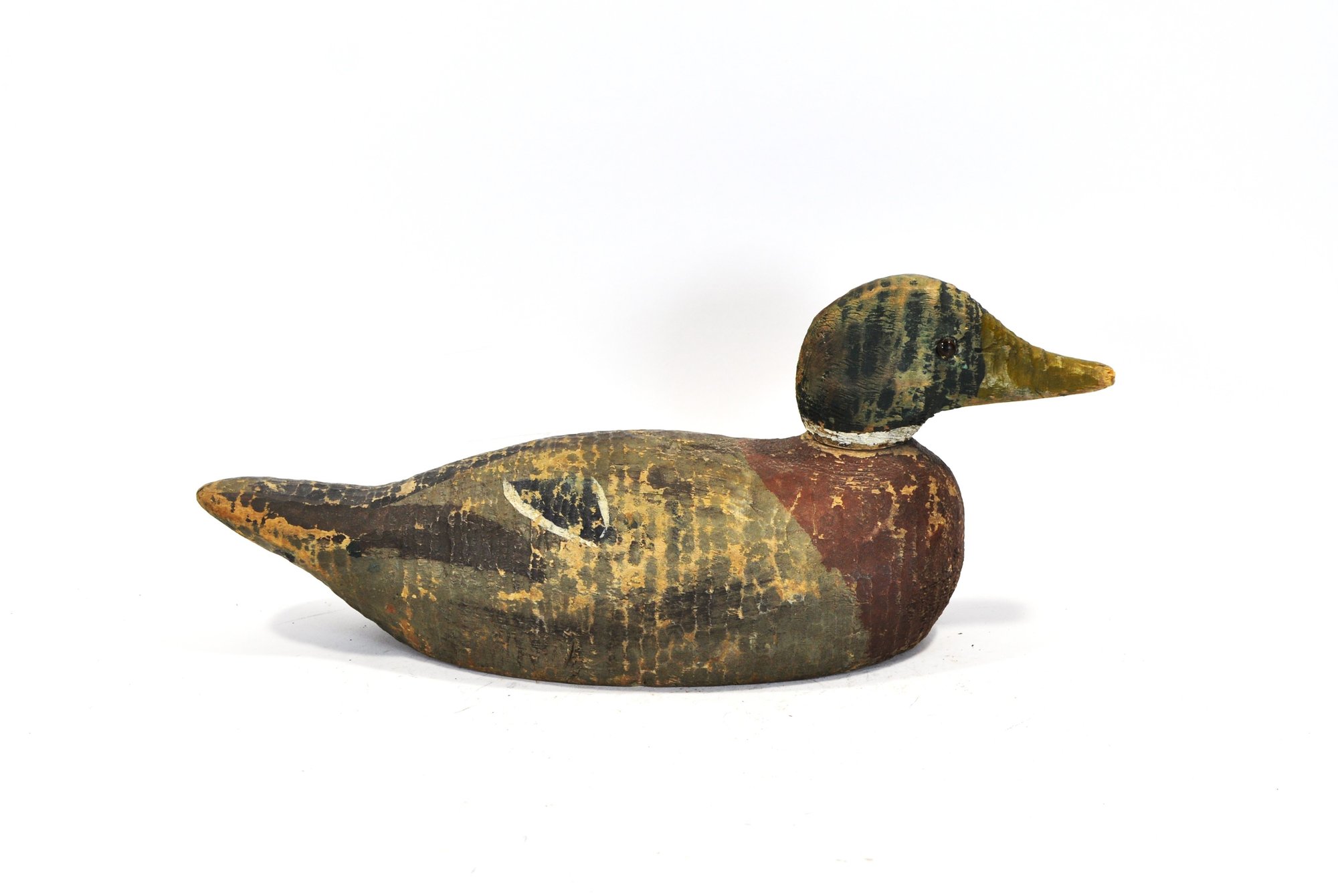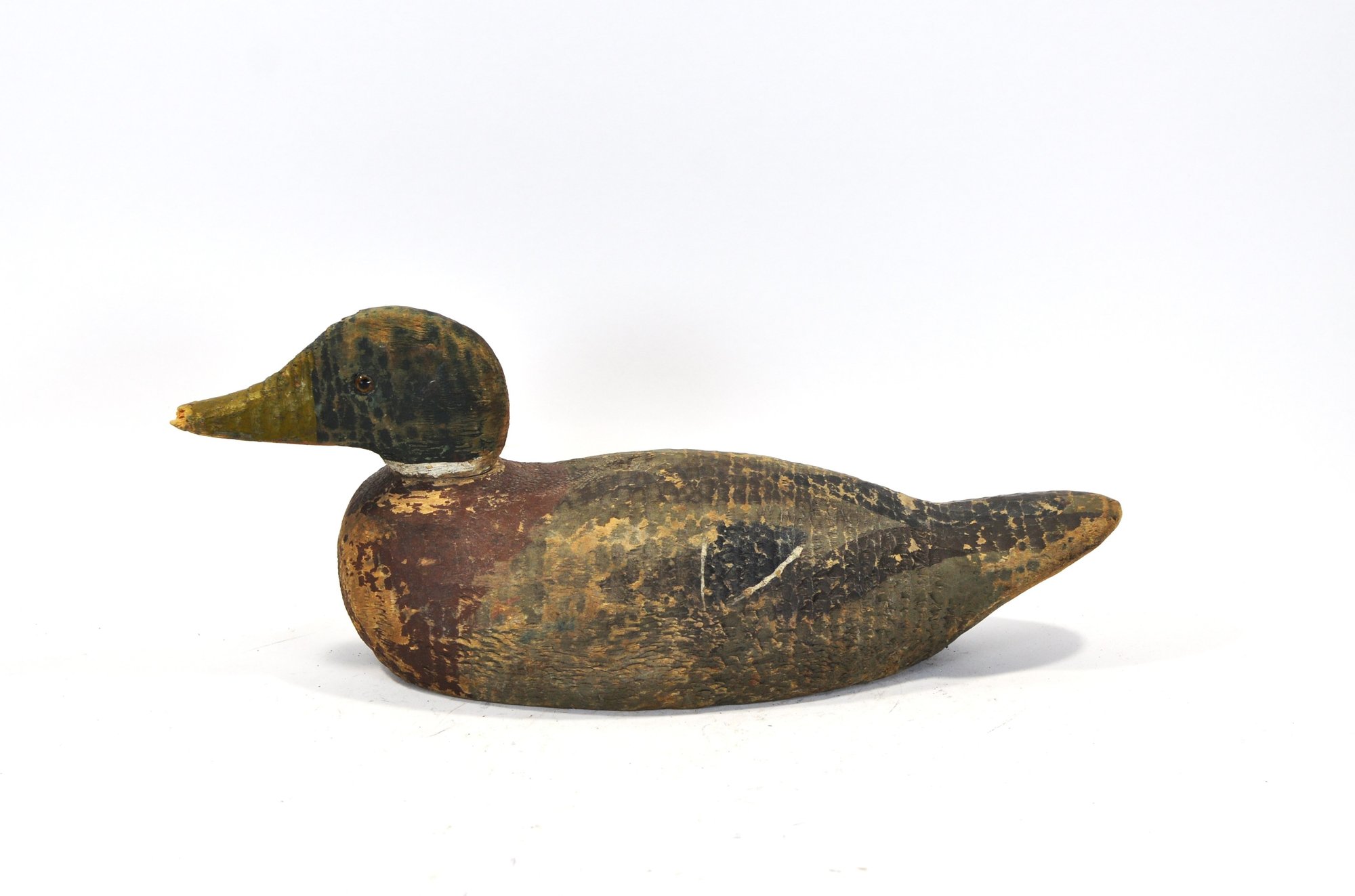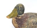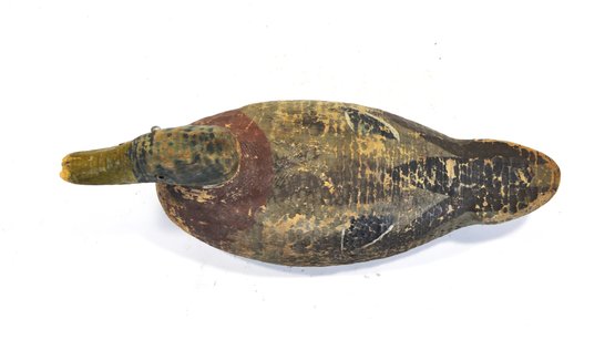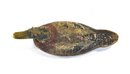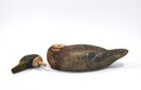 Early hand-carved wooden duck decoy with hollow body construction and original worn paint. Features carved feather texture, tack eyes, and a separately carved head (now detached) with original peg. Strong aged patina from field use.