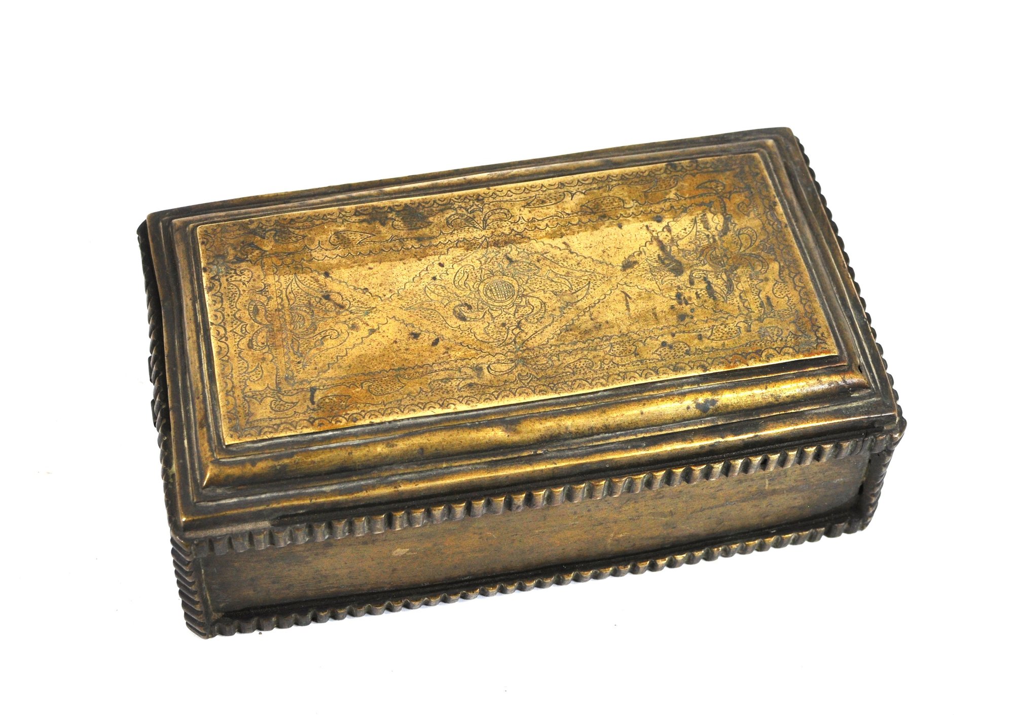 A rectangular antique brass box featuring finely engraved geometric and floral motifs on the lid, bordered by a raised, beaded edge. The intricate patterning suggests Middle Eastern or Indo-Persian craftsmanship, likely 19th century. Hinged lid opens to reveal an aged, oxidized interior.