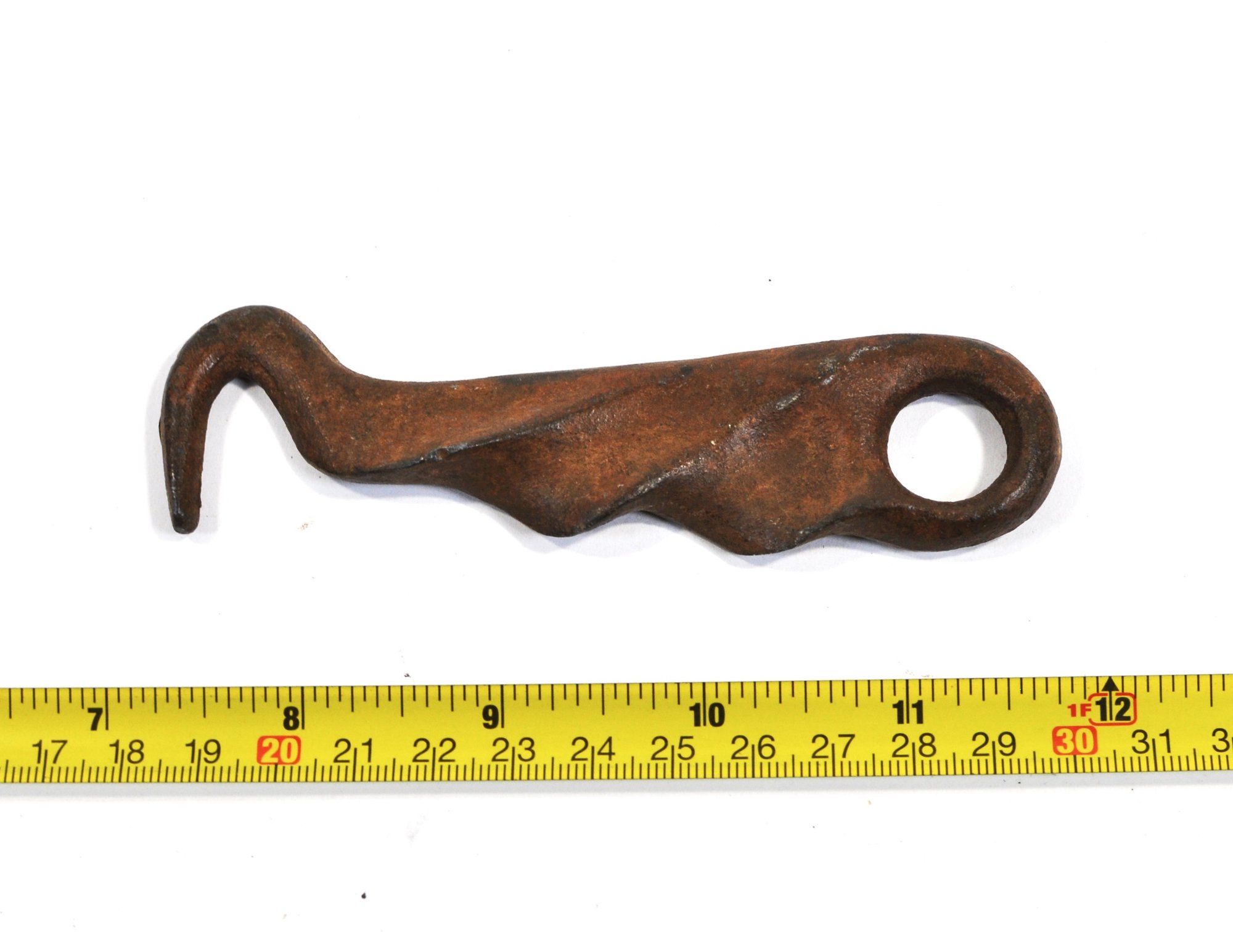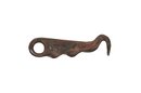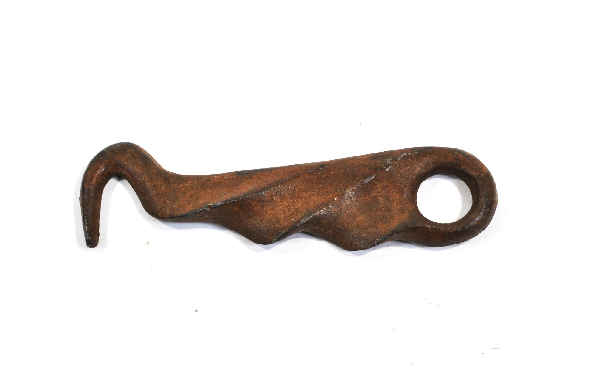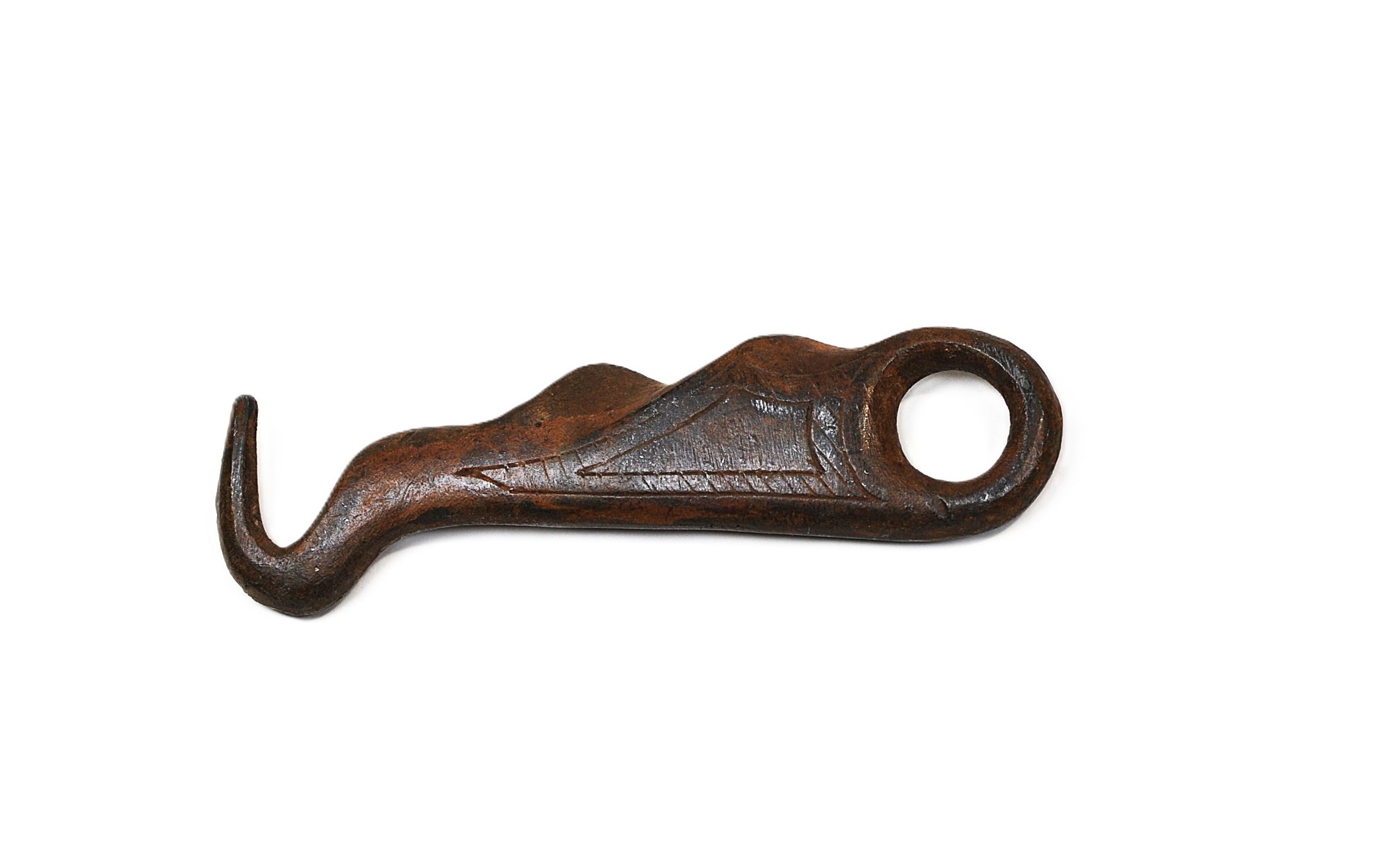 Antique hand-forged metal hook, featuring an integrated finger-grip handle and a curved working hook at one end. Crafted from heavy non-magnetic metal, with etched decoration on one side and a sculpted grip handle on the reverse, showing a naturally developed dark brown patina.