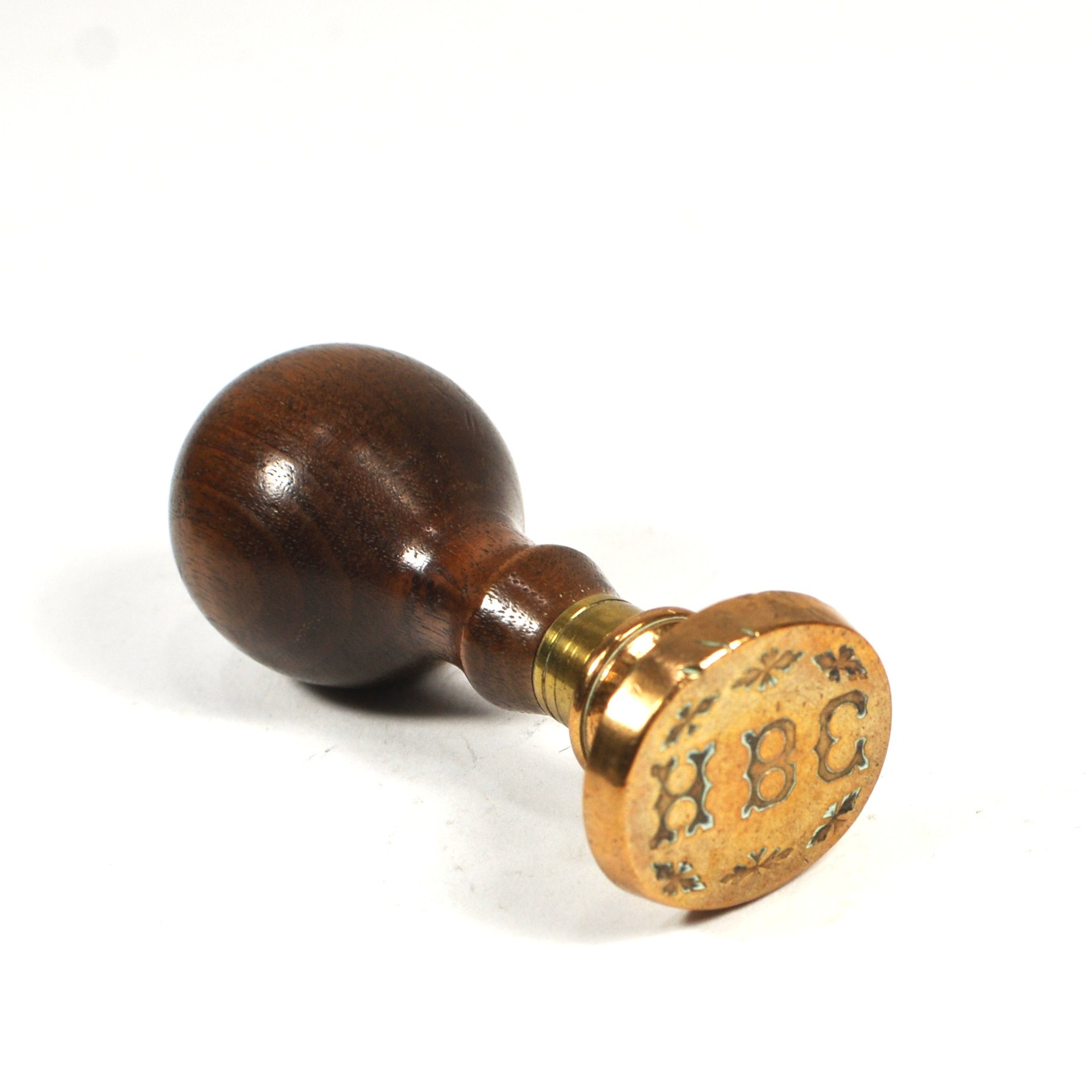 Antique wax document seal featuring a turned wooden handle fitted with a brass seal matrix. The circular face is finely engraved with the monogram “HBC”, surrounded by small decorative floral/star motifs, designed to leave an intaglio impression in sealing wax. A classic personal desk seal used for letters and documents, likely dating to the 19th century.