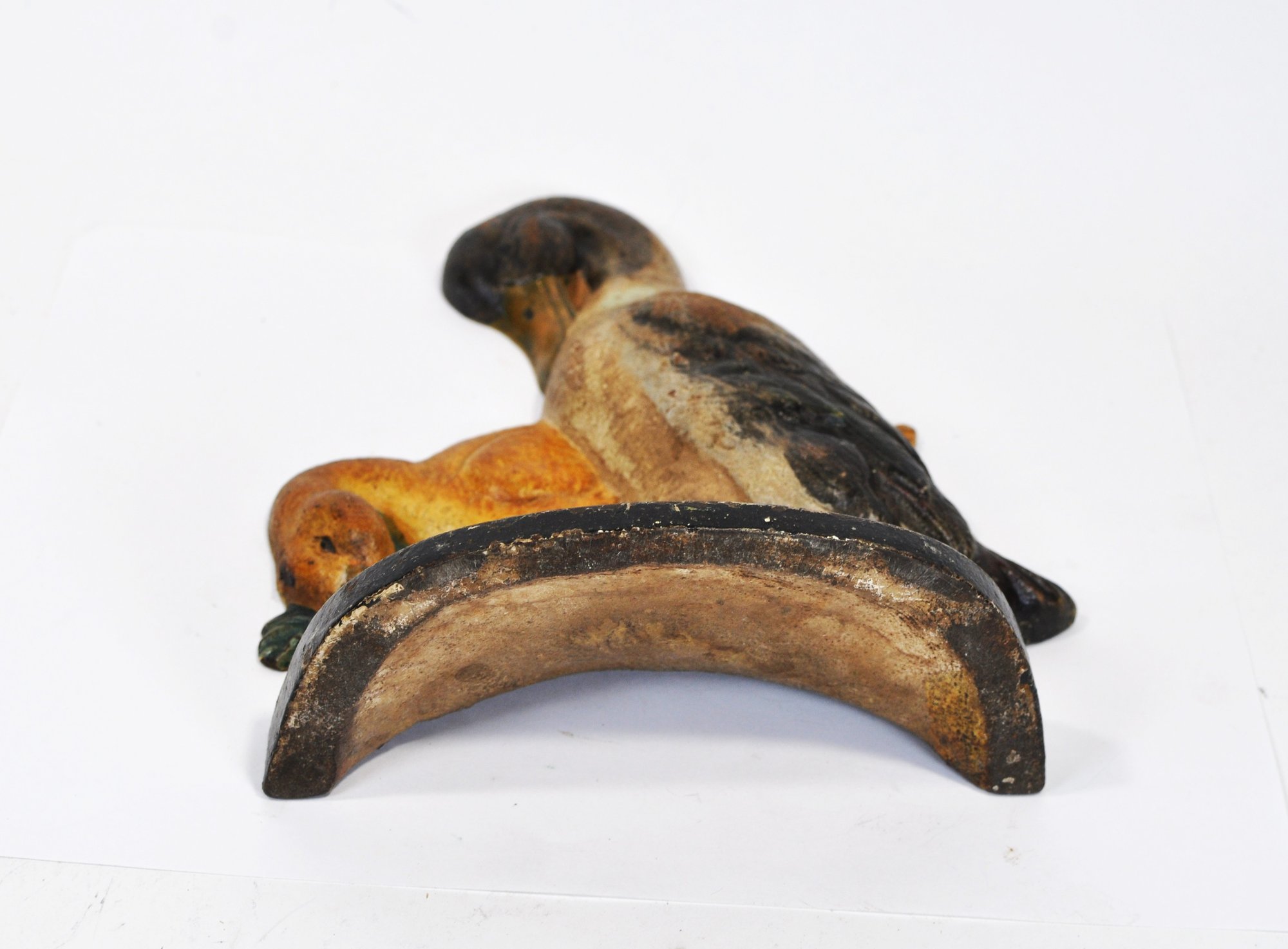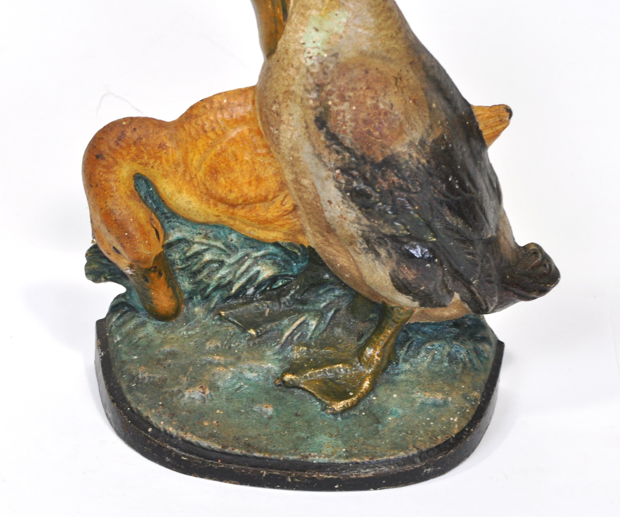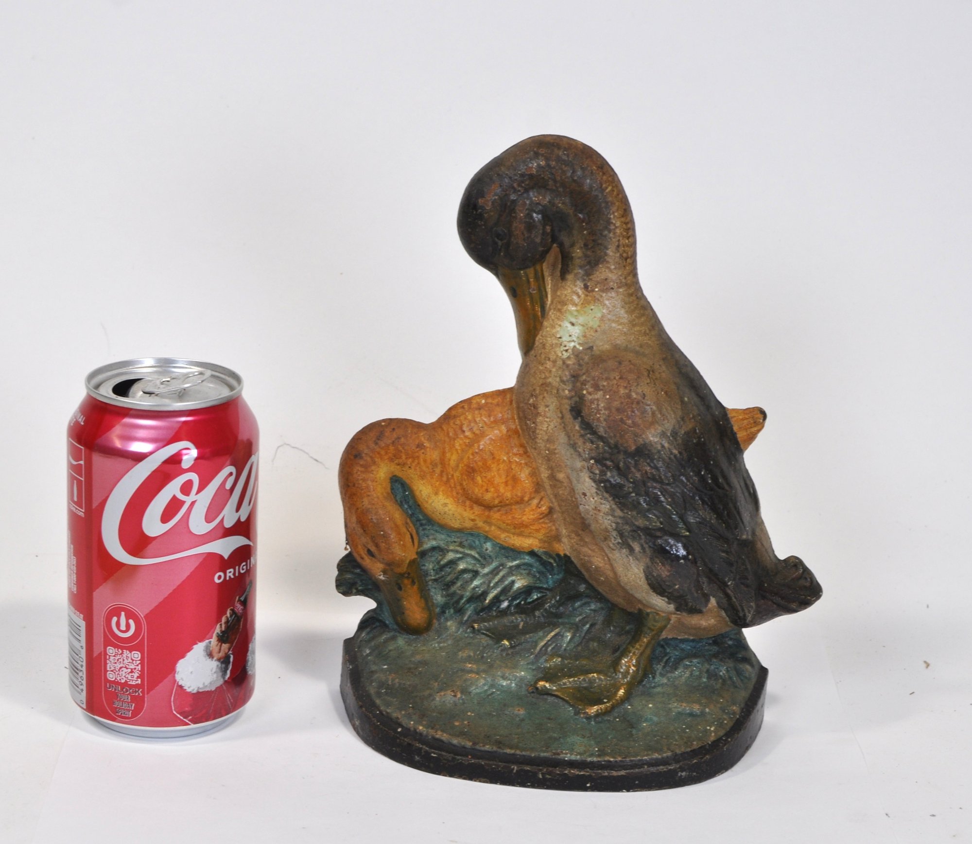 Offered is an antique cast iron duck doorstop, produced by the Hubley Toy Company, identified as Model No. 291. The doorstop depicts a duck standing protectively beside ducklings, modeled in high relief and finished in original polychrome paint with natural surface wear consistent with age and use.