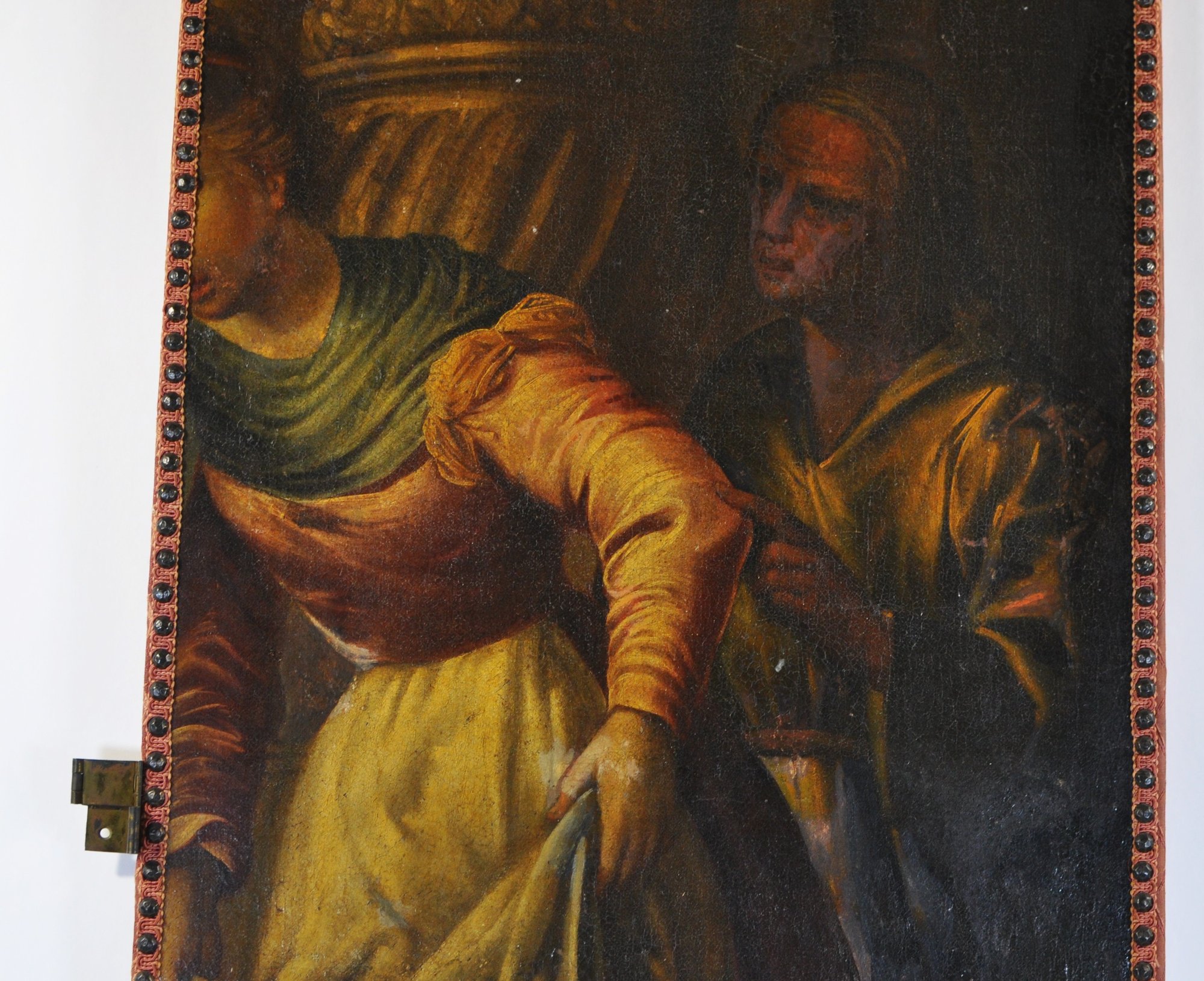 Large antique oil on canvas painted panel depicting two female figures in richly draped Baroque attire.