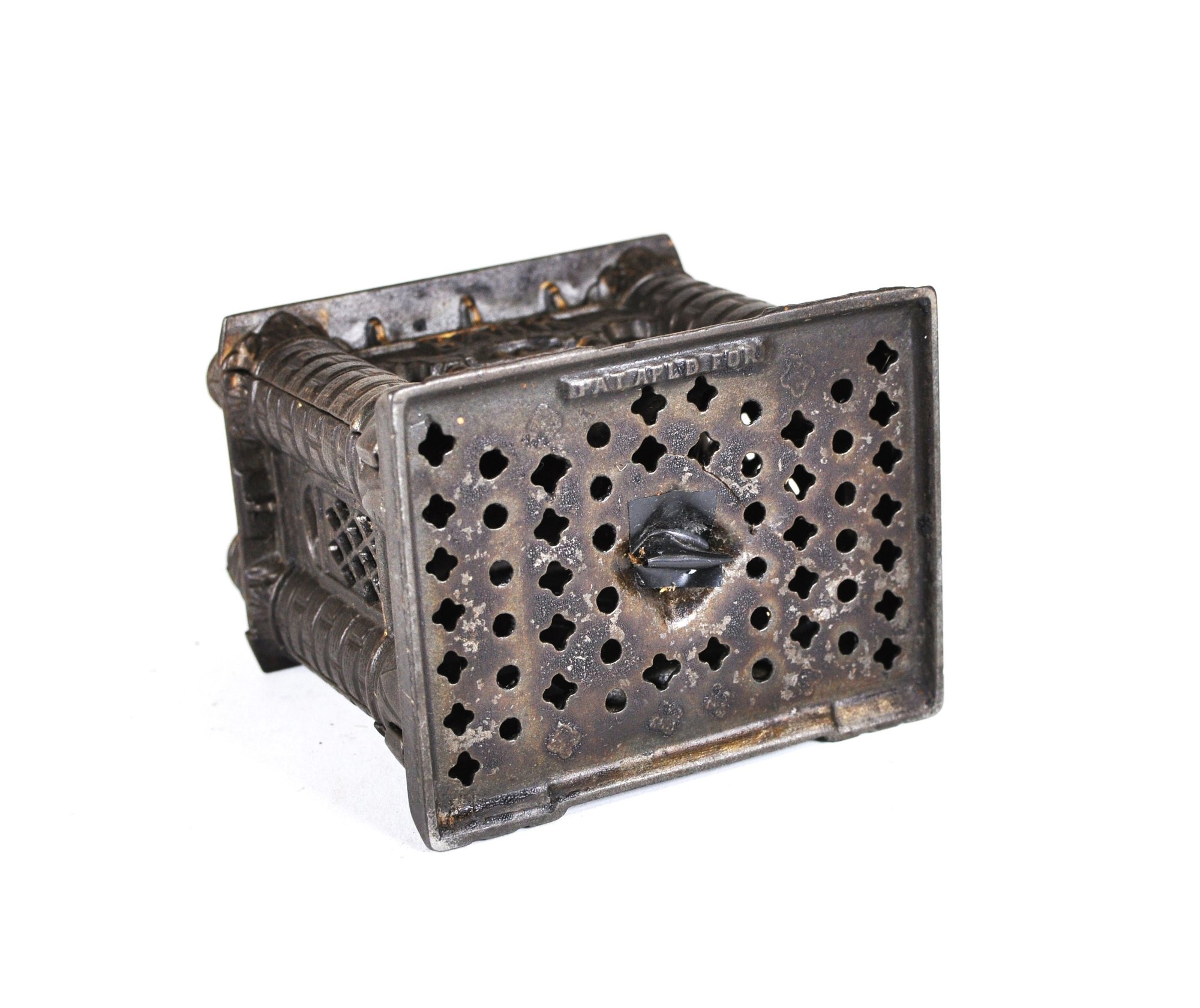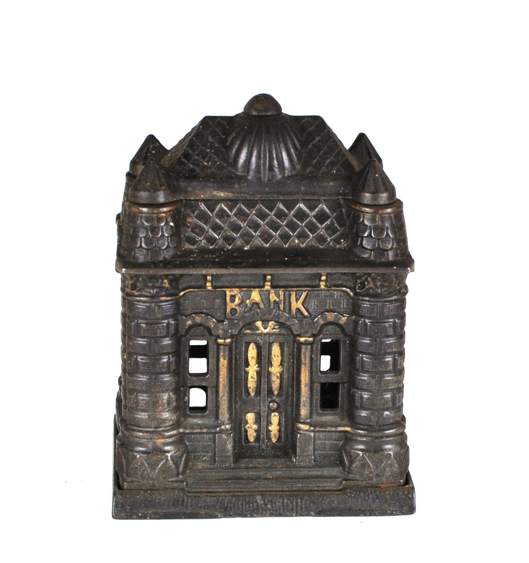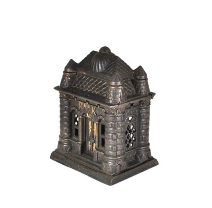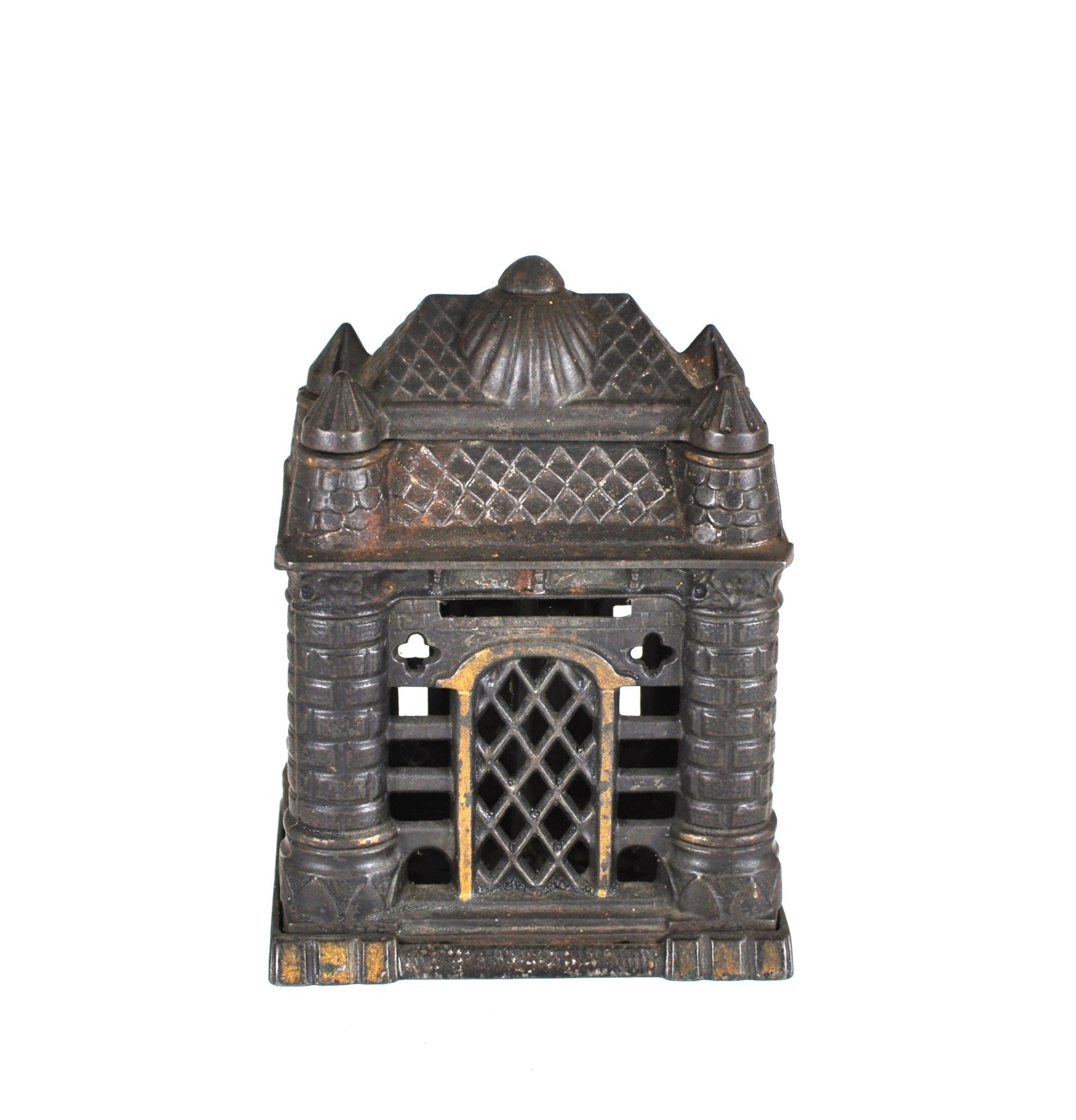 This antique Four Tower Bank Building is an original cast iron still bank produced by J&E Stevens in the United States before the patent was granted in 1895. (PAT APLD FOR).