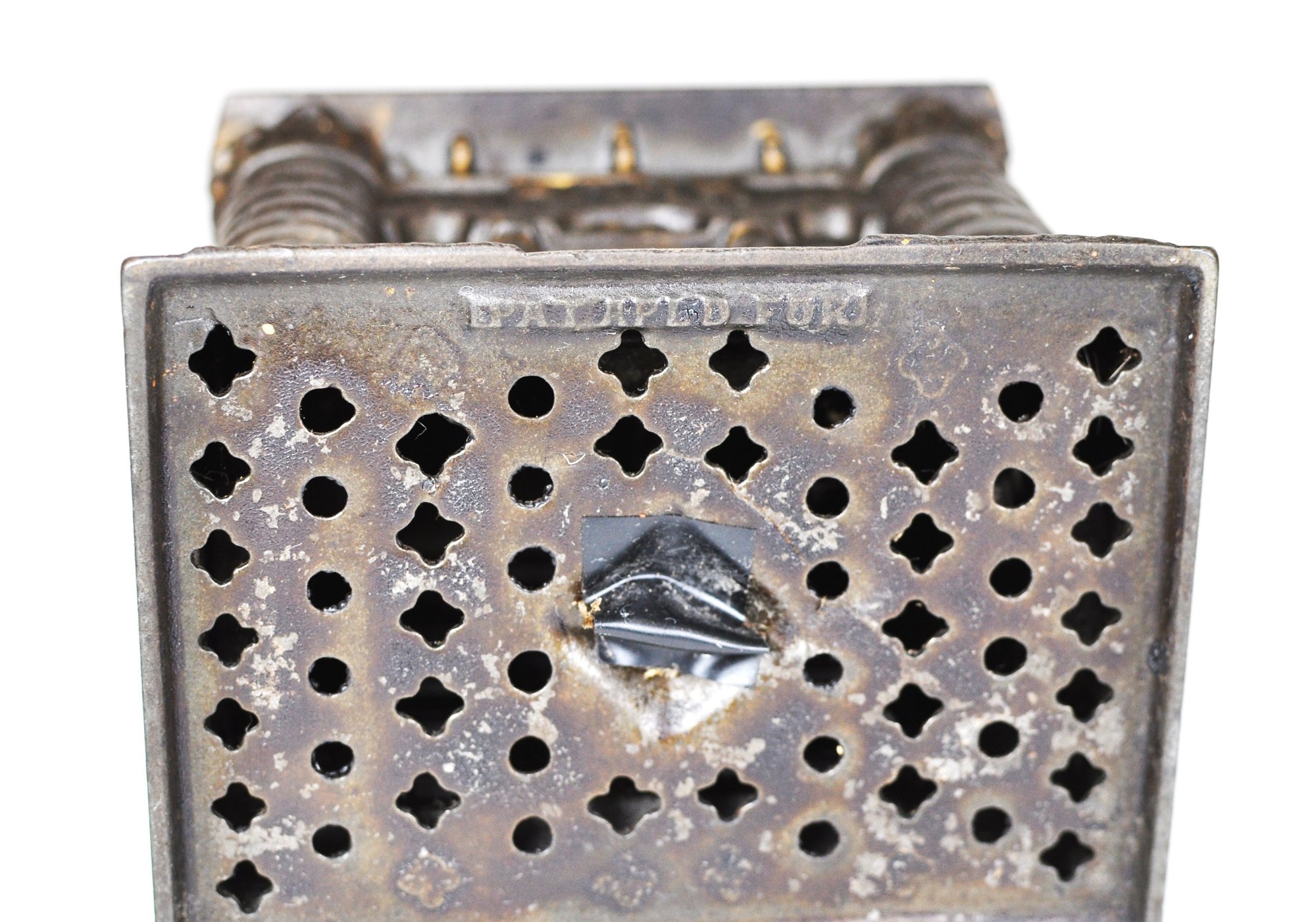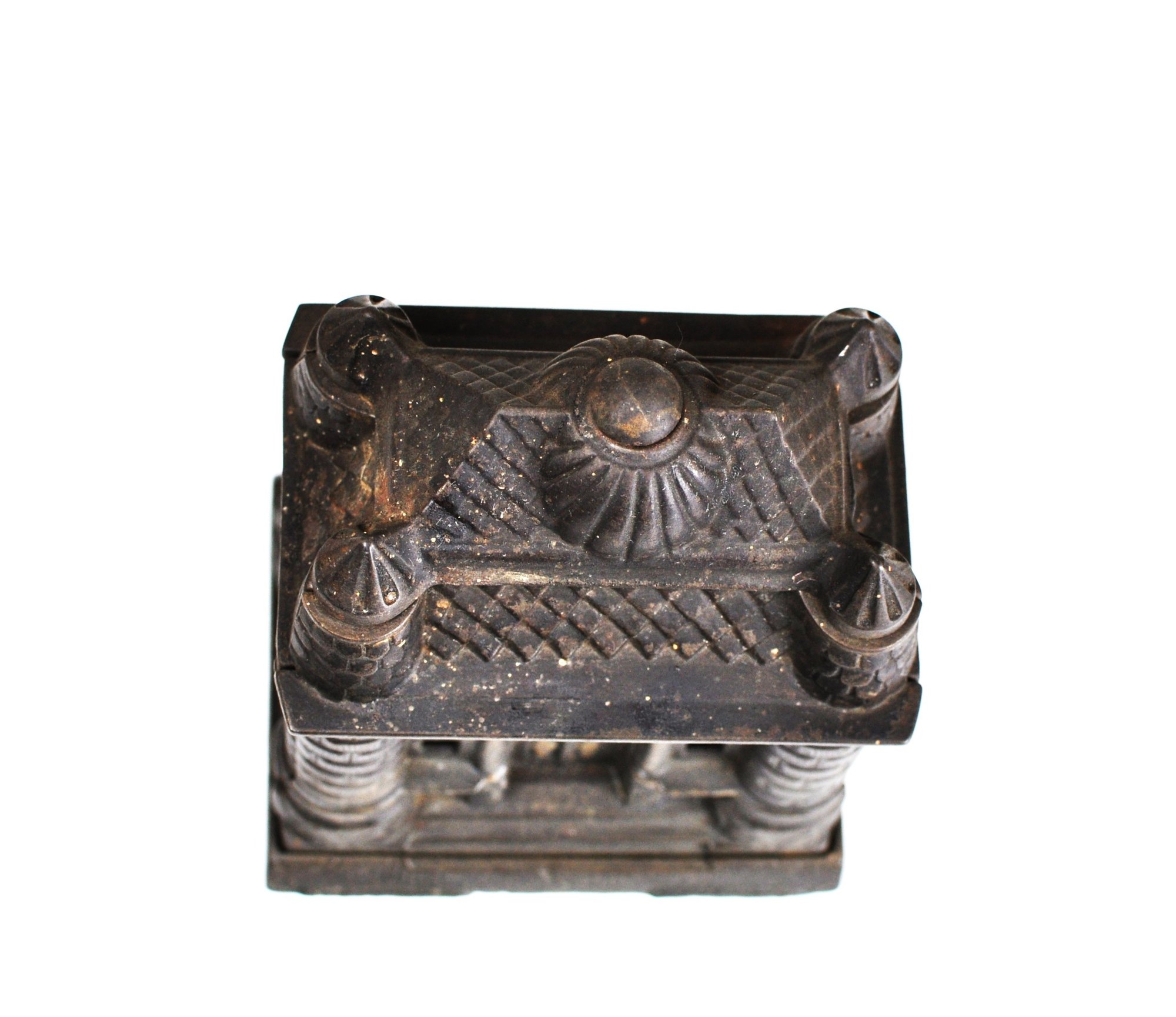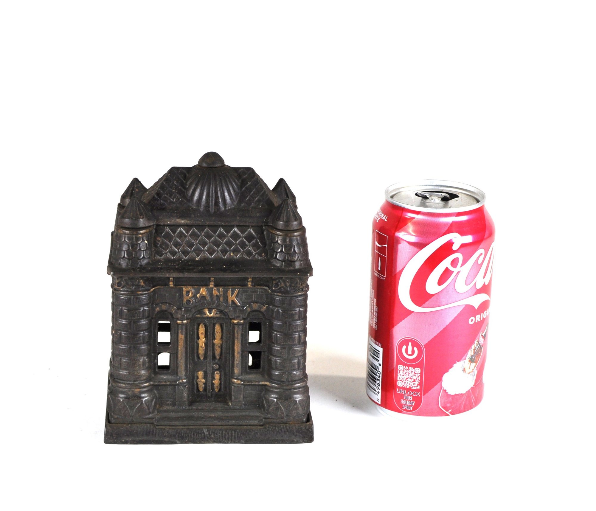 This antique Four Tower Bank Building is an original cast iron still bank produced by J&E Stevens in the United States before the patent was granted in 1895. (PAT APLD FOR).