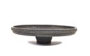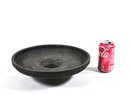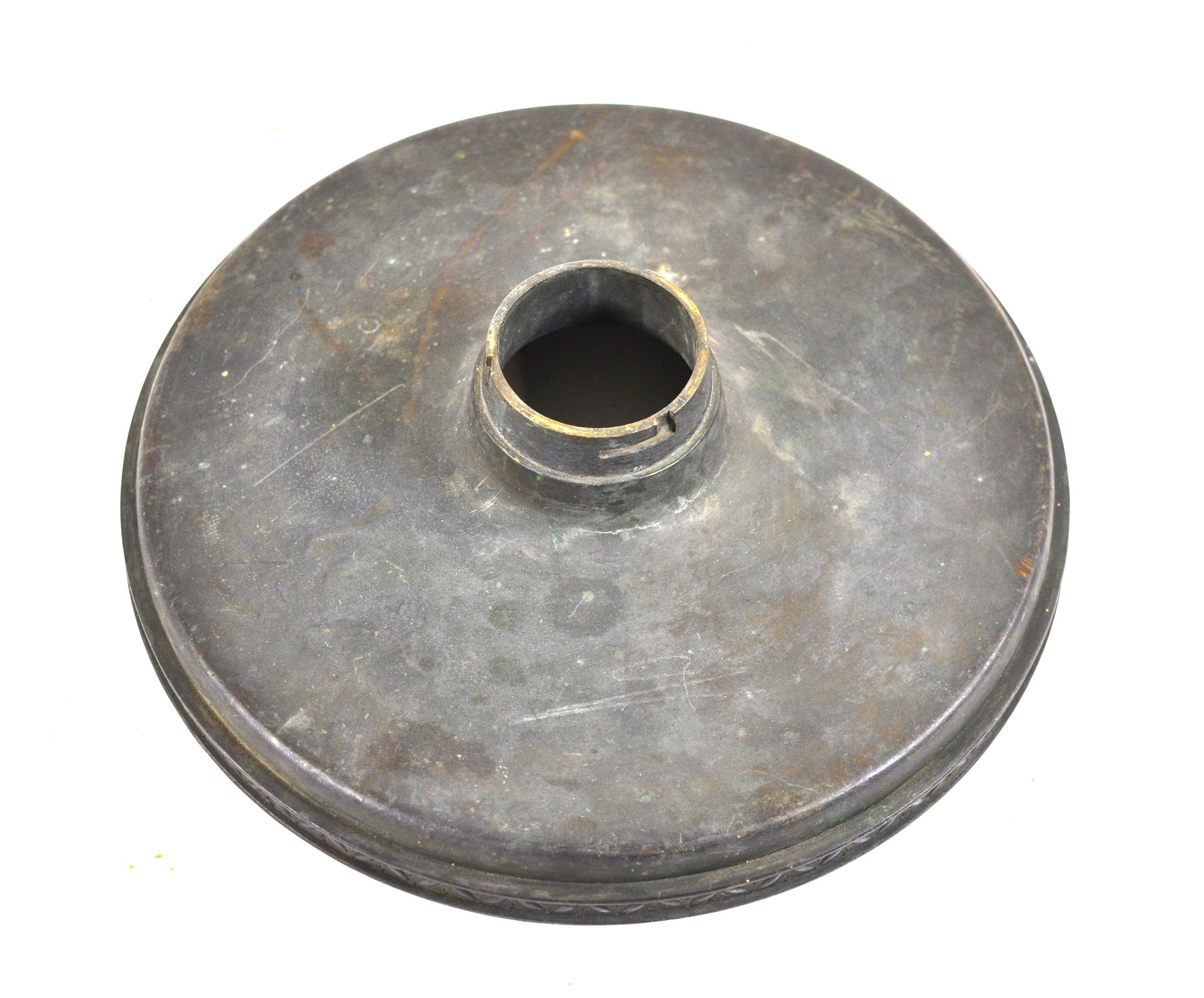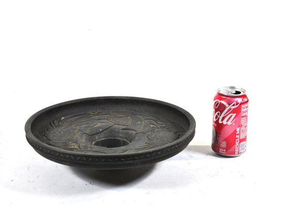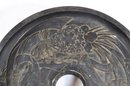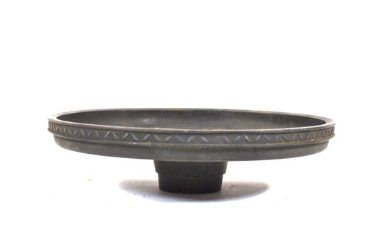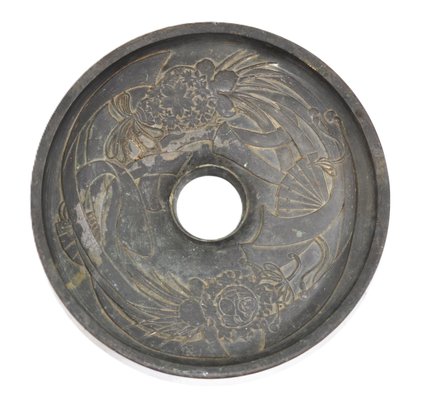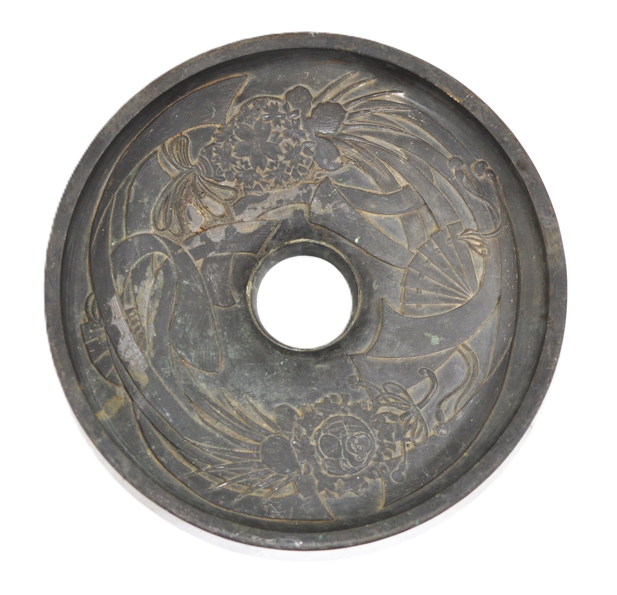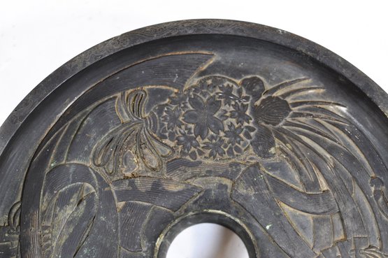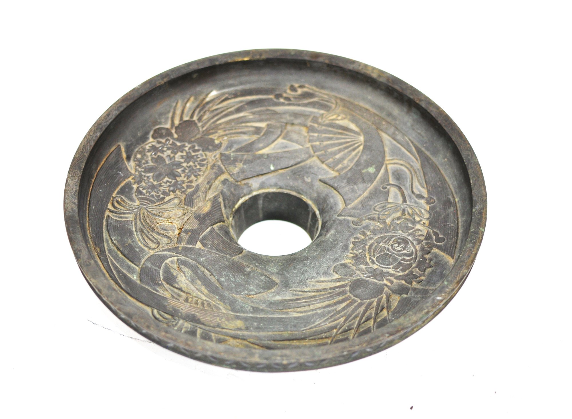 Antique Japanese solid bronze base plate or flower pot decorated with engraved bird and floral motifs. Circular form with raised rim and central socket mount. Nice aged dark patina throughout, probably late 19th to early 20th century.