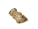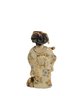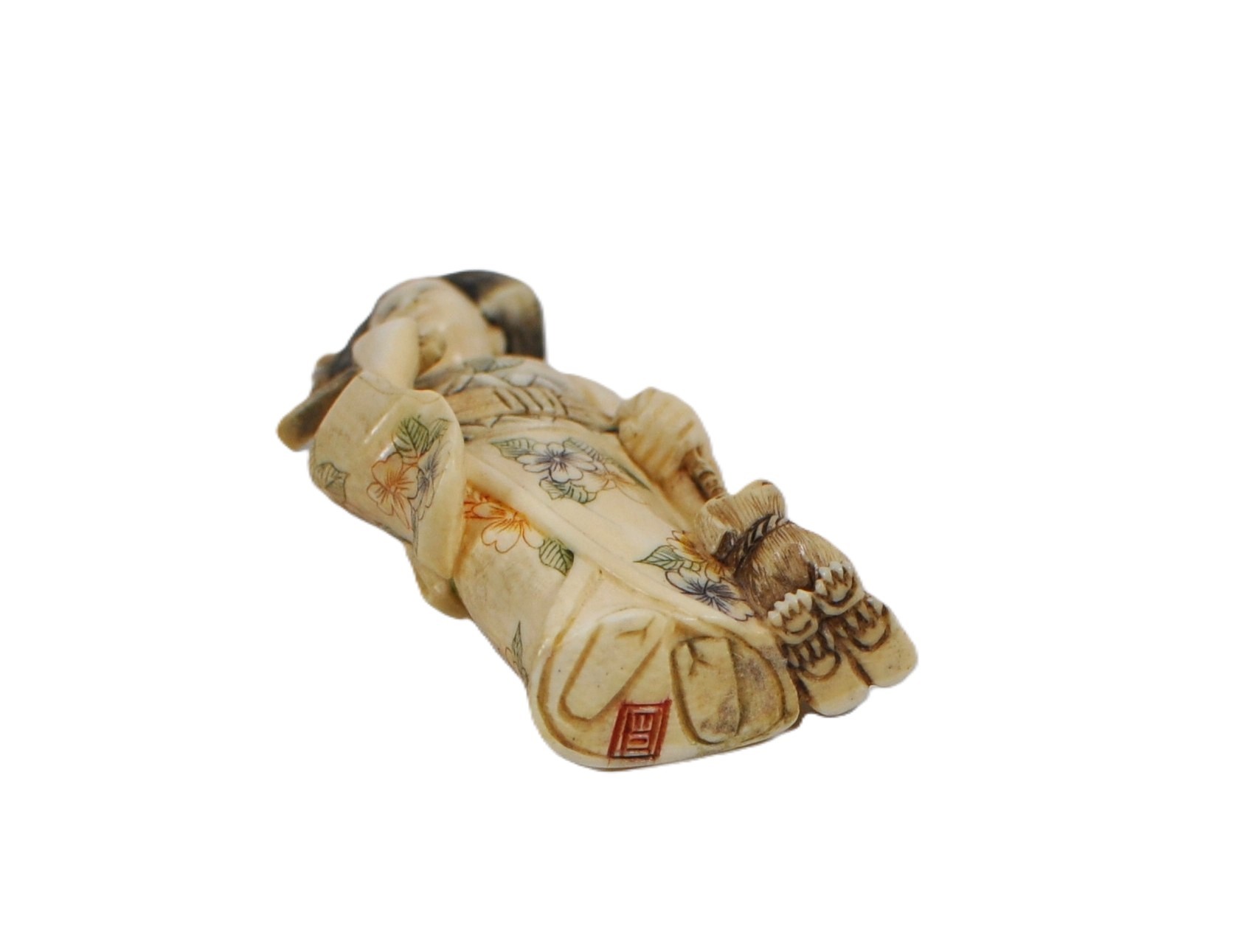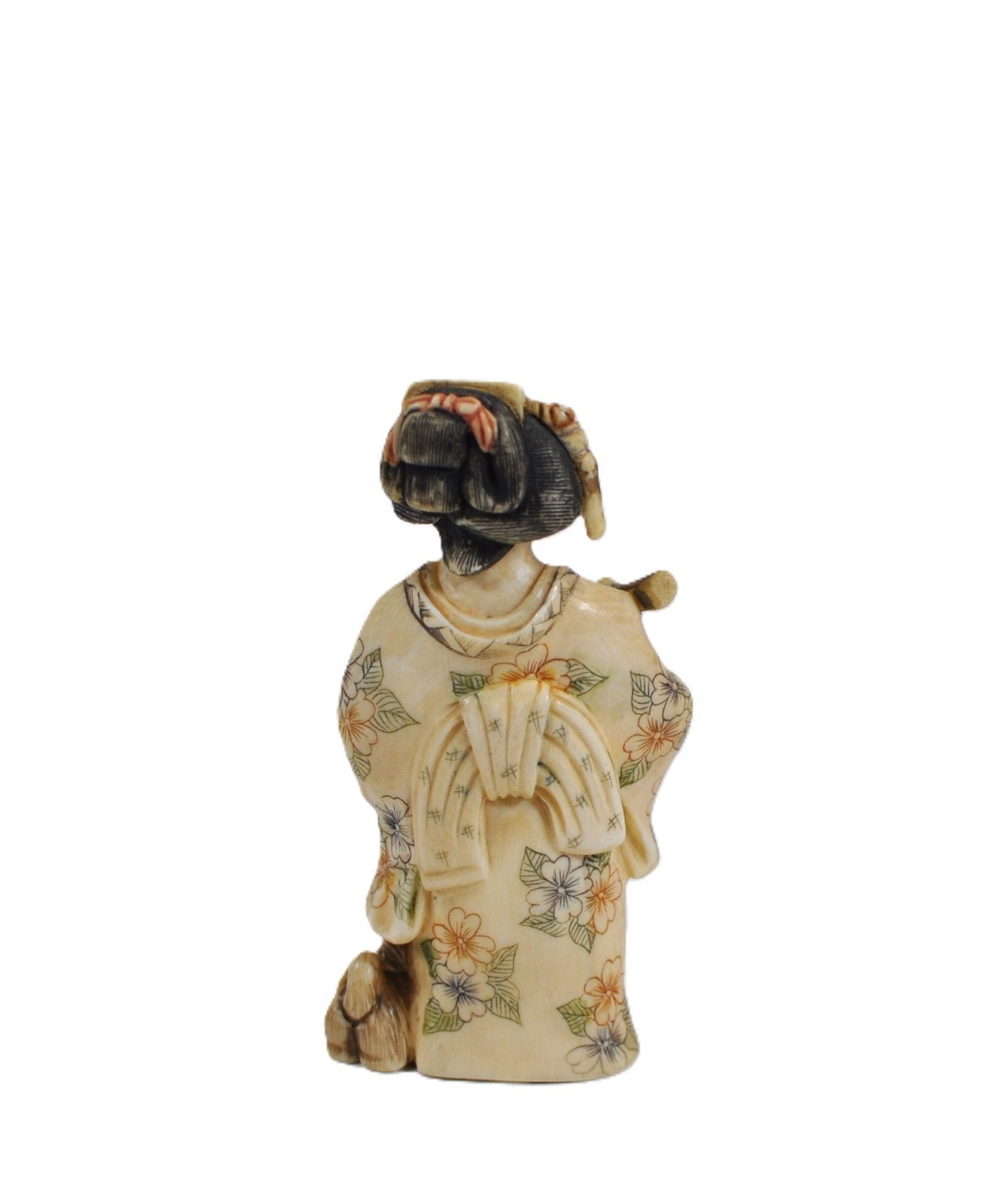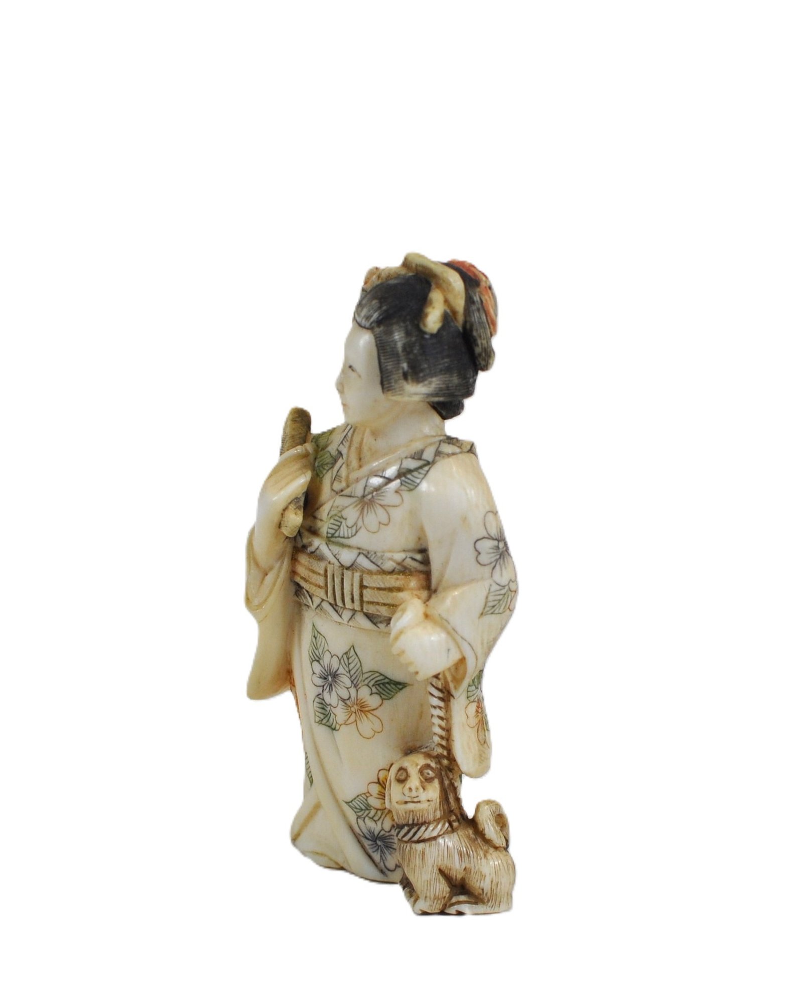 Antique Japanese carved bone figurine depicting a standing woman in a floral kimono, accompanied by a small dog at her side. Finely incised and inked decoration throughout, with painted details to the hair and robe. The underside bears a red seal mark.