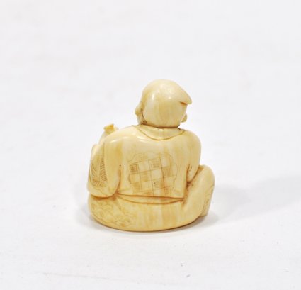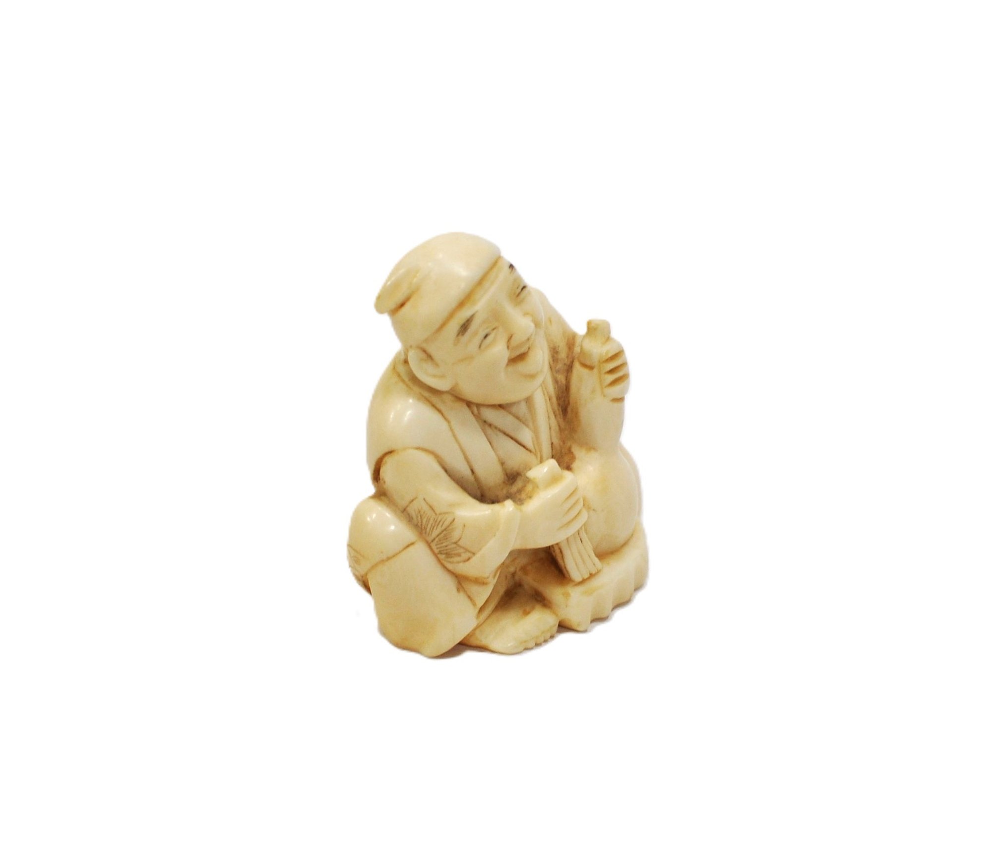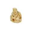 Nicely carved bone netsuke depicting a cheerful seated man holding a double gourd vessel, a traditional symbol of good fortune. The figure is rendered with a smiling expression and finely incised details to the robe, including geometric and foliate patterns.