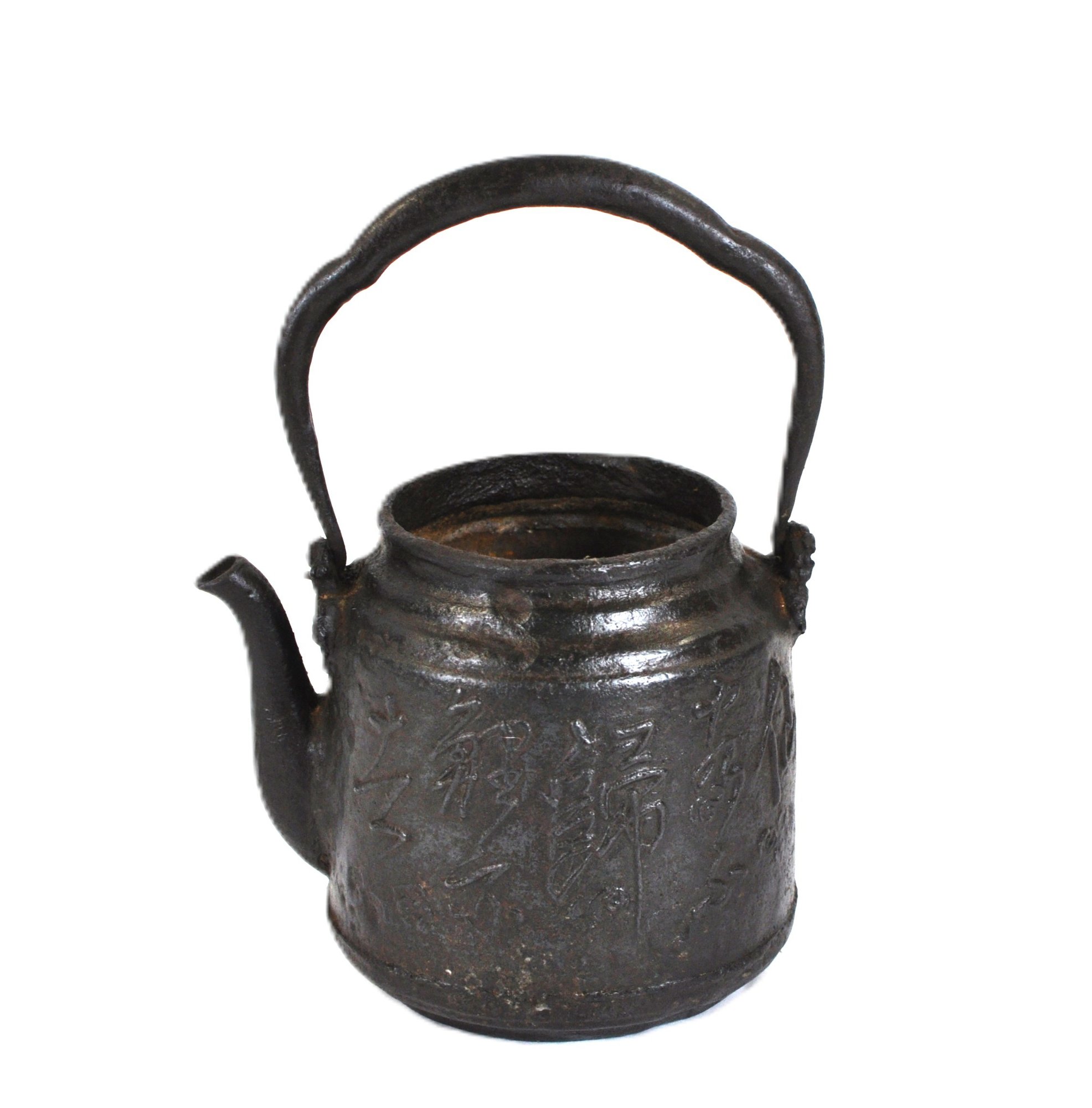 Old Japanese cast-iron water kettle featuring raised calligraphic characters around the body and a hand-forged swing handle. The piece has a wonderful aged patina with surface wear and oxidation consistent with its age and use. Lid is missing. Interior shows rust as expected for antique iron vessels.