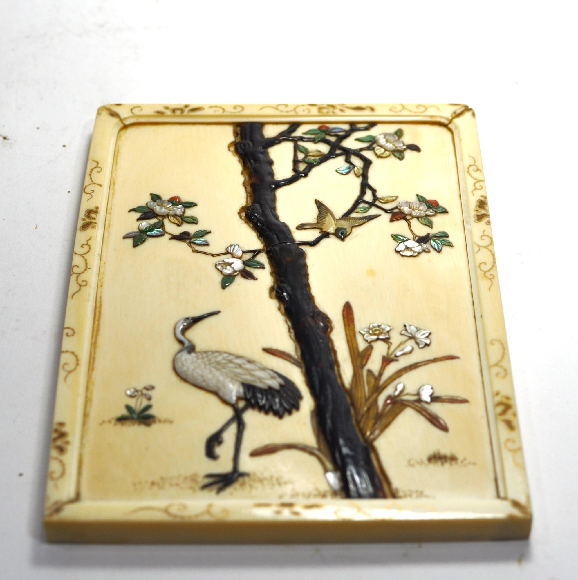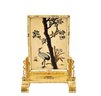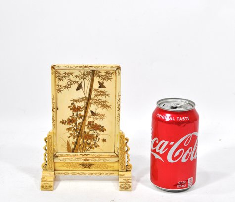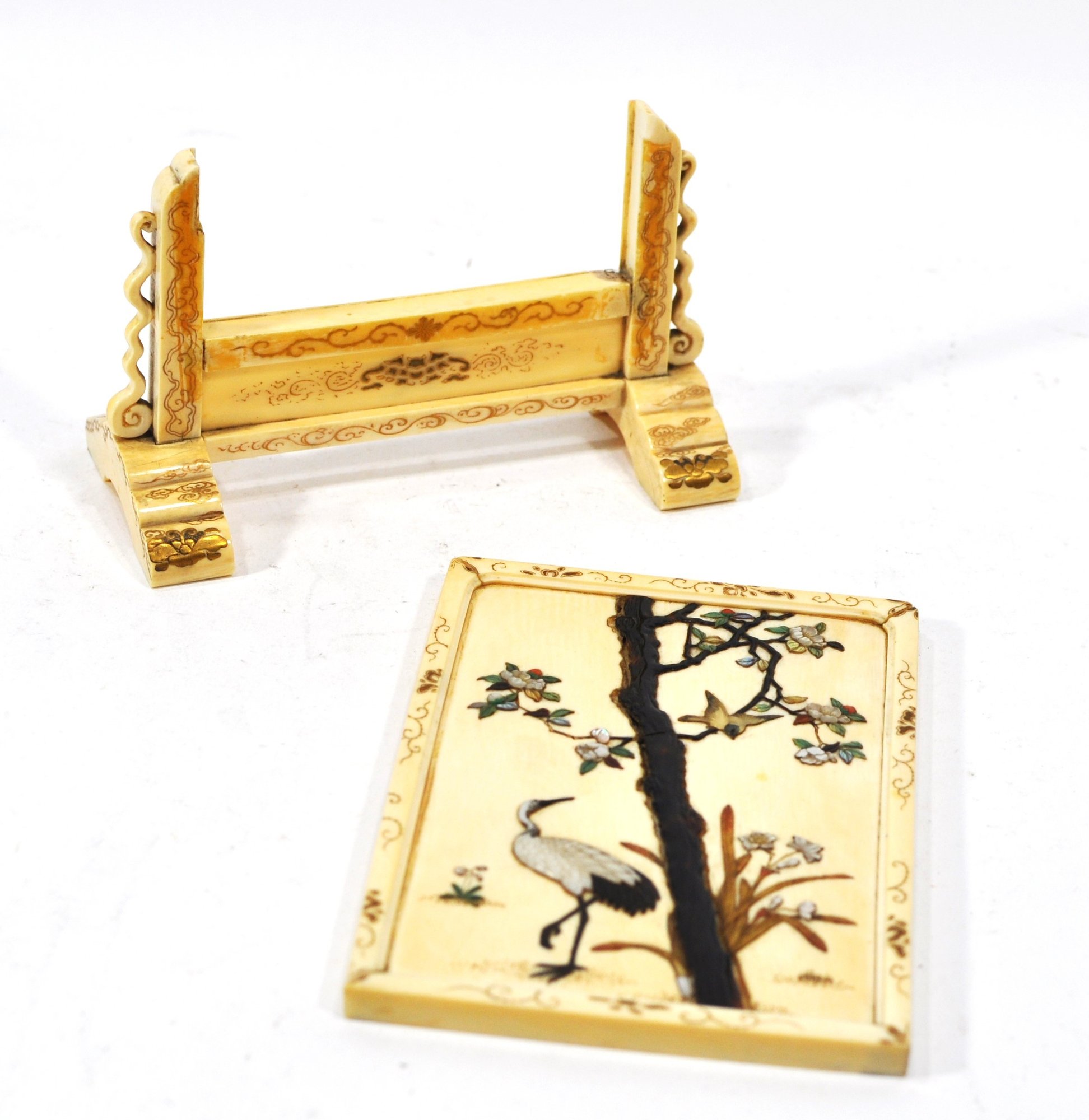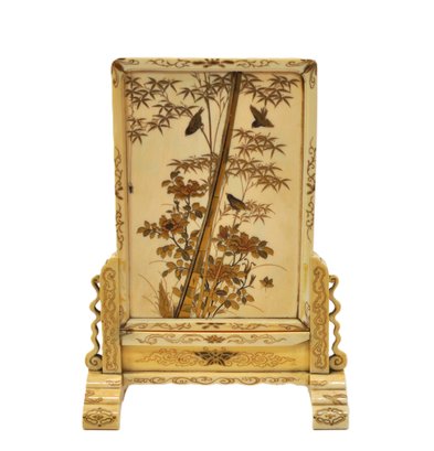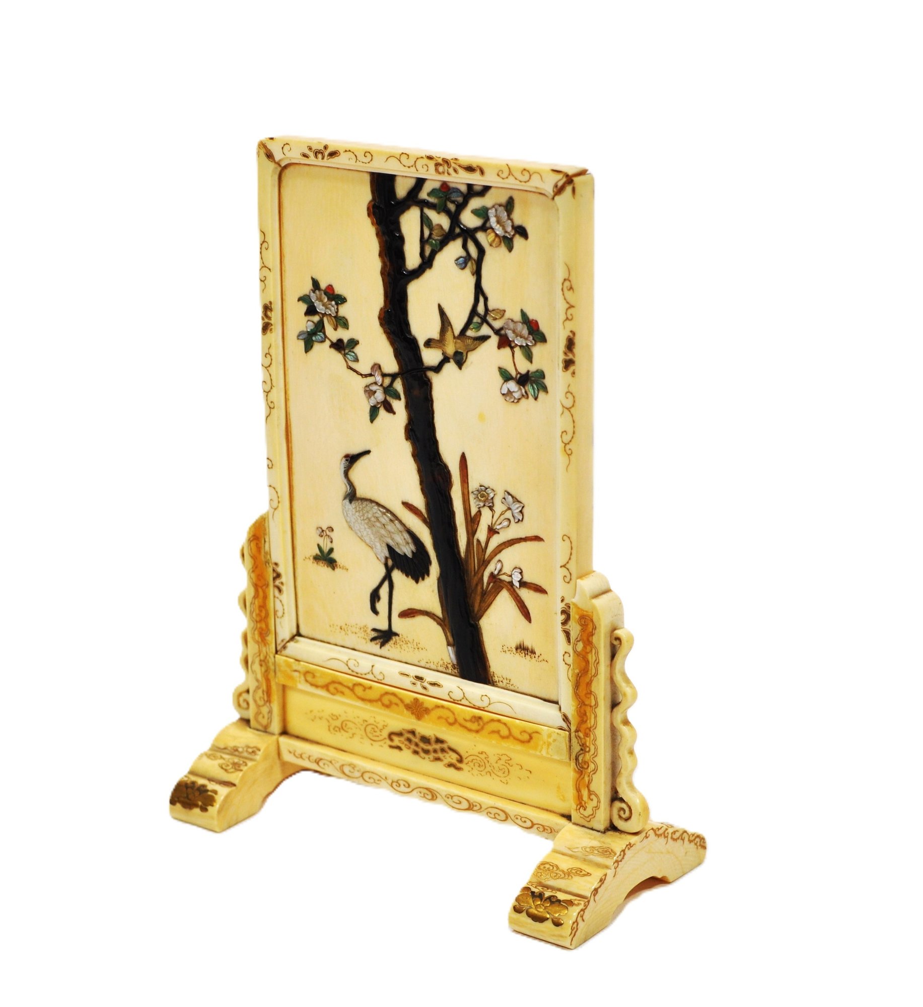 Exquisite Meiji-era Japanese table screen featuring intricate Shibayama inlay of birds, cranes, and flowering trees in mother-of-pearl, coral, and various hardstones. The finely detailed panels are mounted on an elaborately carved stand with scroll and cloud motifs.