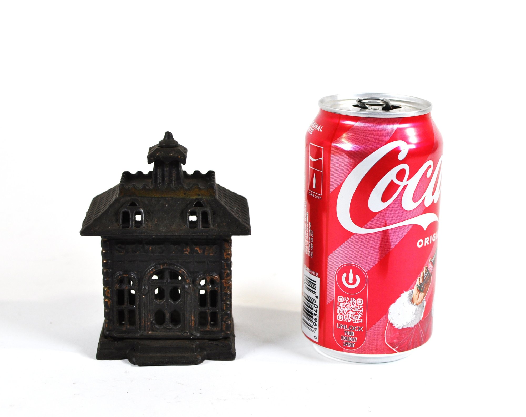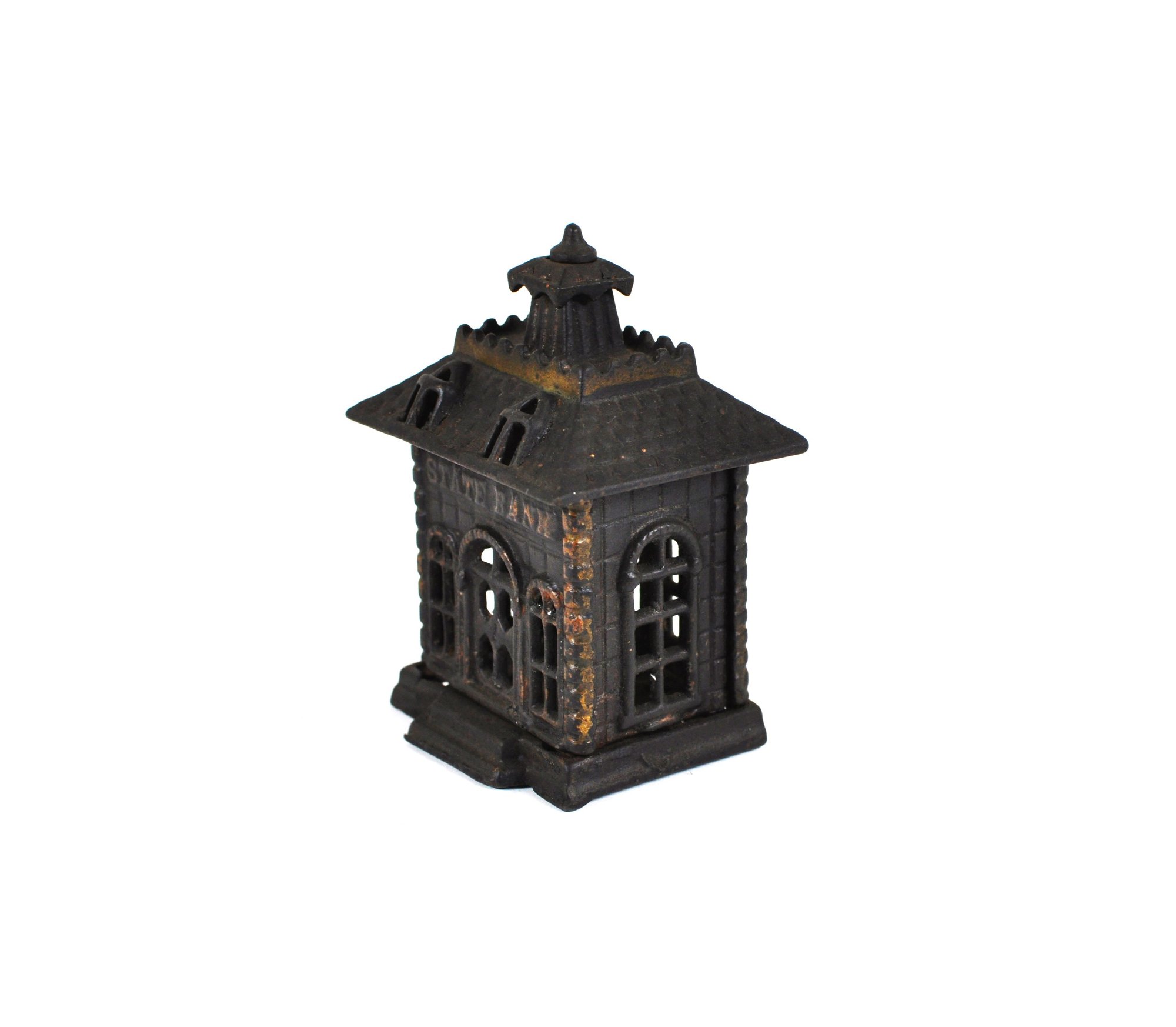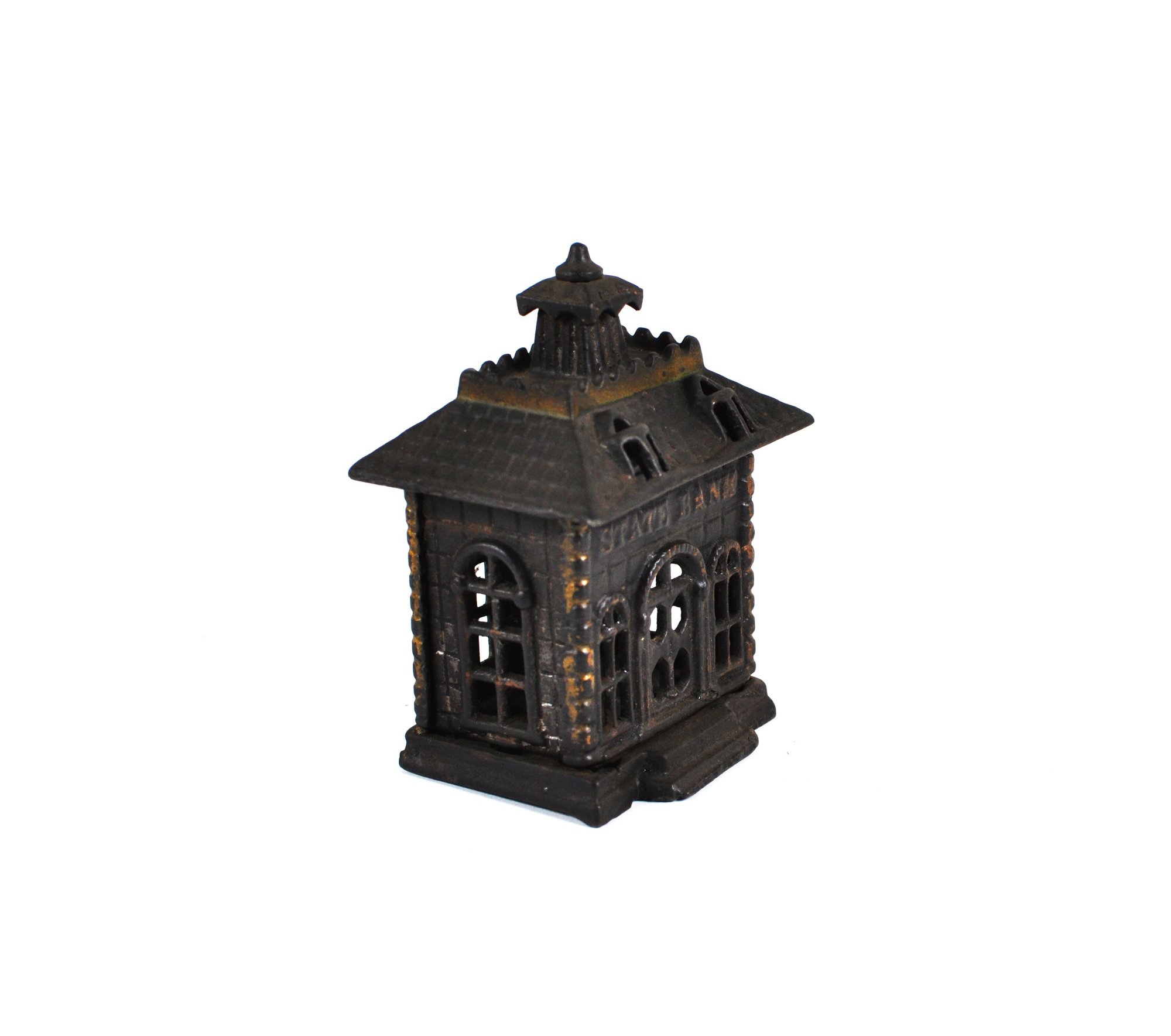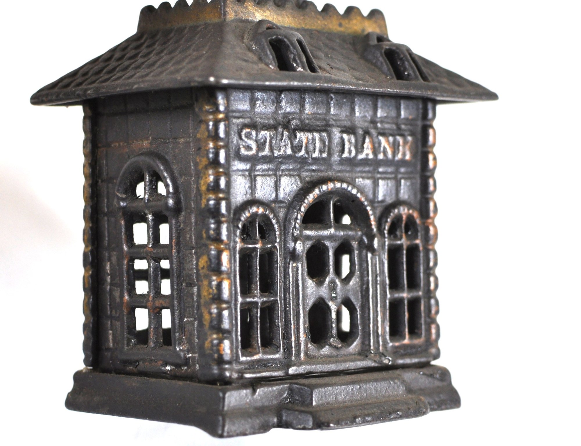 Offered is an antique cast iron still coin bank in the form of a small bank building, with raised lettering reading “STATE BANK” across the front