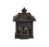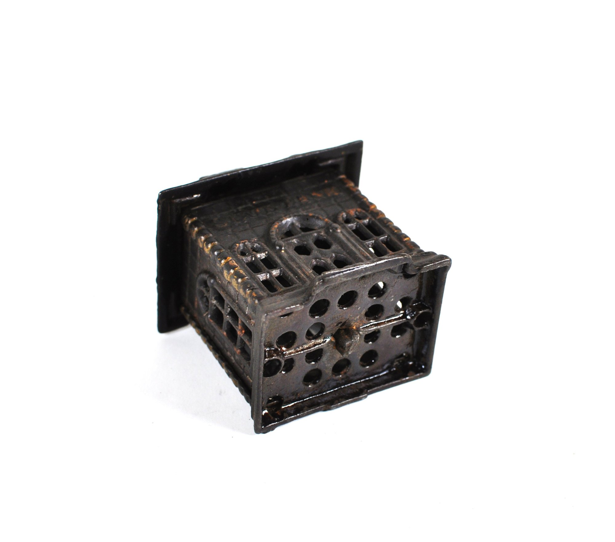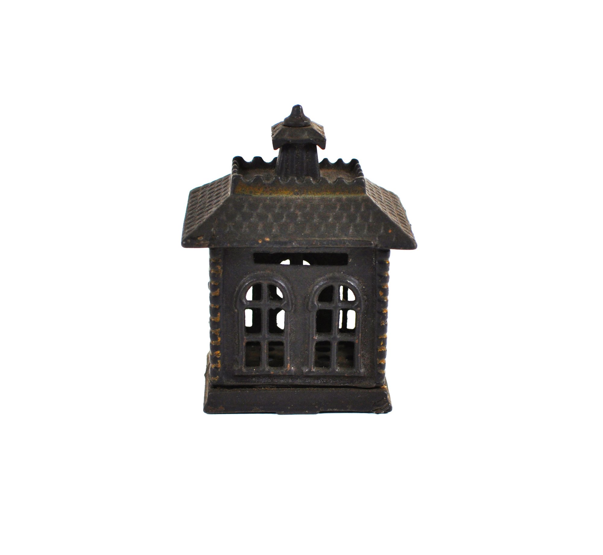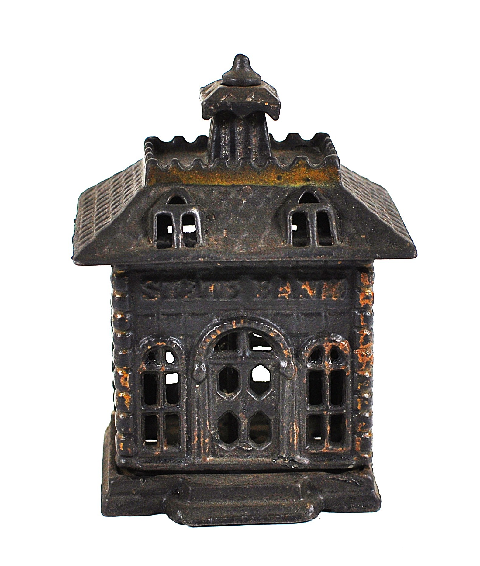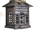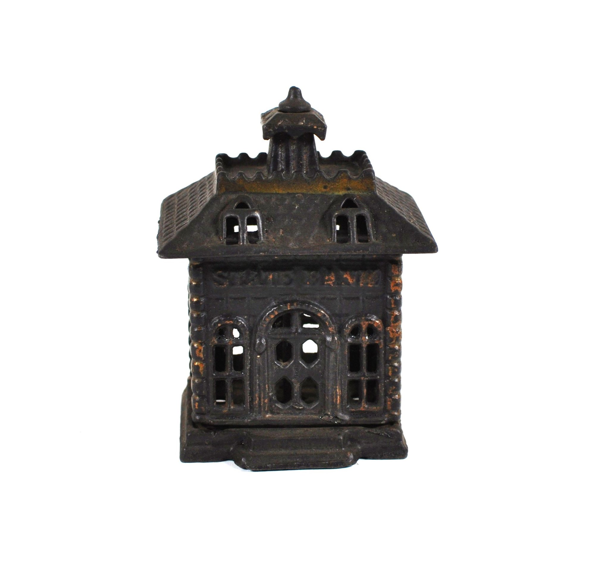 Offered is an antique cast iron still coin bank in the form of a small bank building, with raised lettering reading “STATE BANK” across the front