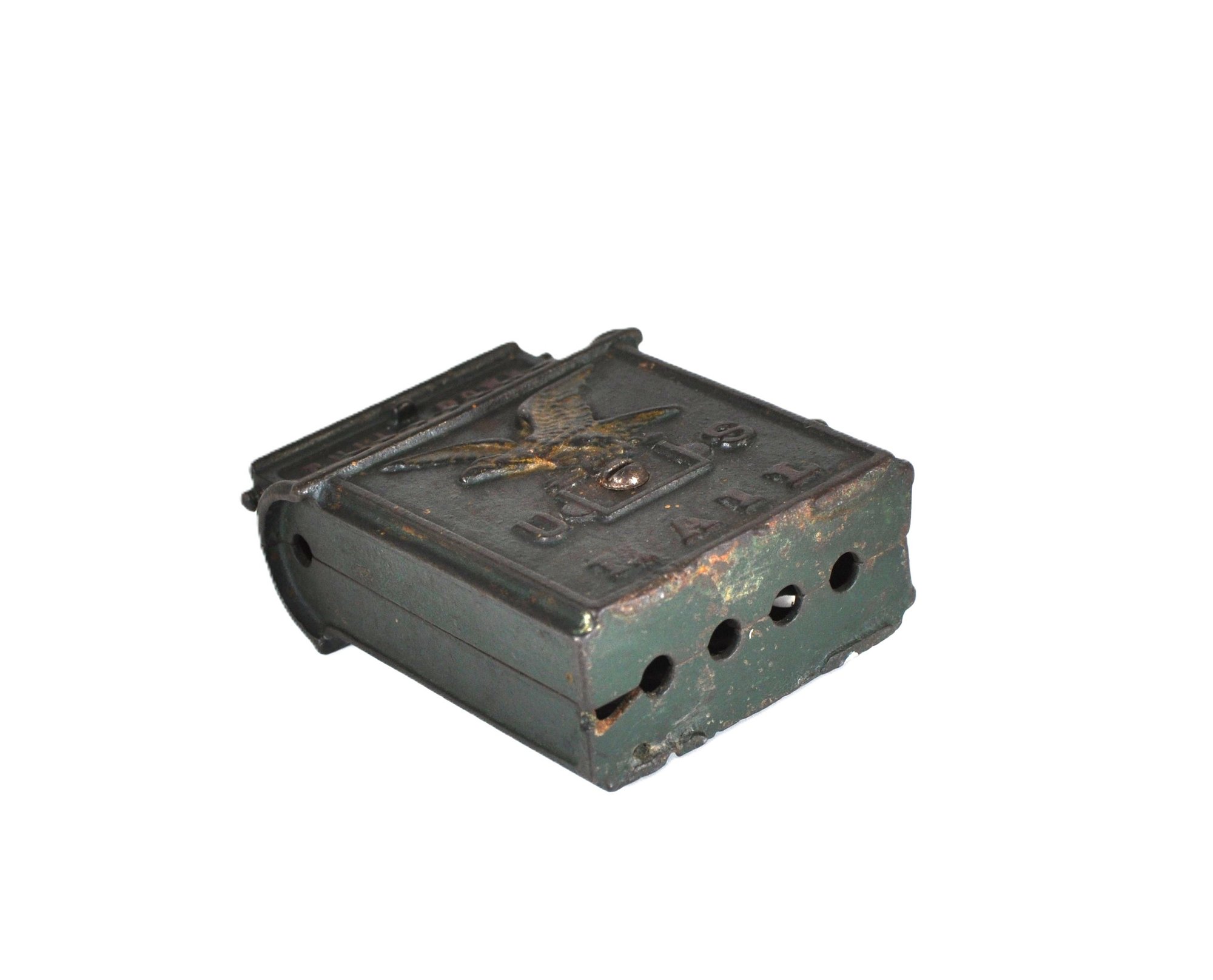 featuring a raised eagle and bold lettering. It was produced by manufacturers like Kenton and A. C. Williams, primarily between the 1900s and 1930s.