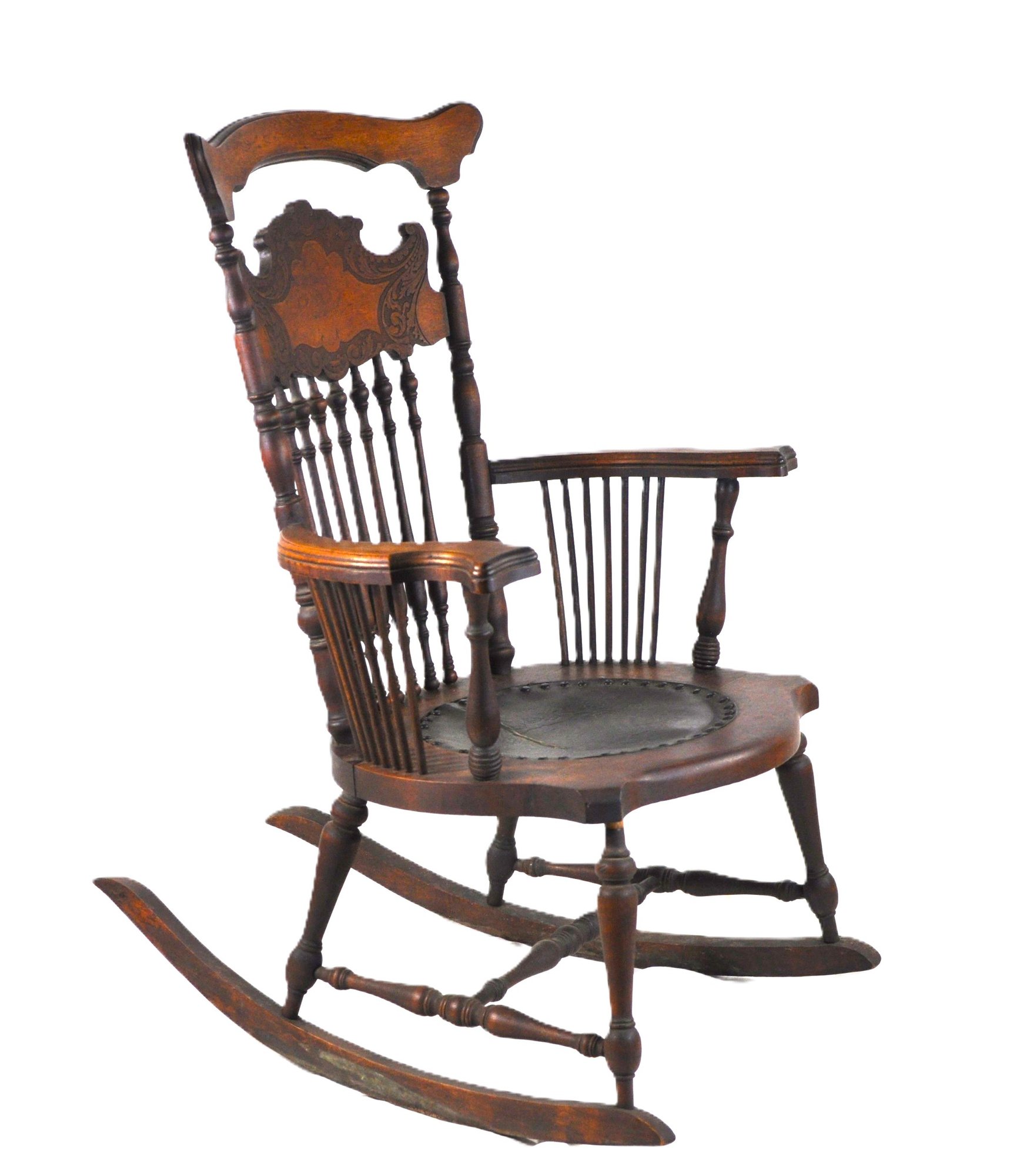 Antique pressed-back oak rocking chair with turned spindles and embossed leather seat.