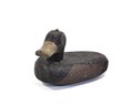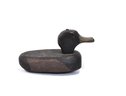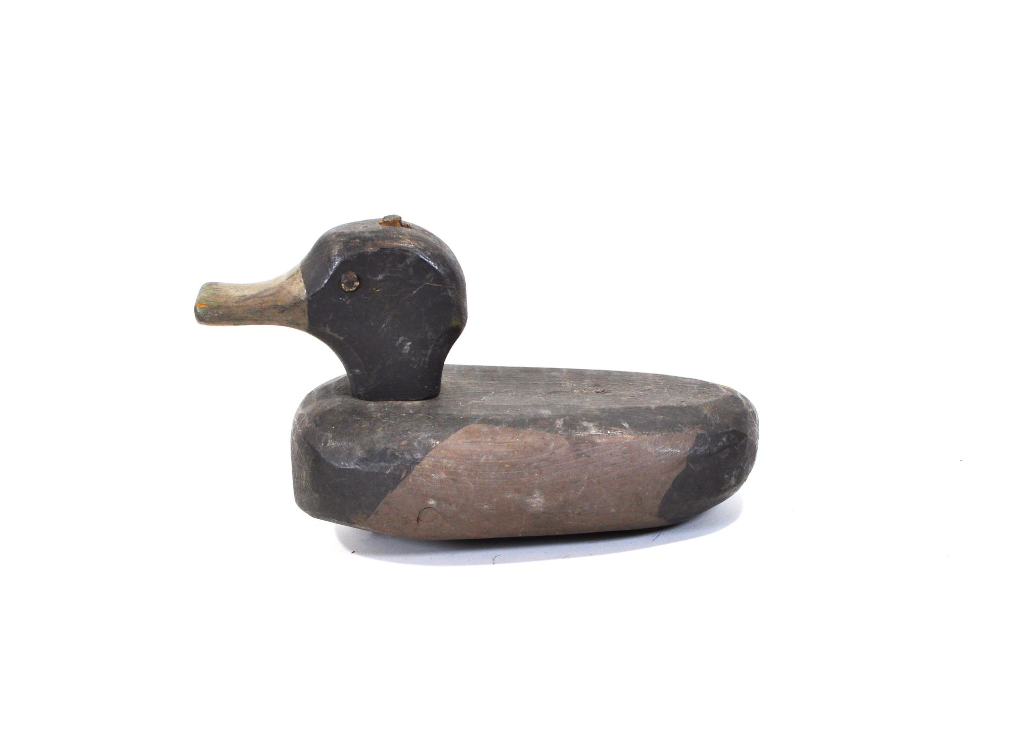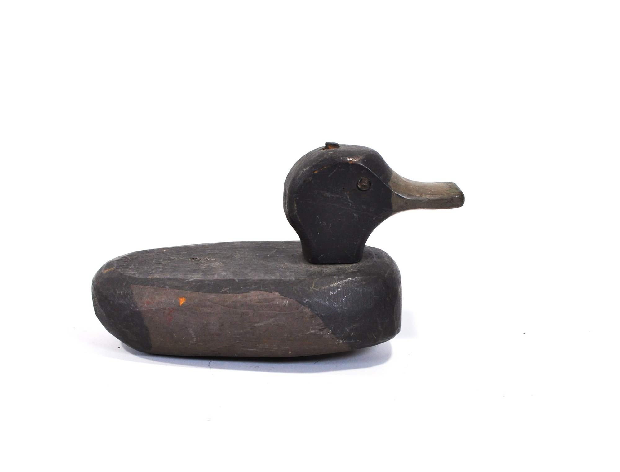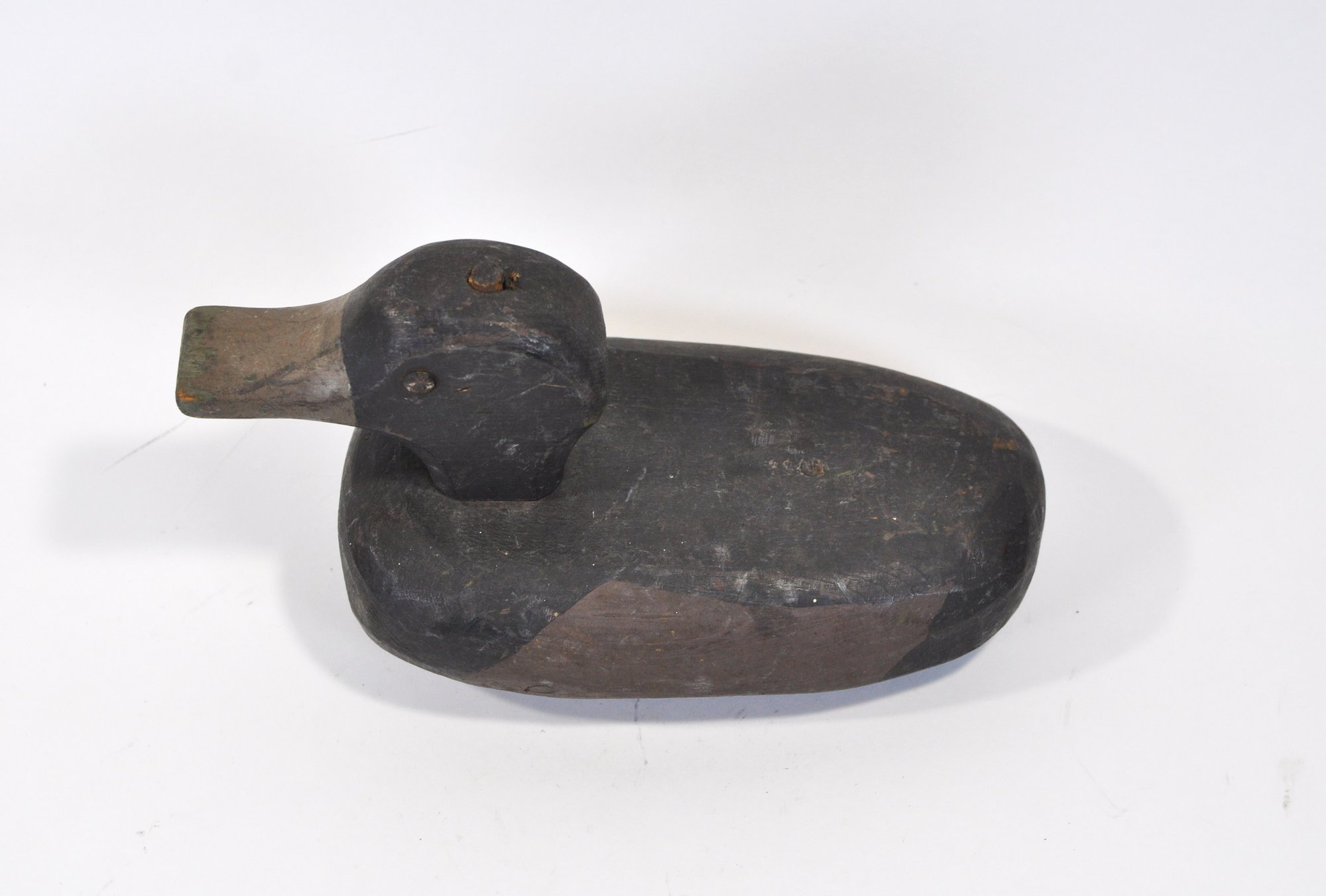Vintage hand-carved wooden duck hunting decoy featuring a simple folk-art form with carved head, elongated bill, and dark painted body. The decoy shows honest wear and working character typical of utilitarian American waterfowl decoys.