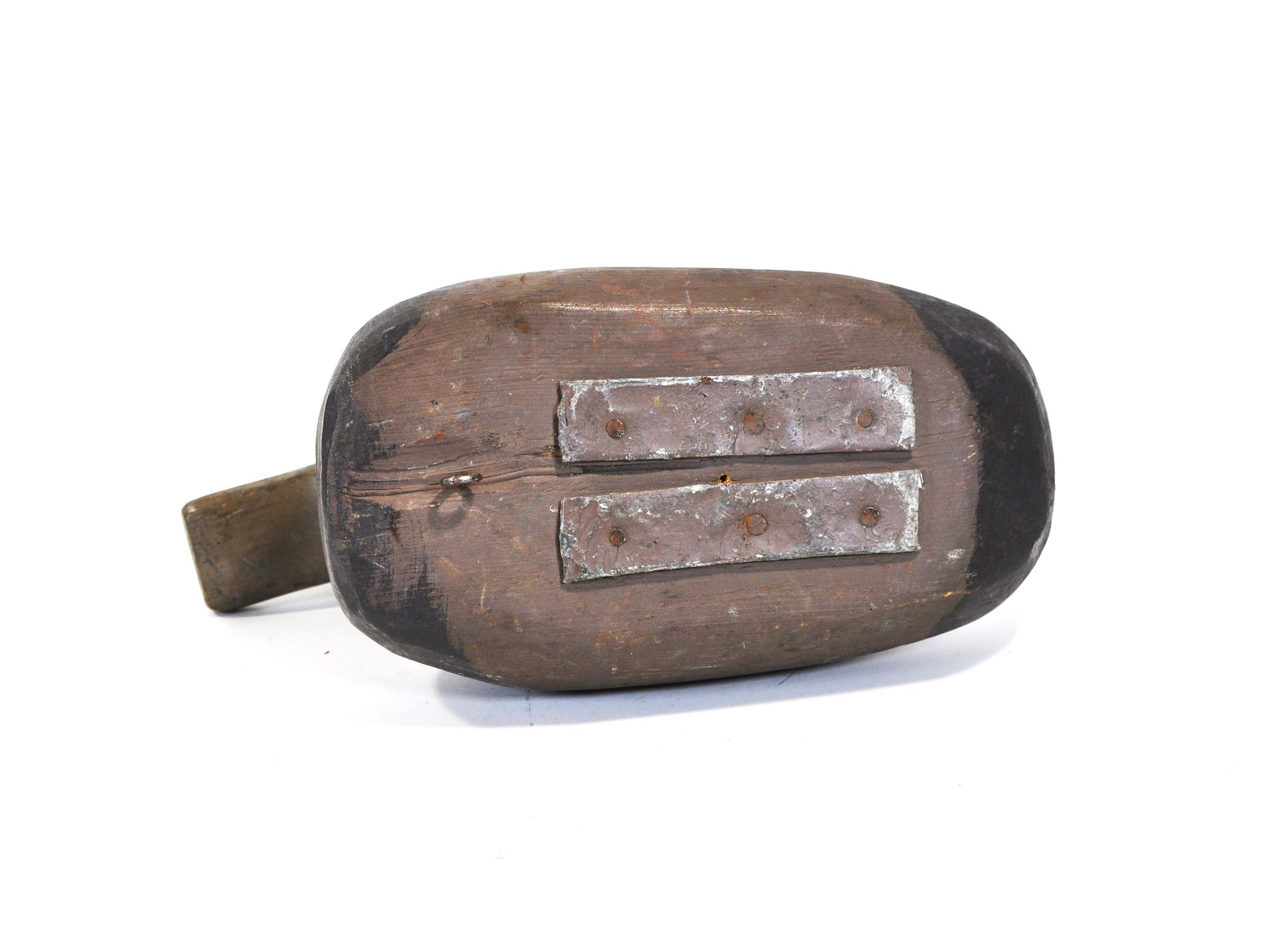 The underside retains two attached lead keel weights, indicating use as a functional hunting decoy. The body shows visible hand-carving marks and areas of worn paint, revealing the wood beneath and adding to its authentic aged appearance.