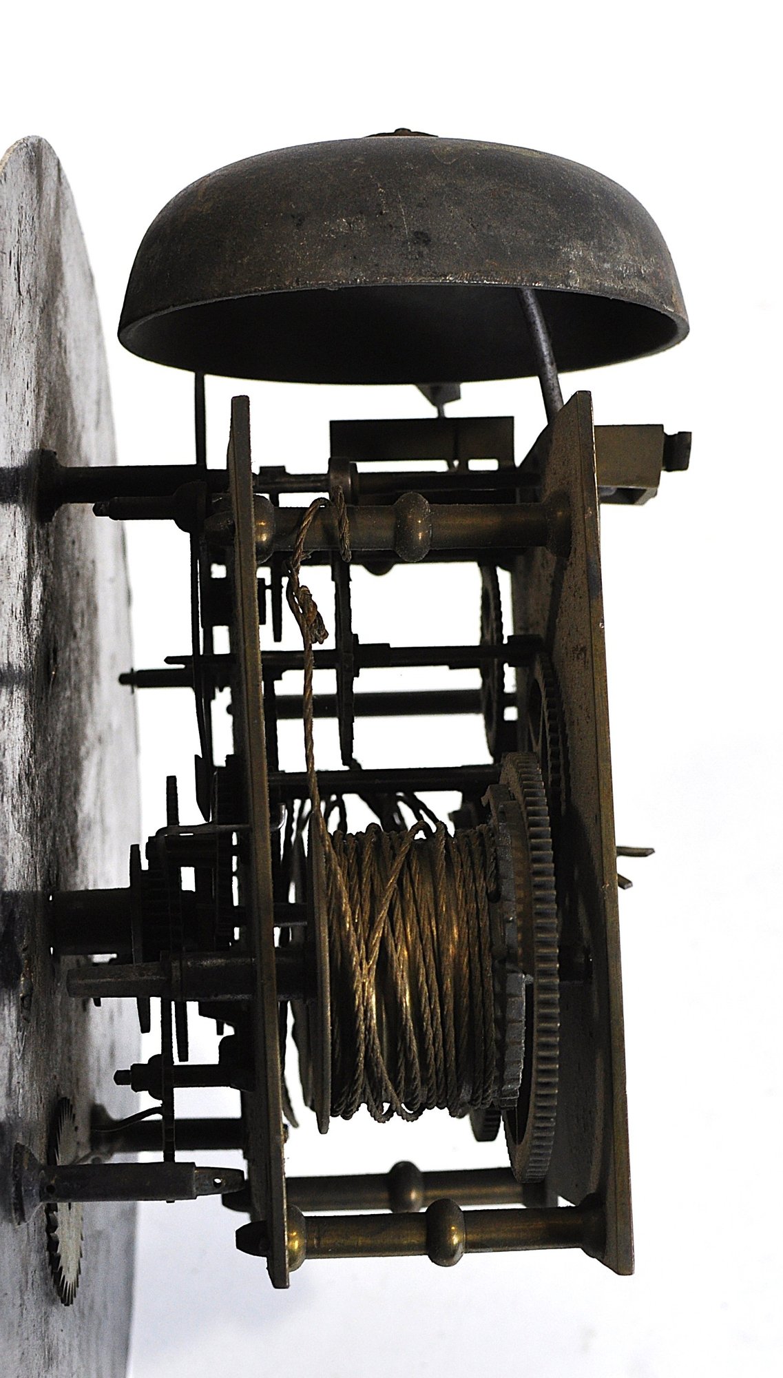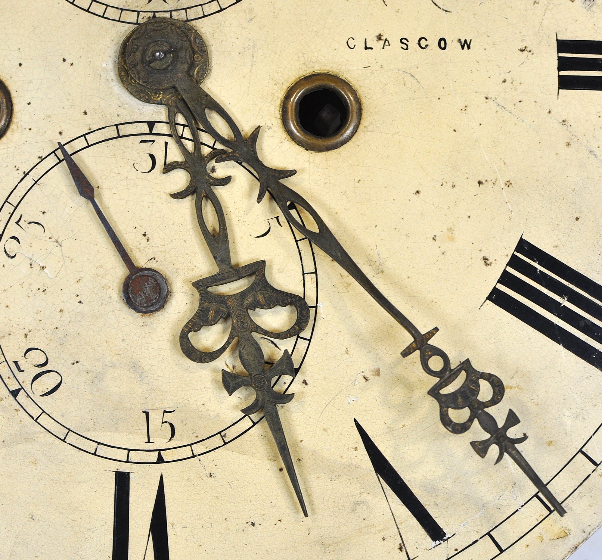 Painted metal dial with Roman numerals and subsidiary seconds dial, with brass movement, bell strike, and winding drums.
